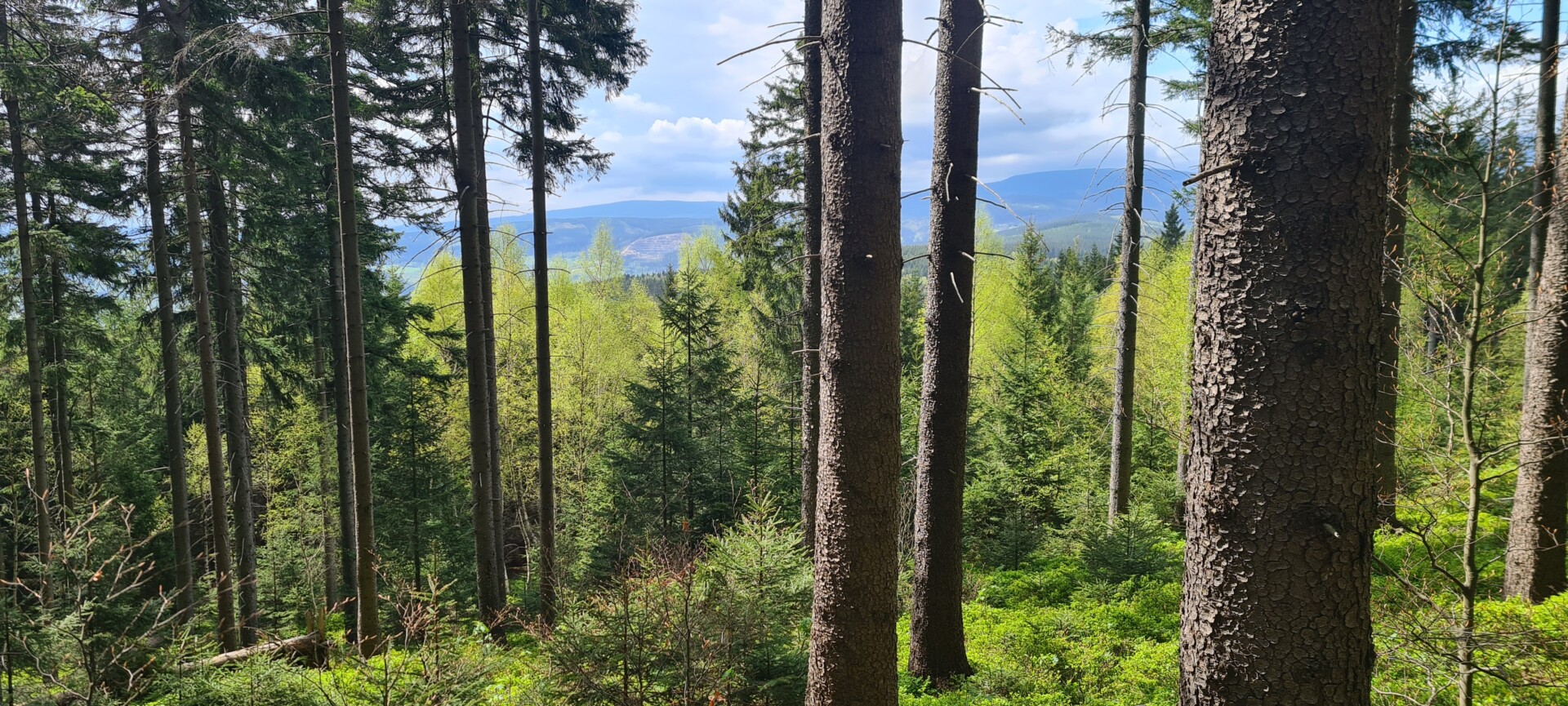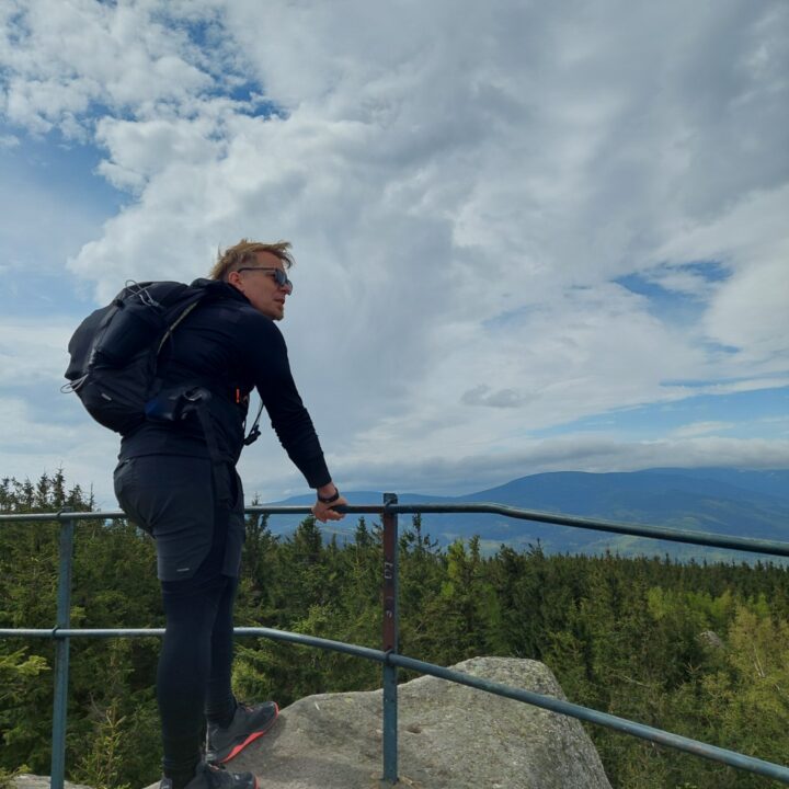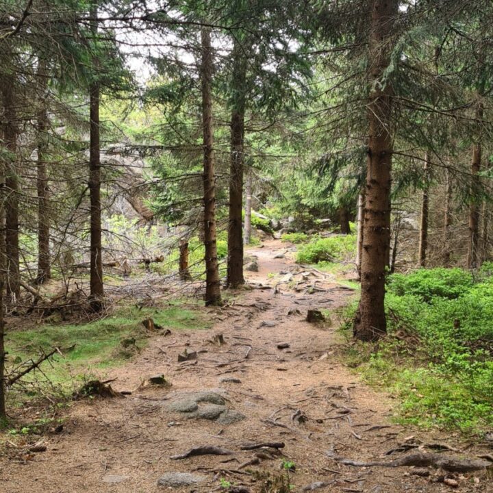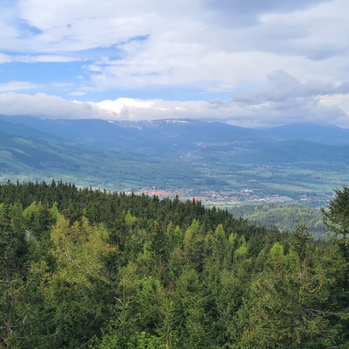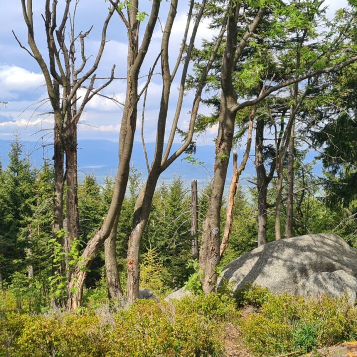 🌄 Widoki – Tylko z Ostrej Małej – warto się na nią wdrapać, bo to jedyny punkt widokowy na trasie. Panorama Karkonoszy wynagradza brak krajobrazów na reszcie szlaku.