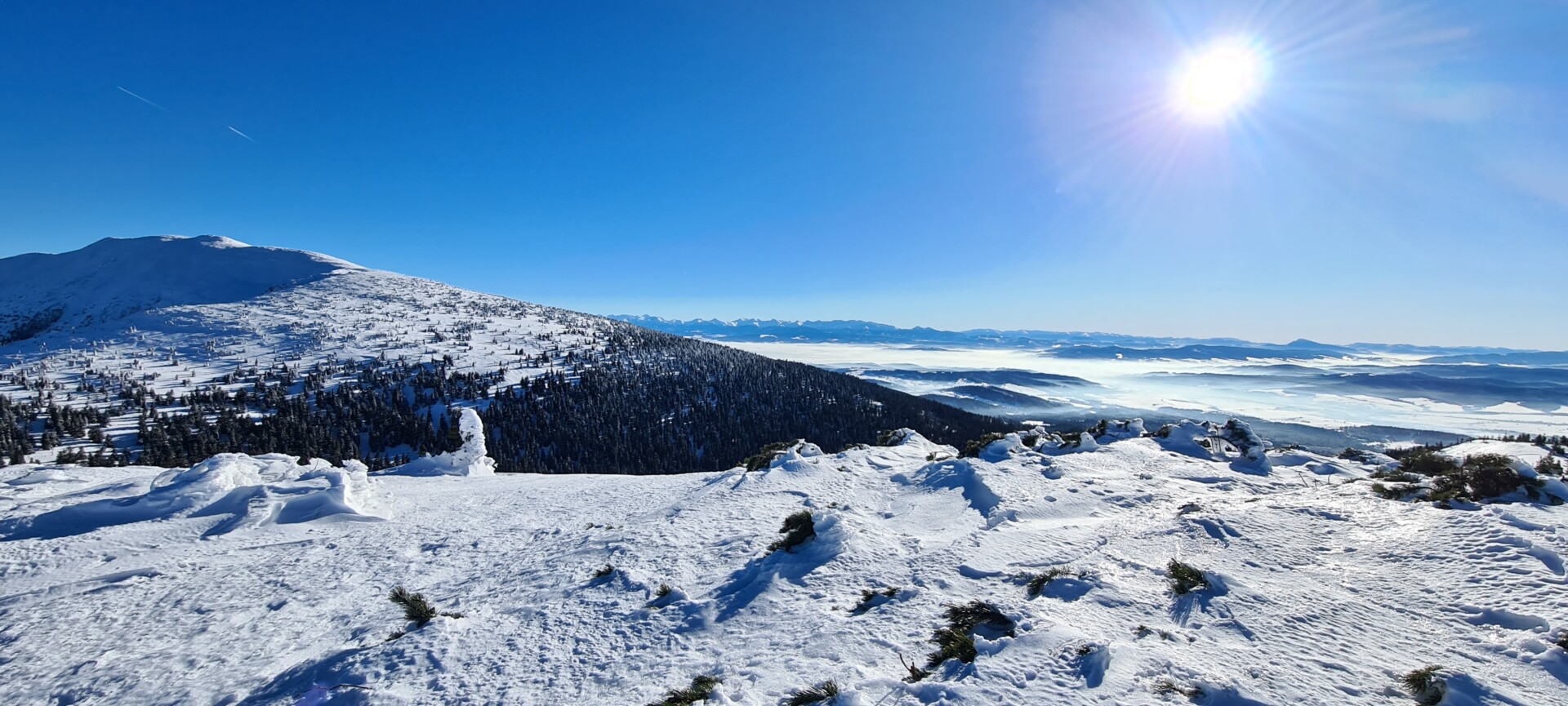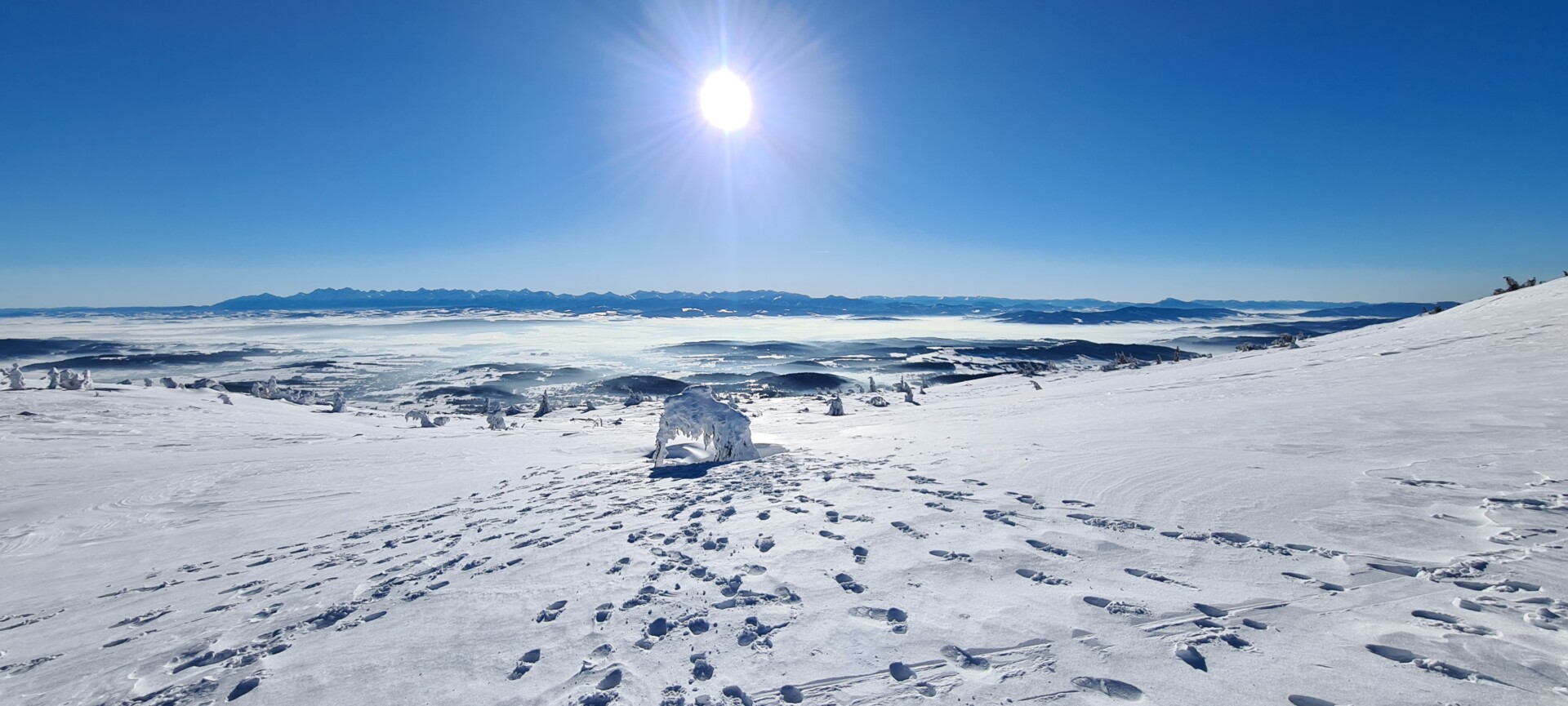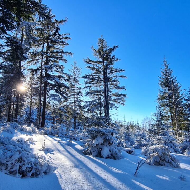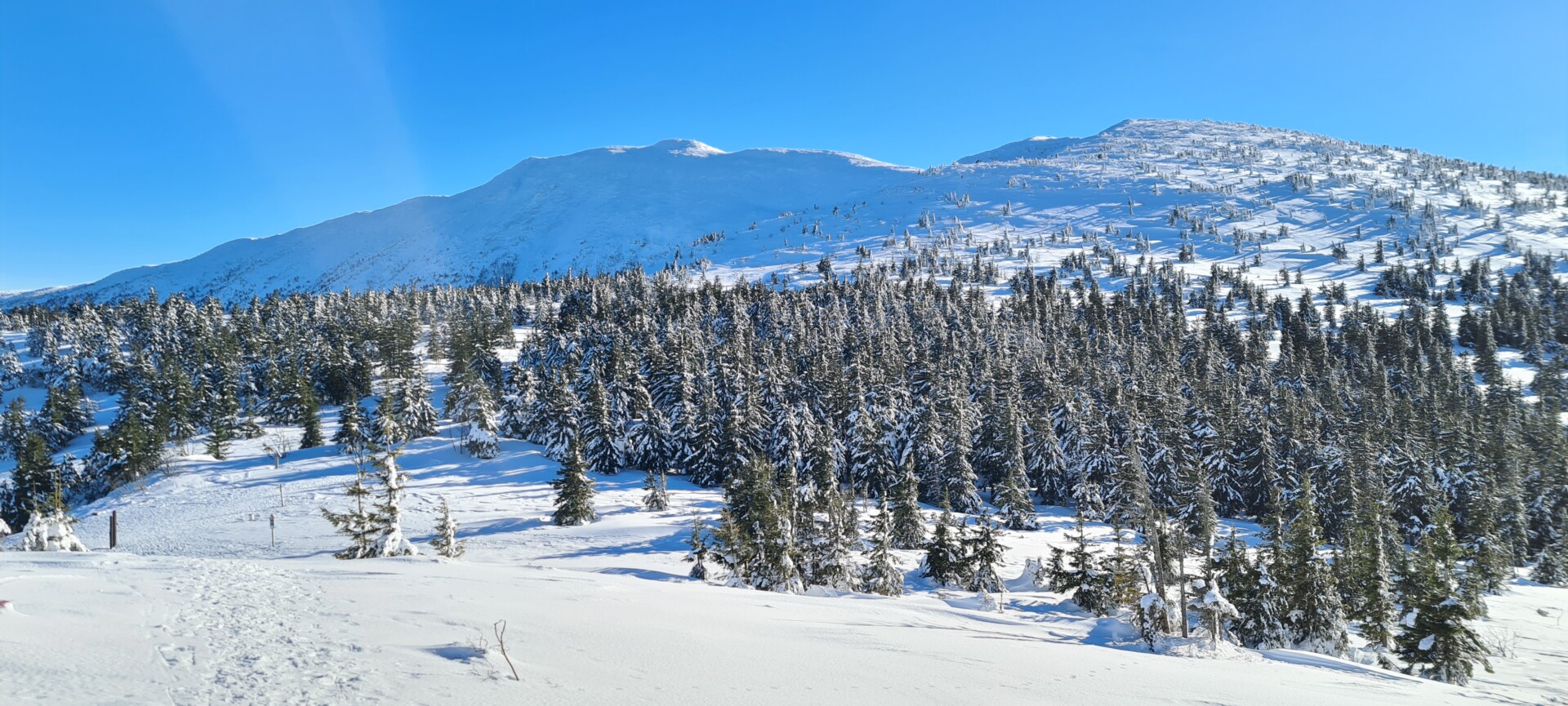 Mając w pamięci moją pierwszą, jesienną wycieczkę na Diablak, mogłem porównać, jak inaczej wygląda ta trasa zimą. Więcej wysiłku, więcej potu, więcej ciszy. Błękit nieba, blask słońca i biały puch tworzyły oślepiającą mieszankę. Witamina D wisiała w powietrzu jak budyń.