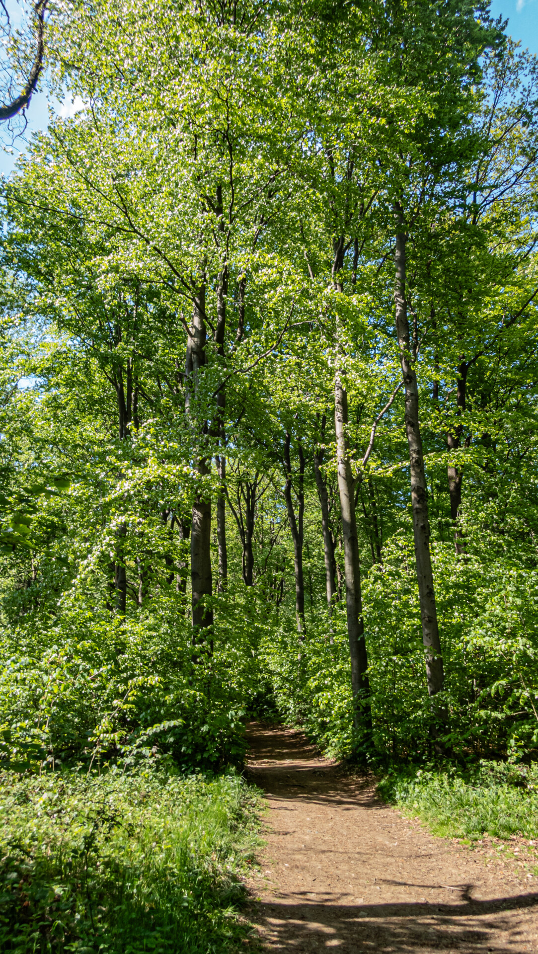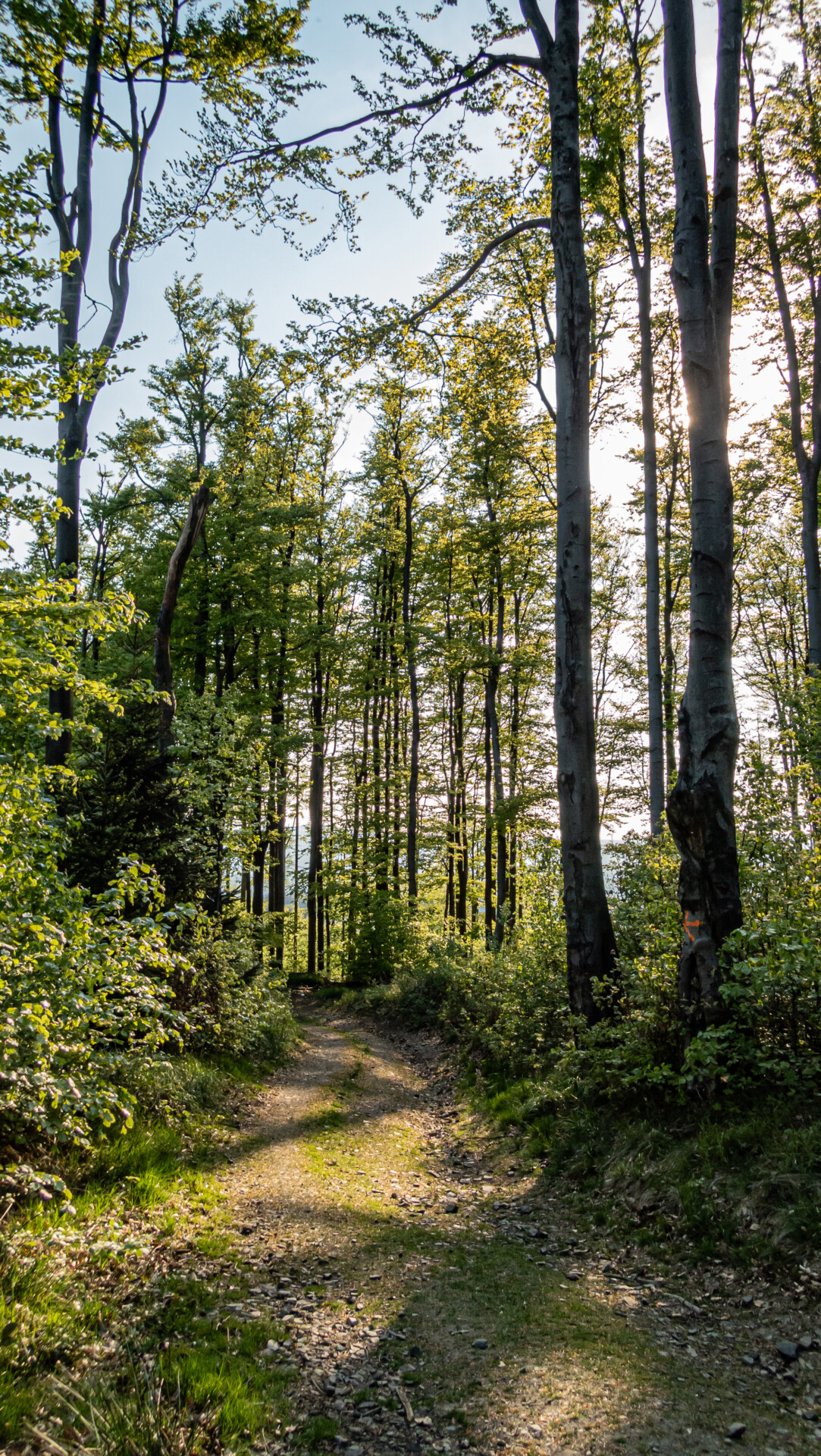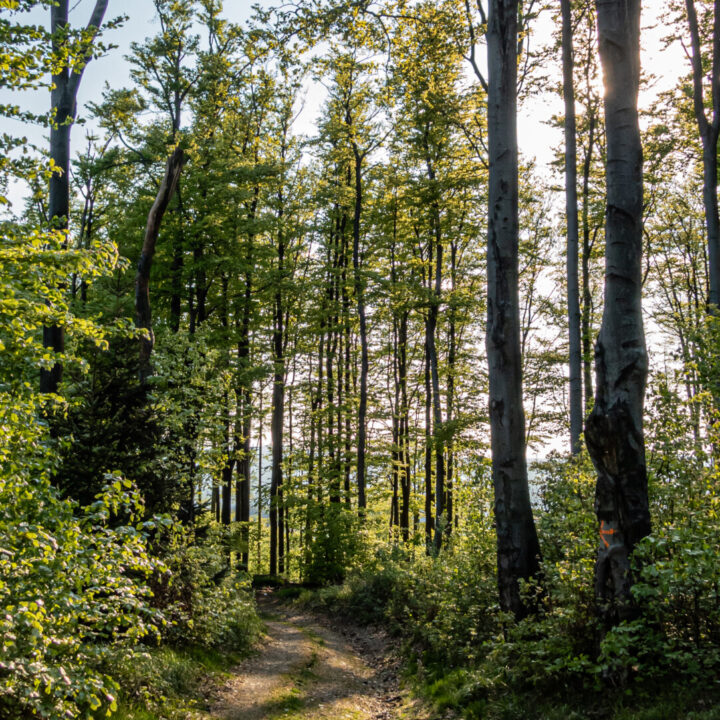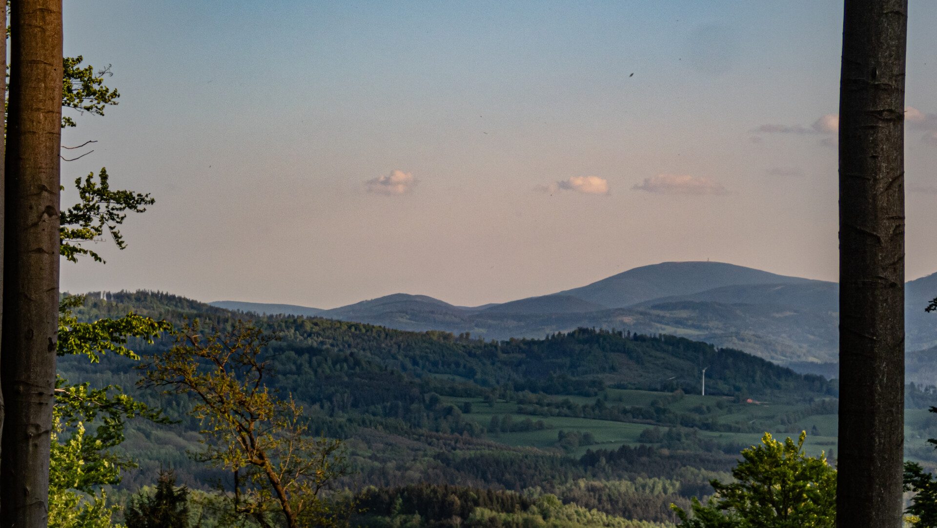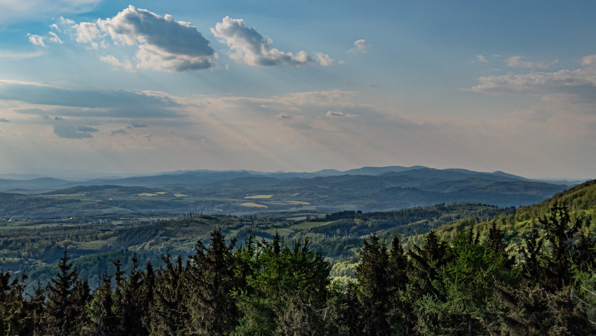 – Fragmentaryczne widoki na trasie – większość szlaku prowadzi w lesie