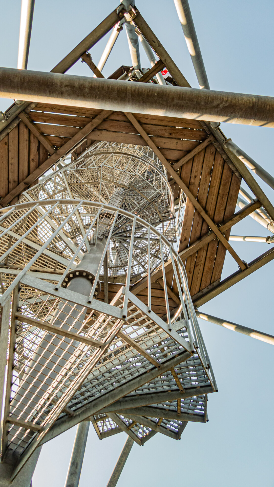 Szybko okazało się, że może się to nie udać. Wieża jest ażurowa, a na kolejne podesty prowadzą kręte, metalowe schodki. Przy wspinaniu zaczyna się lekko kręcić w głowie, a tego dnia dodatkowo wiał tak silny wiatr, że cała konstrukcja wyczuwalnie drżała przy każdym podmuchu. Dotarłem na drugi poziom z czterech – i to był mój limit. Choć w planach miałem wyjście wyżej, mój błędnik i coraz silniej budząca się akrofobia stanowczo powiedziały „stop”. Posłusznie ich wysłuchałem. Wieży nie zdobyłem.