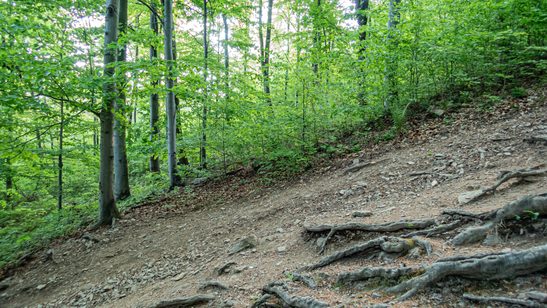 Już po 300 metrach łagodnego podejścia szlak nagle wbił się ostro w górę. Poluzowane kamienie, sypka ziemia, wystające korzenie – wszystko wskazywało na to, że wiele butów stoczyło tu walkę. Na odcinku 150 m trzeba pokonać 70 m w pionie, czyli nachylenie 46%. Dla tatrzańskiego wygi – igraszka, ale w trzecim dniu wędrówki i po Śnieżniku – czuć było wysiłek.