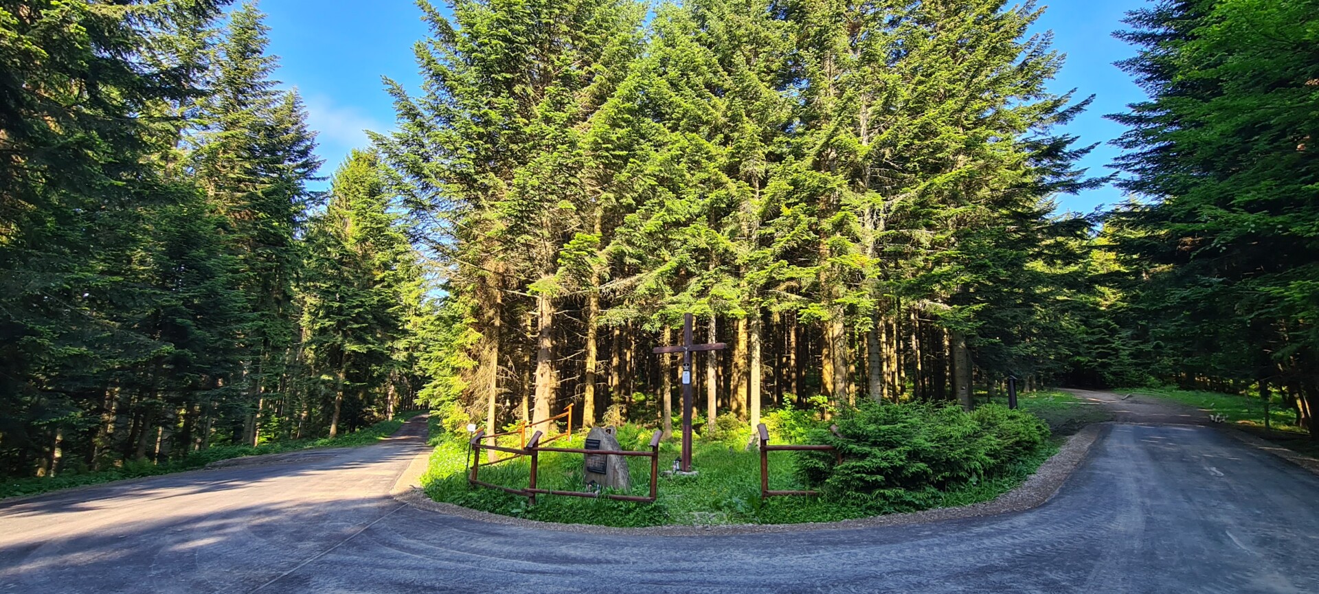 Z parkingu ruszyliśmy zielonym szlakiem, który na początkowym odcinku prowadzi asfaltową drogą przez las. Trasa jest łagodna – średnie nachylenie nie przekracza 10%, a jedynie miejscami, zwłaszcza tuż przed szczytem, sięga 24%. Całe podejście – nieco ponad 3,5 km – to marsz wśród drzew, bez widoków. Pierwsze szersze otwarcie pojawia się dopiero tuż przed szczytem, przy Krzyżu Papieskim, skąd tego dnia uśmiechały się do nas Tatry.