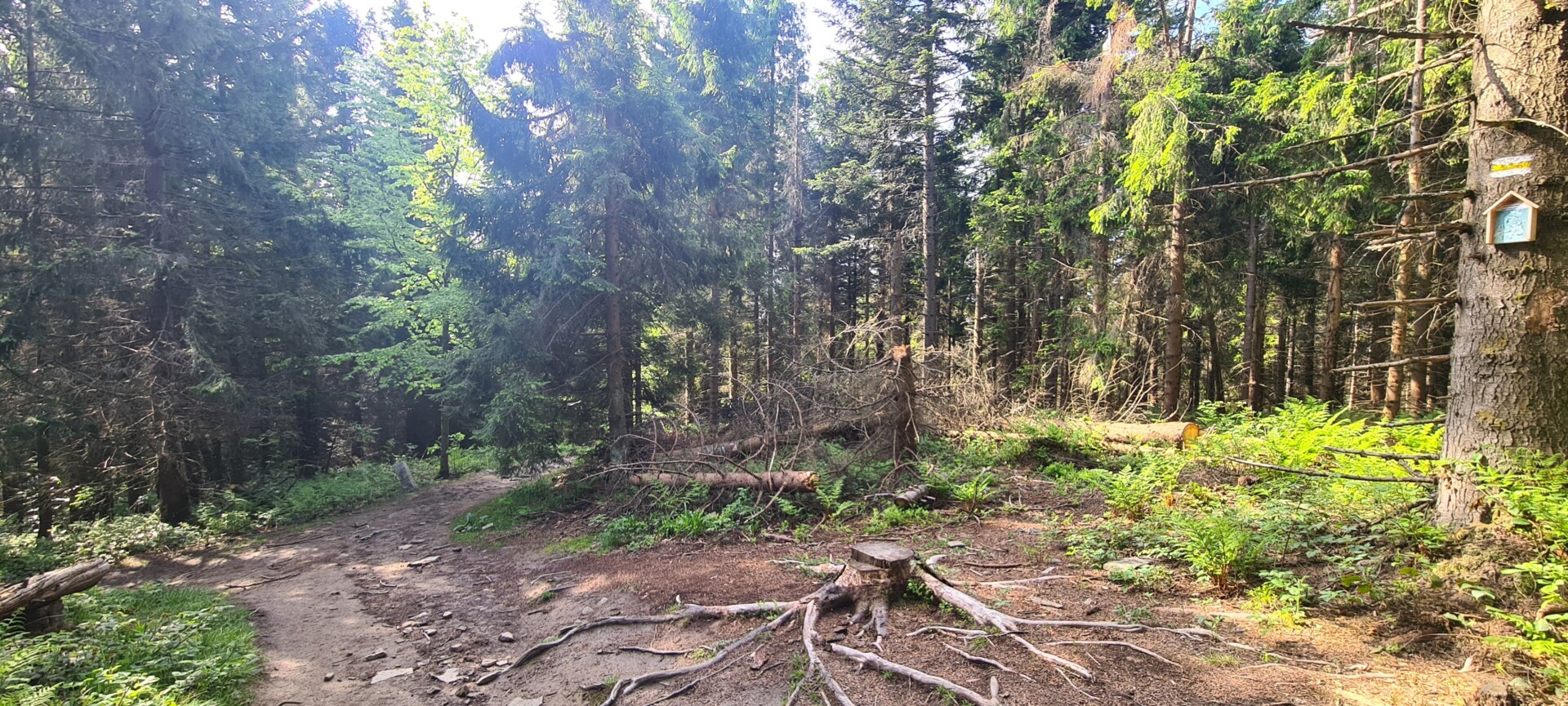 Po śniadaniu ruszyliśmy w dół, odbijając na ścieżkę dydaktyczną pod Mogielicą. Miała nas doprowadzić z powrotem na parking – i rzeczywiście doprowadziła, choć wymagało to trochę determinacji.