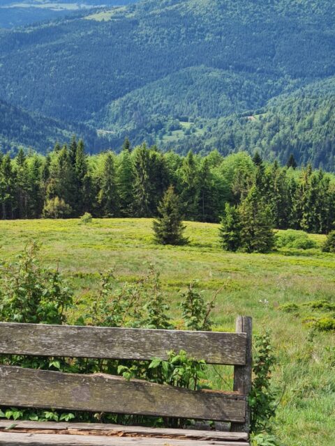 Na szczyt dotarliśmy w niecałą godzinę żwawym tempem narzuconym przez młodszego towarzysza. Ponieważ okolice wieży nie sprzyjają spokojnemu śniadaniu – ruszyliśmy dalej. Stromym żółtym szlakiem zeszliśmy na Polanę Stumorgową – miejsce wręcz stworzone na górski piknik. Są tam ławki, wiata, miejsce na ognisko, a przede wszystkim: wspaniały widok na Tatry i Babią Górę.