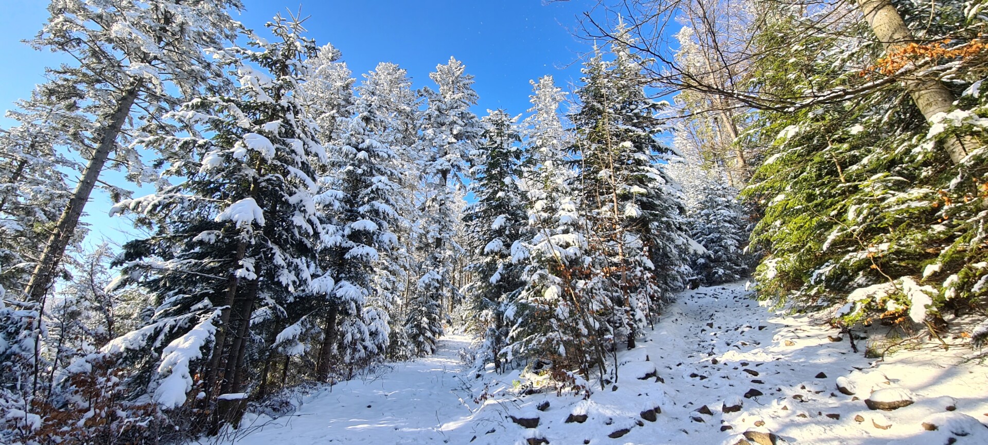 ❄️ Zimą/wiosną – U góry śnieg potrafi się utrzymać długo, nawet gdy na dole już błoto. W marcu raczki mogą się przydać, choć szlak bywa przetarty. Wodoodporne buty obowiązkowe.