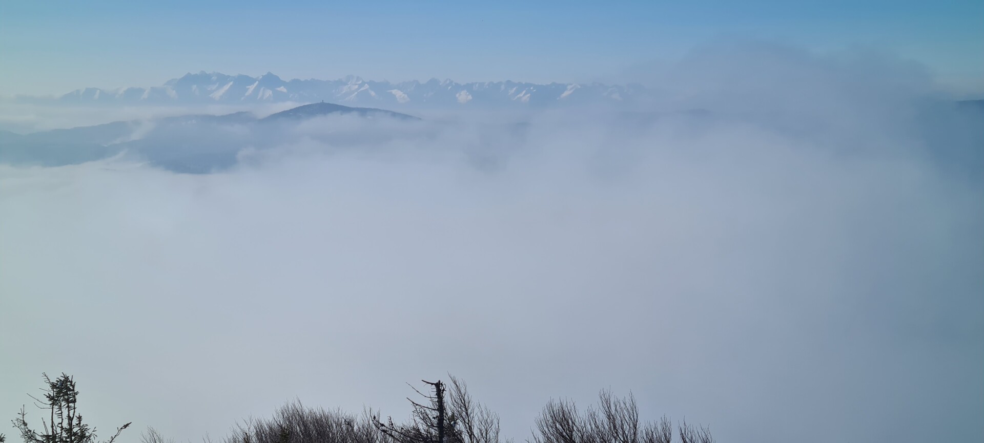 Czekałem chwilę poniżej szczytu, na Polanie Stumorgowej, licząc, że może chmury się rozstąpią i pokażą Tatry – ale się nie doczekałem. W efekcie, zupełnie na darmo musiałem potem jeszcze raz wdrapać się na górę, pokonując najbardziej strome podejście na całej trasie. Pół kilometra niebiesko-żółtego szlaku w bonusie – bez widoków, ale za to z lekką zadyszką.