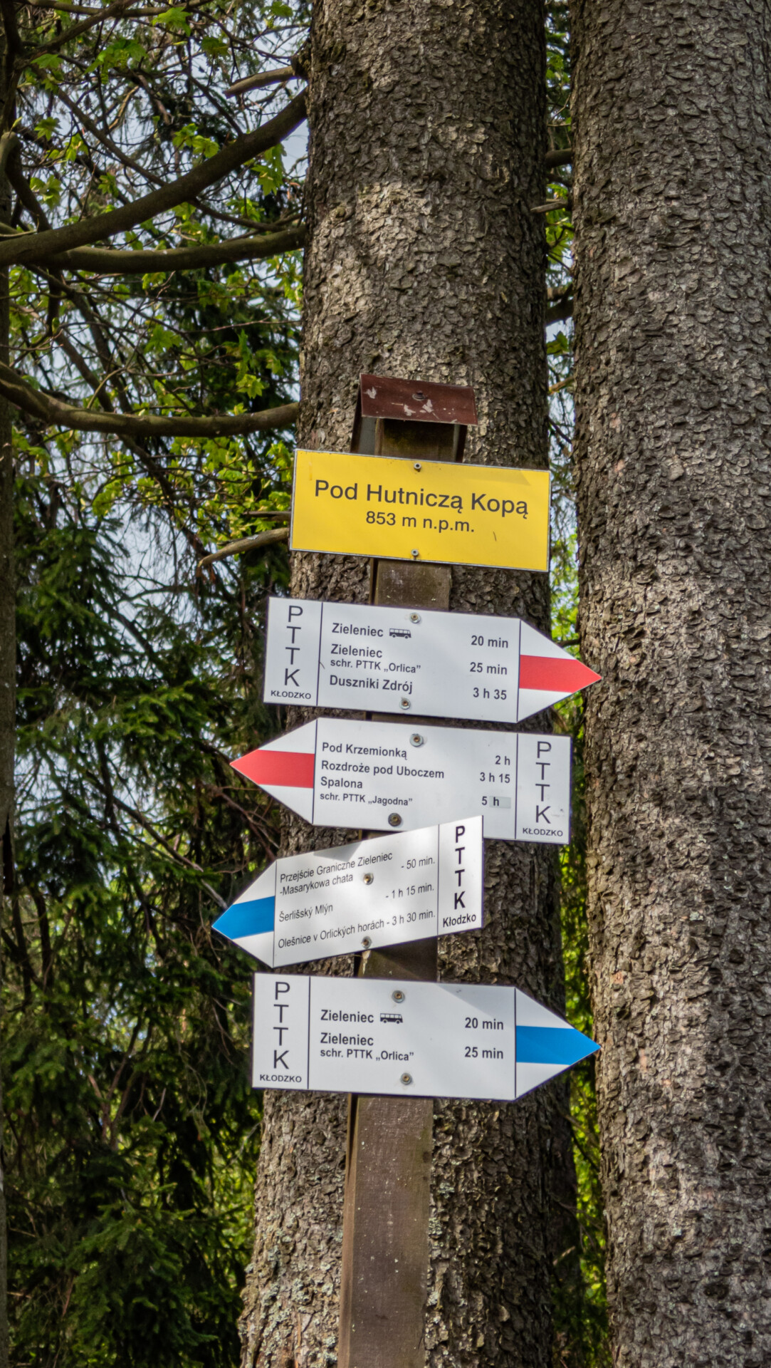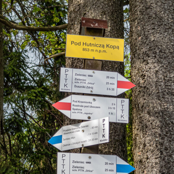 Na Orlicę (1080 m n.p.m.) można wejść na wiele sposobów. Najprościej – zielonym szlakiem spod Sołtysiej Kopy albo od Kamienia Rübartscha w Zieleńcu. To tylko około dwóch kilometrów łagodnego podejścia. Oczywiście takie warianty „tam i z powrotem” zupełnie mnie nie interesują. Zaplanowałem więc pętlę: start z parkingu w Zieleńcu pod Hutniczą Kopą, niebieskim szlakiem do schroniska na Serlichu, dalej czerwonym na Orlicę i powrót zielonym szlakiem przez całe miasteczko. W sumie niespełna 12 kilometrów i 328 metrów przewyższenia – idealny plan na dzień rekreacyjny, czyli spokojny spacer pod niewielką górkę.