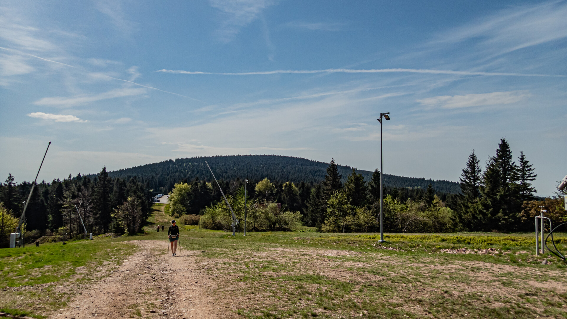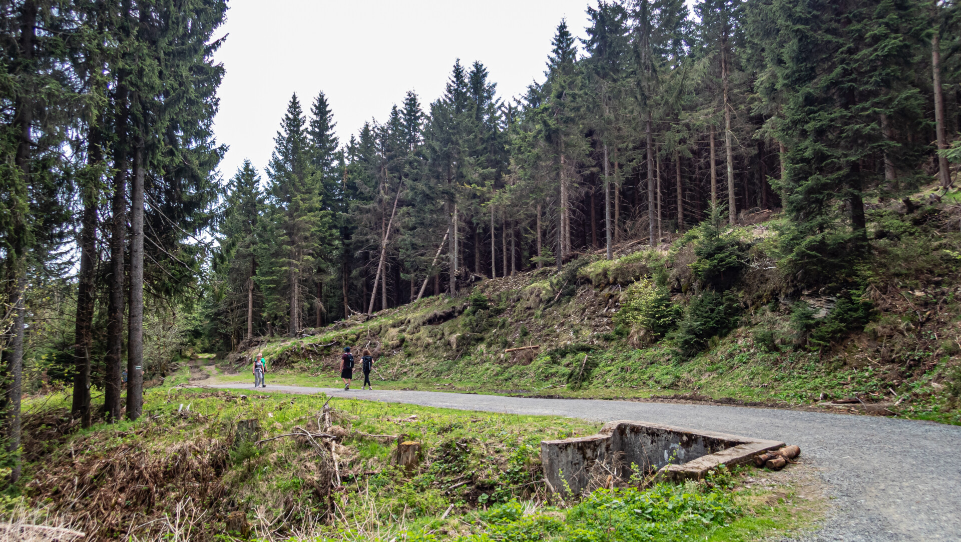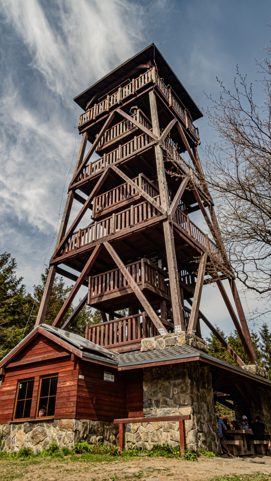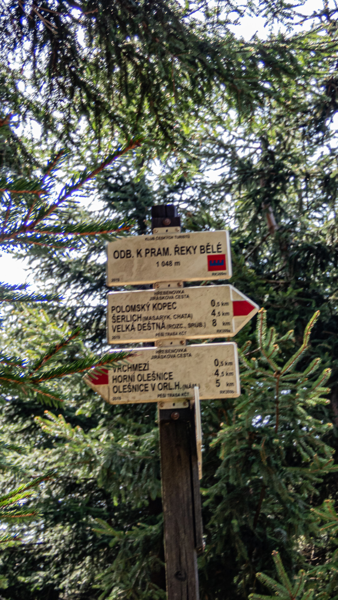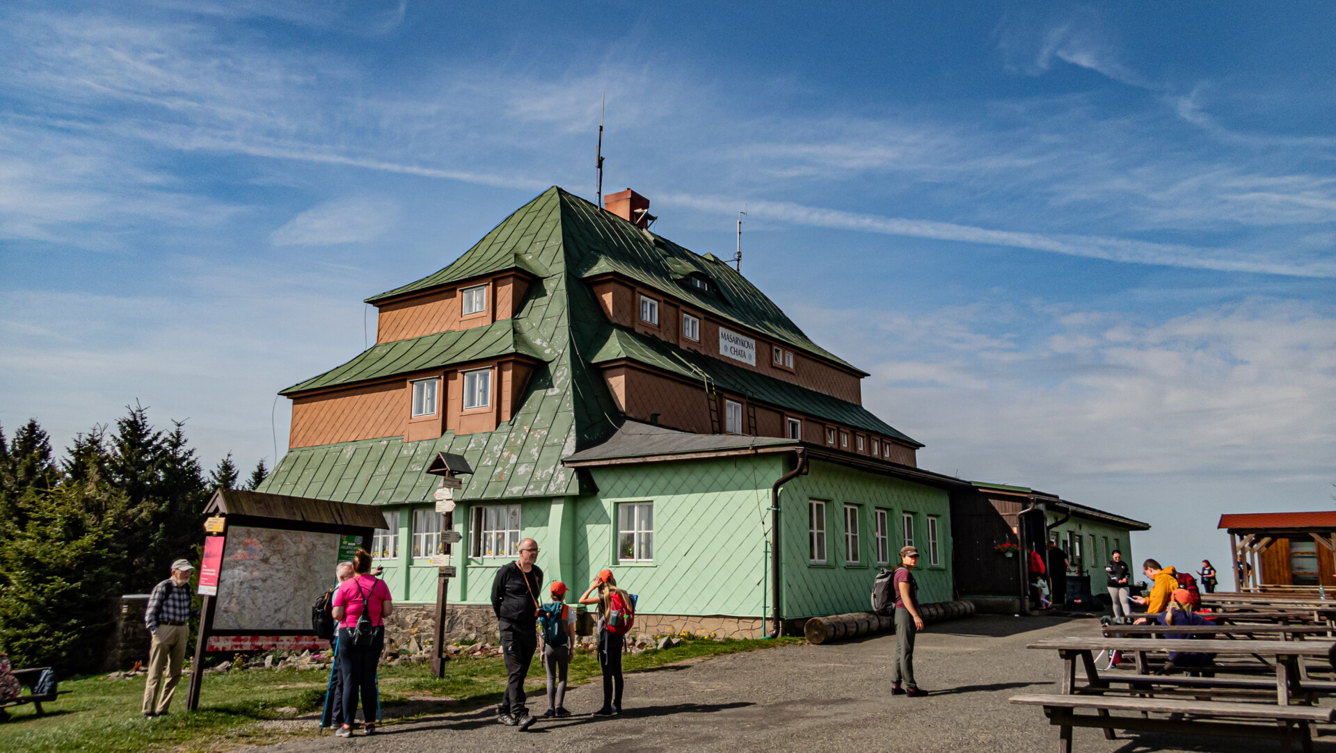 3 maja, sobota, godzina dziewiąta. Parking – pusty, pogoda – idealna, a my w czwarty dzień sudeckiej majówki nadal pełni energii. Niebieski szlak od razu wyprowadził nas poza zabudowania, w jasny i przyjemny las. Pierwsze dwa kilometry okazały się „najbardziej strome” na całej trasie – co brzmi zabawnie, bo nachylenie nie przekraczało 15%, a średnia wynosiła zaledwie 7%. Absolutna rekreacja. Po 40 minutach stanęliśmy przy Masarykovej chacie na szczycie Serlichu (1018 m n.p.m.), gdzie uzupełniliśmy elektrolity – tym razem wspaniałą czeską pianką.