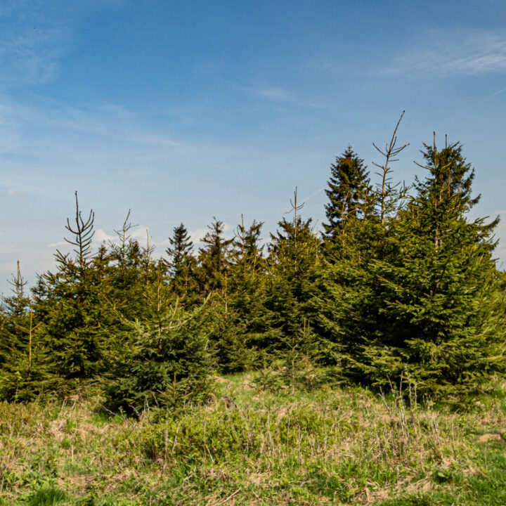 – Brak widoku ze szczytu Orlicy (tablica szczytowa w lesie).