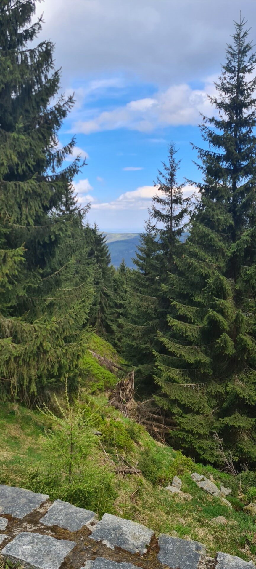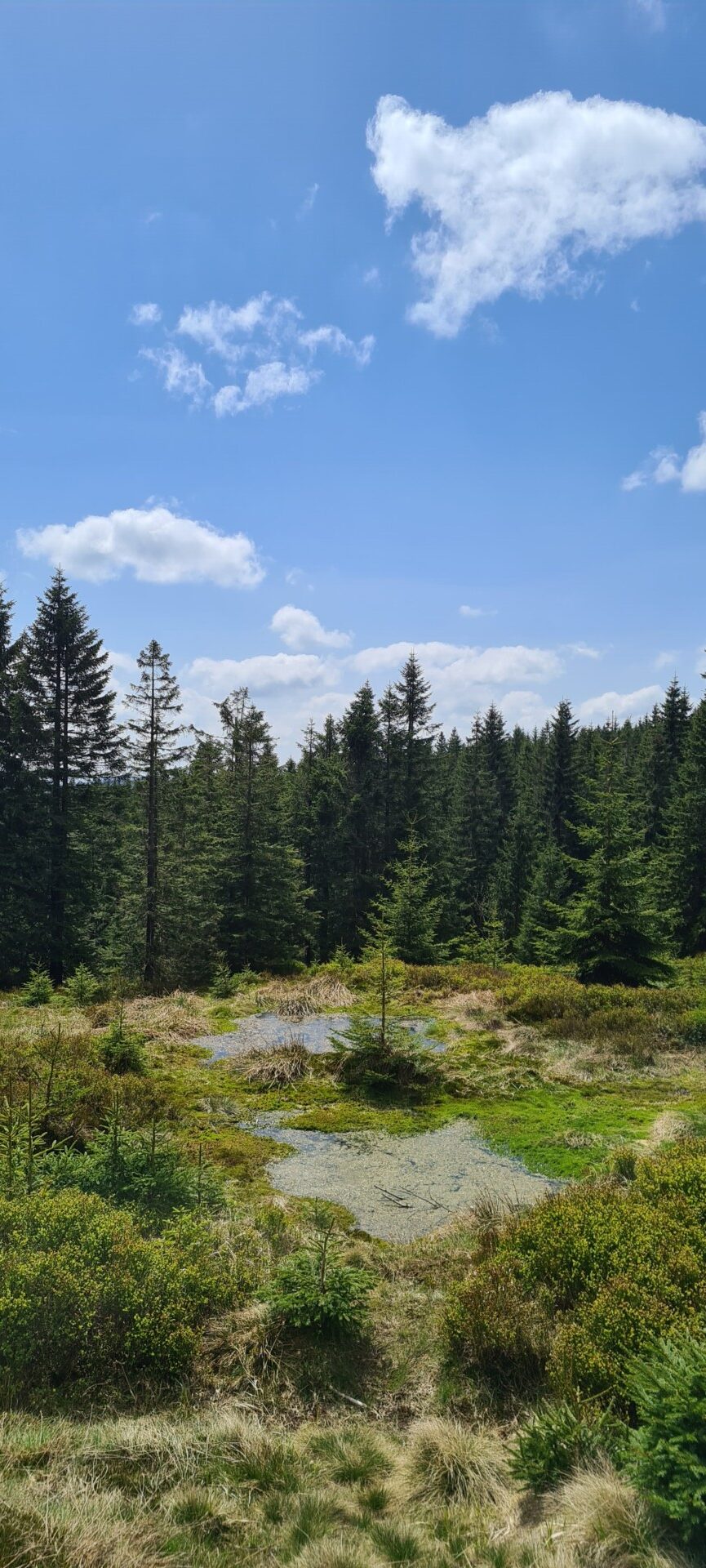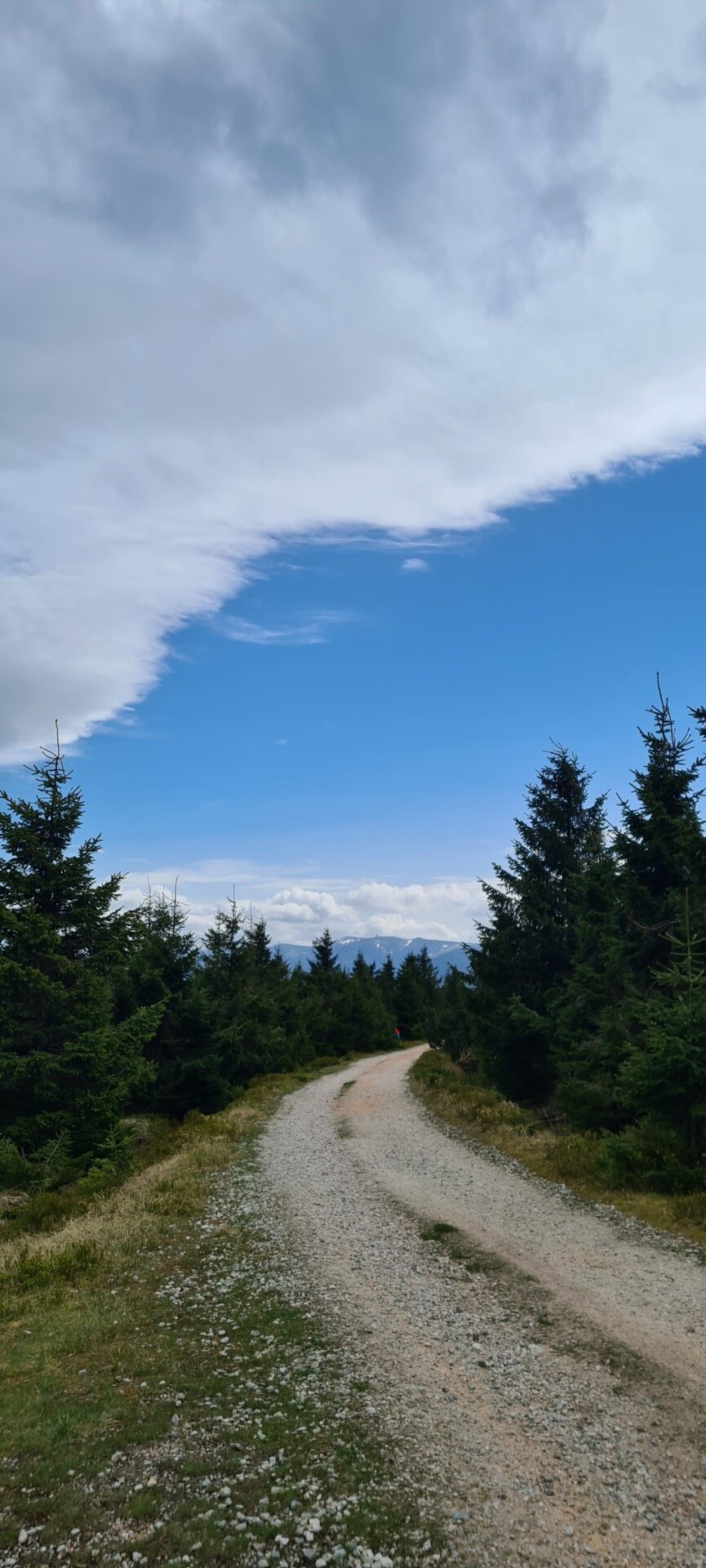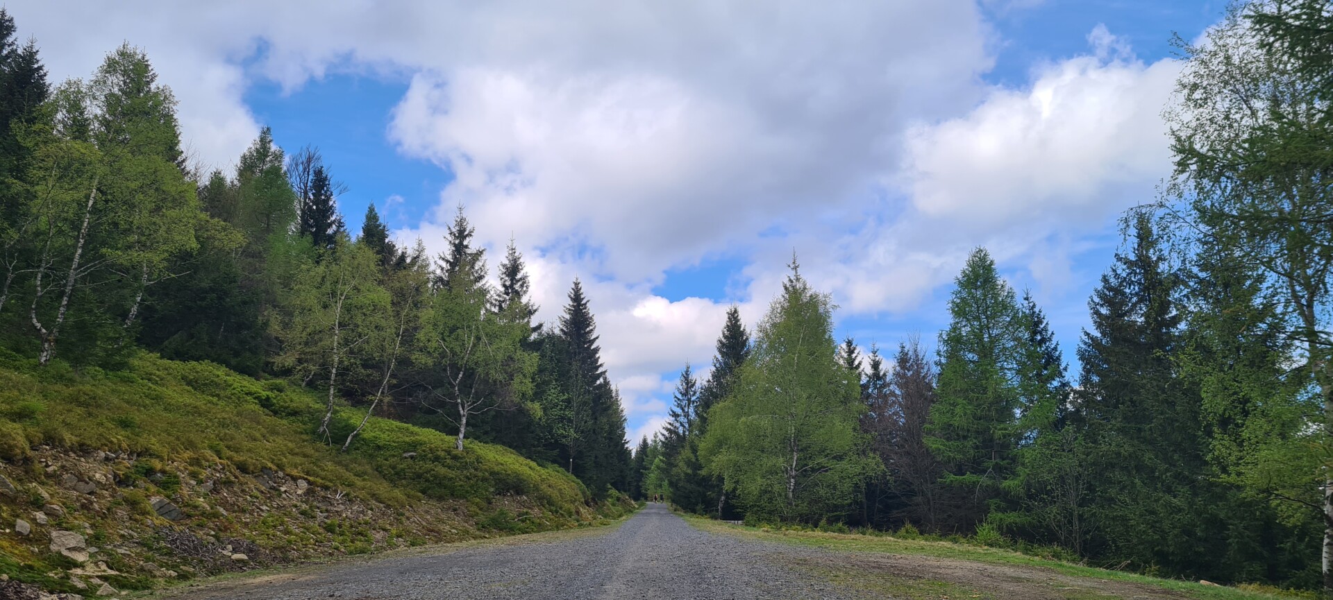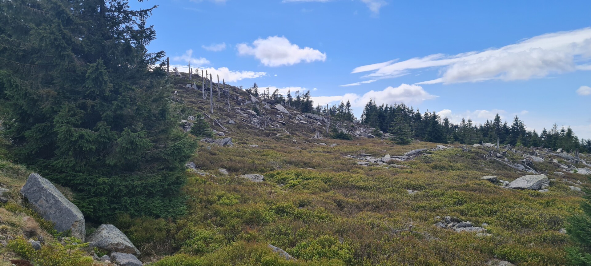 W trasę ruszyliśmy grubo po 10:00, z darmowego parkingu na Rozdrożu Izerskim przy Drodze Sudeckiej. Ku naszemu zdziwieniu – mimo majówki – nadal były wolne miejsca. Szlak żółty prowadził nas bardzo łagodnie, z przeciętnym nachyleniem ok. 5%, szeroką, wygodną drogą. Po niecałej półtorej godziny dotarliśmy do rozwidlenia szlaków, gdzie odbiliśmy na czerwony, prowadzący już bezpośrednio w stronę Wysokiej Kopy. Również i ten odcinek był szeroki i łatwy – ale zdecydowanie bardziej uczęszczany.