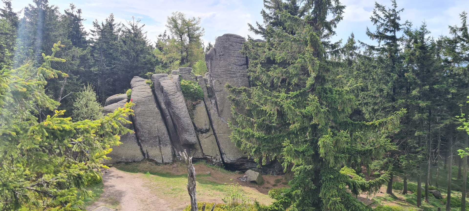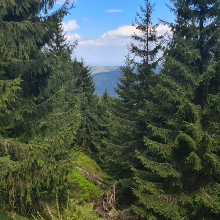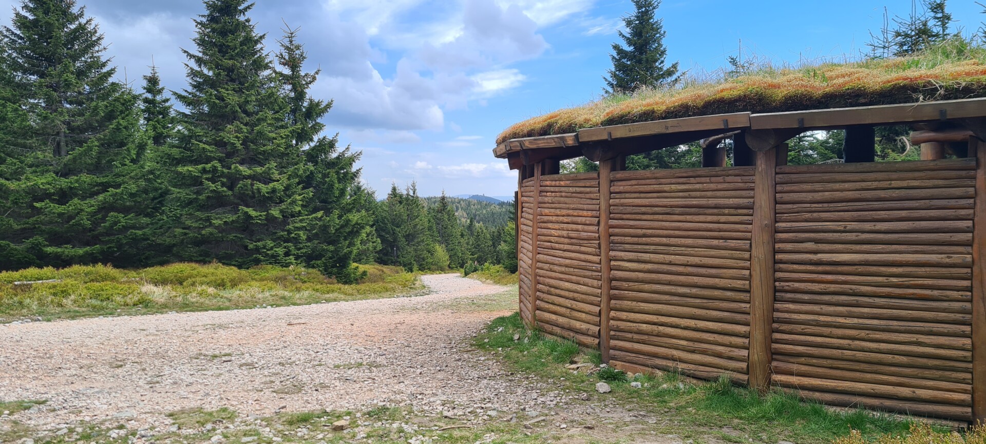 Z powrotem ruszyliśmy dalej czerwonym, a potem zielonym szlakiem – naturalna pętla na najwyższy szczyt Gór Izerskich. To kolejne 6,5 km przez las, wygodną drogą, z kilkoma ciekawostkami po drodze. Po lewej – kopalnia kwarcu „Stanisław” (którą sobie odpuściliśmy), a dalej – zaskakująco aromatyczny betonowy bunkier po dawnym magazynie materiałów wybuchowych.