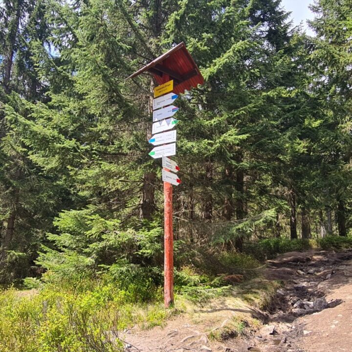 📍 Szczyt – Symbolicznie oznaczony tabliczką i pieczątką przy szlaku. Właściwy wierzchołek jest zamknięty dla turystów od 2021 roku ze względu na ochronę cietrzewia. Tablica informacyjna stoi, ścieżka mimo to wydeptana i hulaj dusza, piekła nie ma.