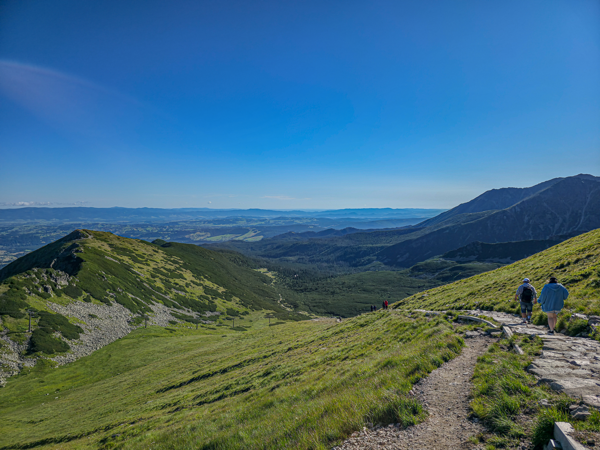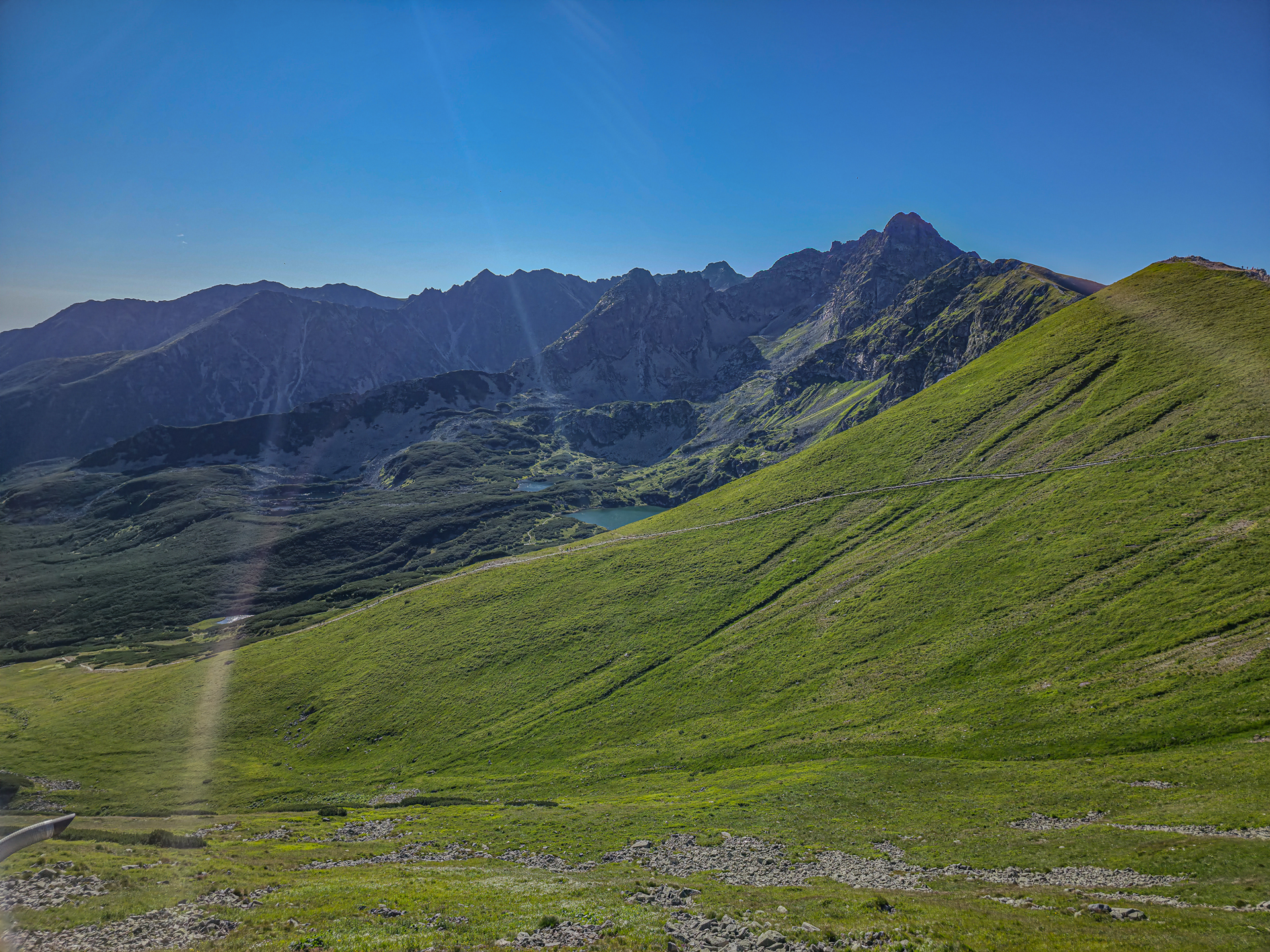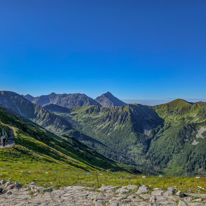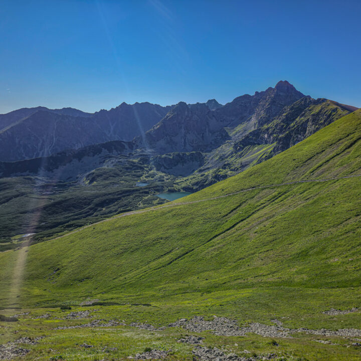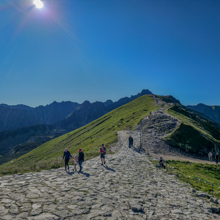 W naprawdę fatalnym pogodowo lipcu 2025 roku, środa 23 lipca okazała się pogodową torpedą. Ciepło, błękitne niebo, pełne słońce, z prognozowanymi lekkimi chmurami w południe. Tatry były tak wyraźne już z okolic Krakowa, jak nigdy wcześniej. Wyruszyliśmy o 5:30, a na parkingu w Kuźnicach – już zatłoczonym – byliśmy przed 7:00. Plan był prosty: zdobyć Kościelec najłatwiejszym wariantem – wjazd kolejką na Kasprowy, potem zejście żółtym szlakiem do Doliny Zielonej Gąsienicowej i dalej przez Karb na szczyt. Bilety online były niedostępne od kilku dni, więc mieliśmy wariant zapasowy – „ósemkę”: Kuźnice – Boczań – Murowaniec – Zielony Staw – Karb – Kościelec – Czarny Staw – Murowaniec – Dolina Jaworzynki – Kuźnice. Na szczęście po 20 minutach udało nam się kupić bilety i przed ósmą kolejka wywiozła nas na kąpiący się w słońcu Kasprowy Wierch.