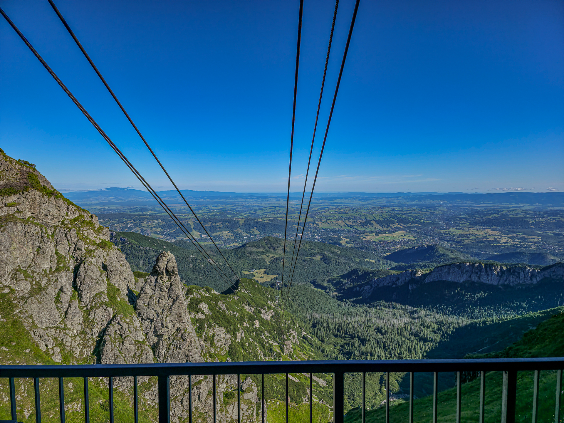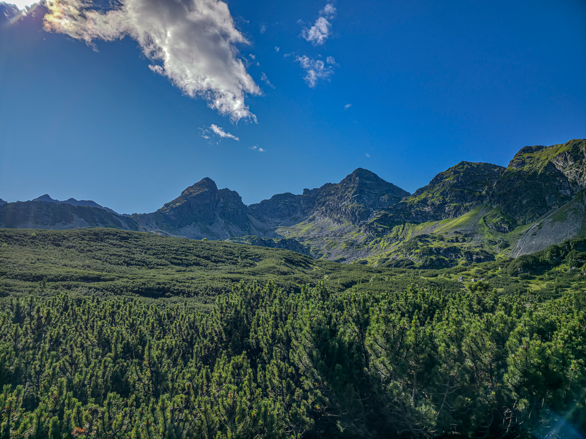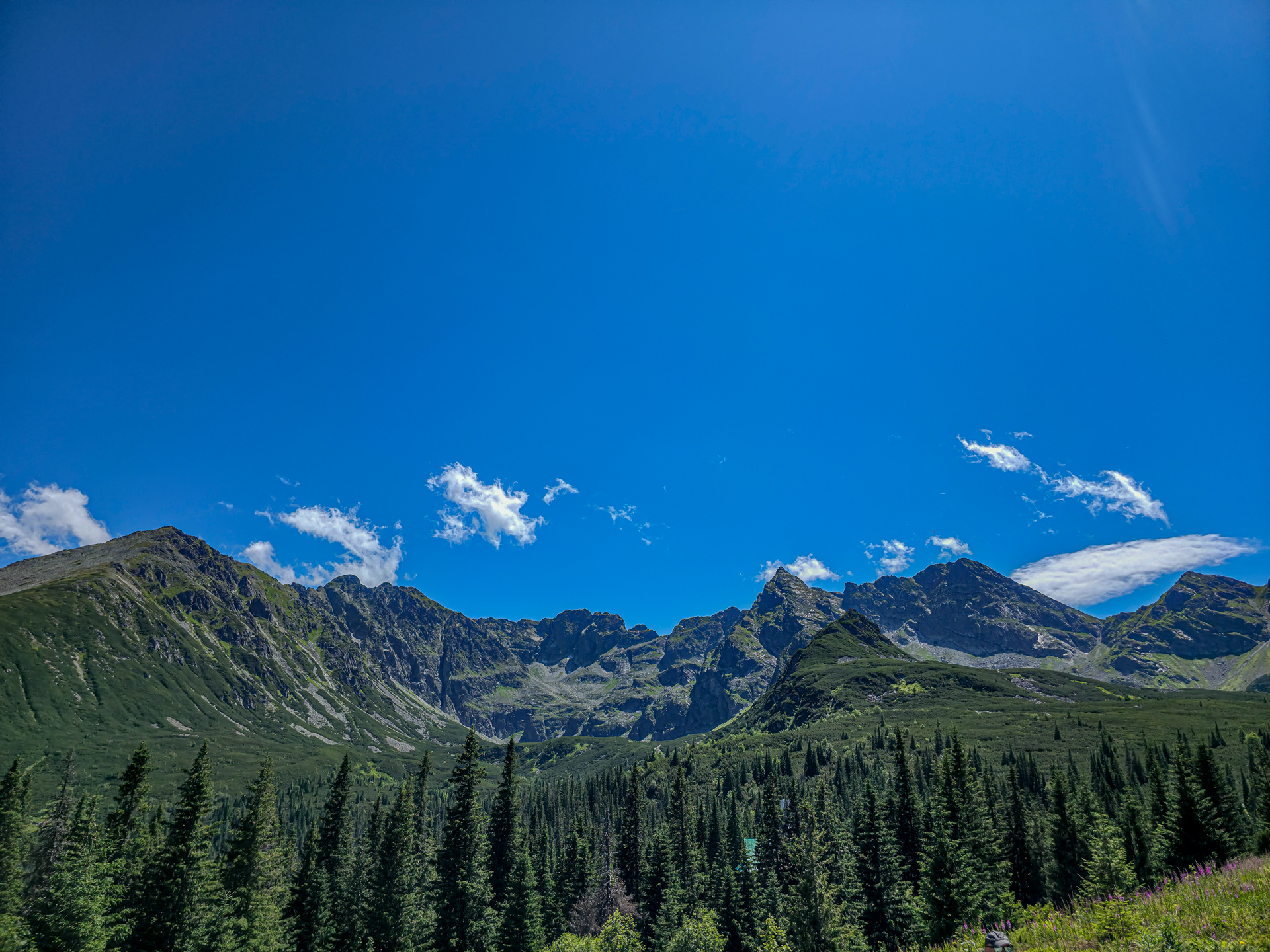 W naprawdę fatalnym pogodowo lipcu 2025 roku, środa 23 lipca okazała się pogodową torpedą. Ciepło, błękitne niebo, pełne słońce, z prognozowanymi lekkimi chmurami w południe. Tatry były tak wyraźne już z okolic Krakowa, jak nigdy wcześniej. Wyruszyliśmy o 5:30, a na parkingu w Kuźnicach – już zatłoczonym – byliśmy przed 7:00. Plan był prosty: zdobyć Kościelec najłatwiejszym wariantem – wjazd kolejką na Kasprowy, potem zejście żółtym szlakiem do Doliny Zielonej Gąsienicowej i dalej przez Karb na szczyt. Bilety online były niedostępne od kilku dni, więc mieliśmy wariant zapasowy – „ósemkę”: Kuźnice – Boczań – Murowaniec – Zielony Staw – Karb – Kościelec – Czarny Staw – Murowaniec – Dolina Jaworzynki – Kuźnice. Na szczęście po 20 minutach udało nam się kupić bilety i przed ósmą kolejka wywiozła nas na kąpiący się w słońcu Kasprowy Wierch.