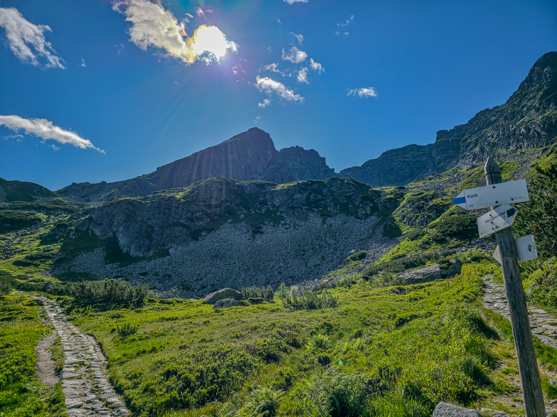 Szło doskonale. Pogoda dopisała, kolejka załatwiona bez problemu, a rozgrzewka żółtym szlakiem – niespełna 1,5 km w dół ze średnim nachyleniem 23% – była przyjemna. Następnie 1,6 km przez Dolinę Zieloną Gąsienicową z widokiem na cel wyprawy – wyróżniający się na tle sąsiednich szczytów Kościelec. Z daleka przypominał mi skocznię narciarską. Tego dnia jego granitowe płyty błyszczały w słońcu jak kryształki Swarovskiego. Na Przełęczy Karb zameldowaliśmy się po 1:10 h, czując lekkie przyspieszenie tętna na ostatnim podejściu (momentami nachylenie sięga tam 60%). Uzupełniliśmy cukier, płyny, założyliśmy kaski (choć 3/4 turystów ich nie miała) i ruszyliśmy dalej. Drogowskaz wskazywał 50 minut, ale wiedziałem, że może być dłużej – zator, zadyszka czy atak paniki mogły łatwo wydłużyć czas.