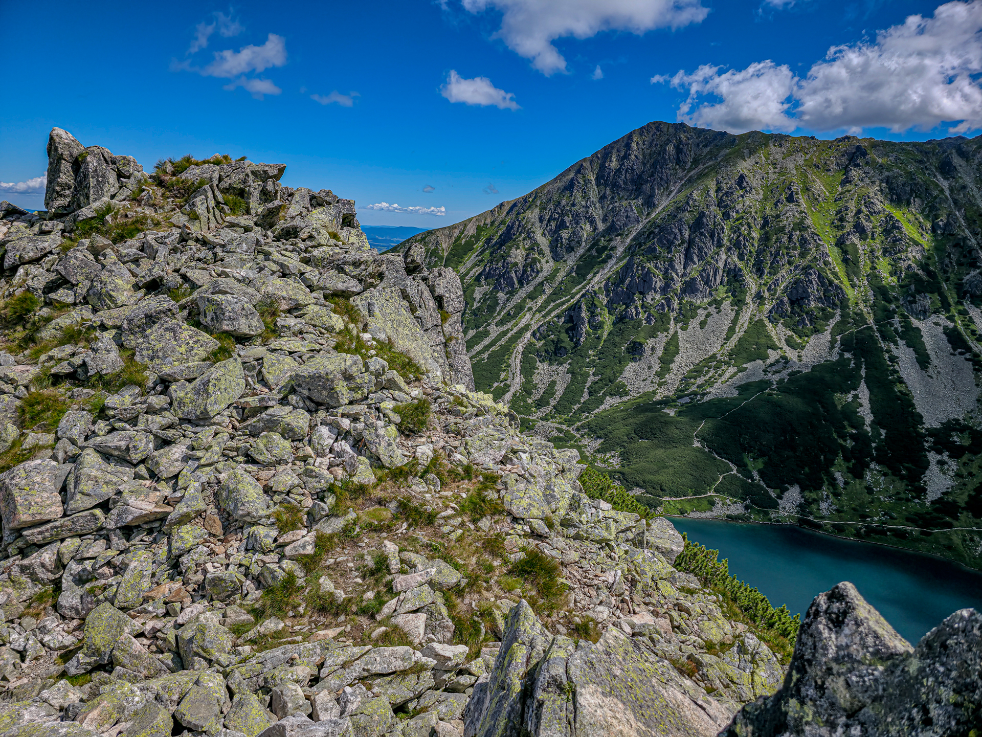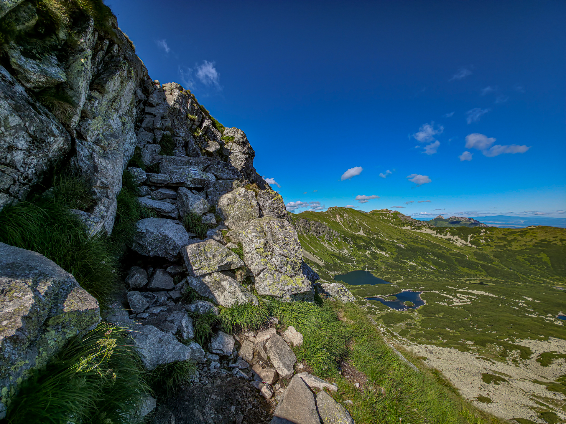Szlak z Karbu na Kościelec ma ok. 900 metrów długości i 350 metrów przewyższenia, co daje średnie nachylenie 39% (miejscami nawet 136%). To sporo. Szlak wije się północnym zboczem góry, dając co jakiś czas możliwość odpoczynku na płaskich trawersach. Jeśli ktoś trenował wcześniej interwały, to właśnie tu serce dostaje szansę się uspokoić. W kilku miejscach trzeba użyć rąk, by podciągnąć się przez skalne kominki – nie są one jednak trudniejsze niż te na Giewoncie. Różnica? Brak łańcuchów czy klamer.