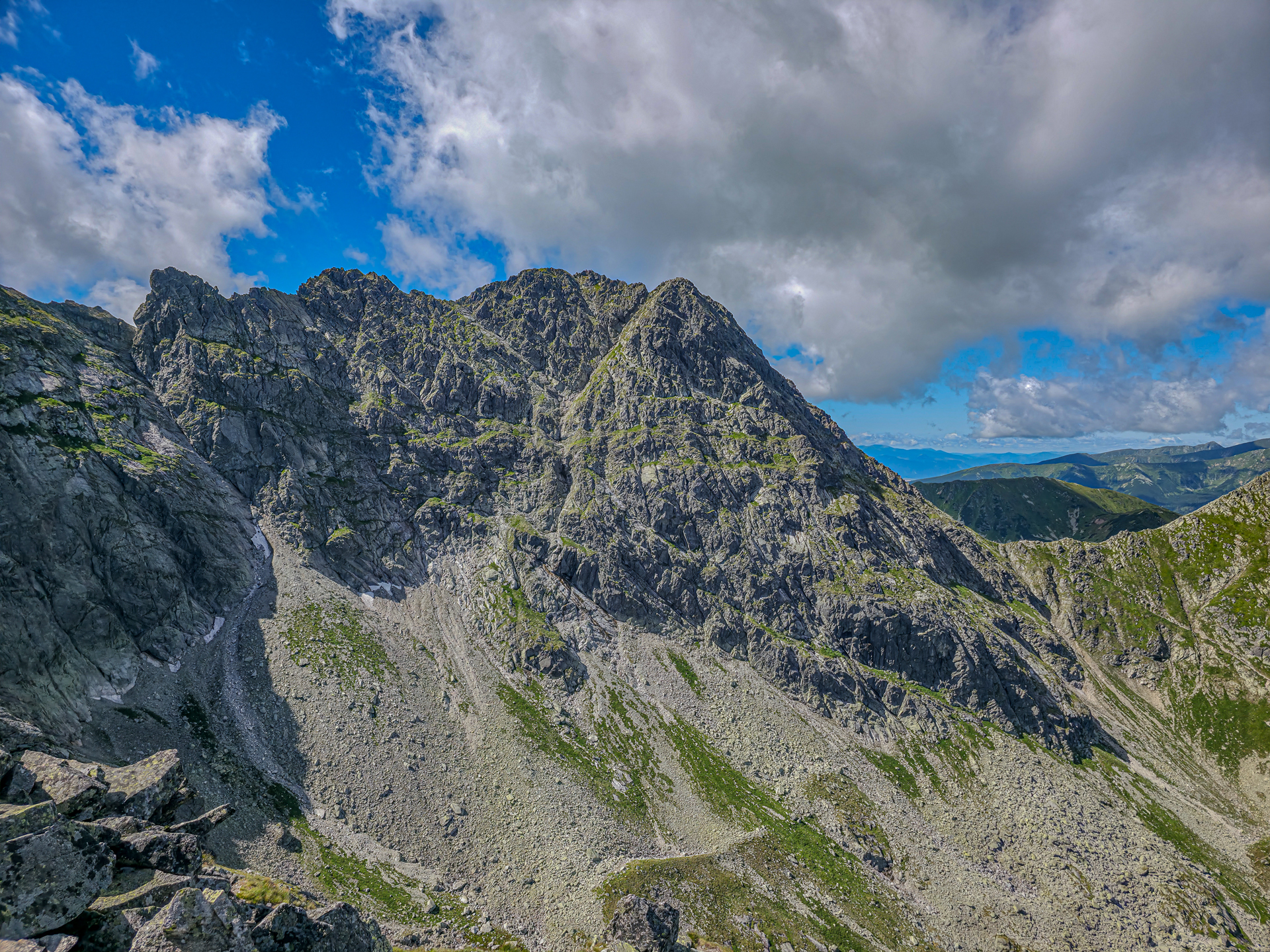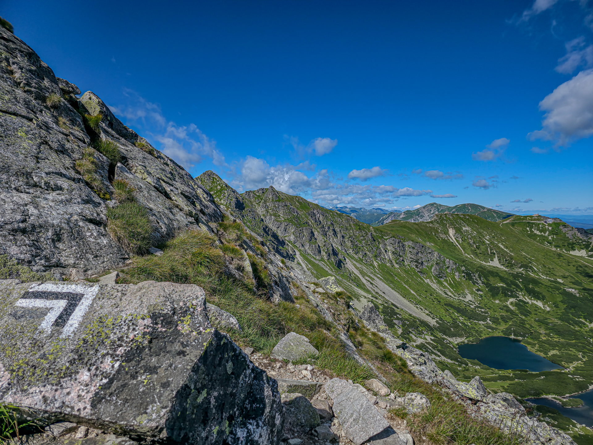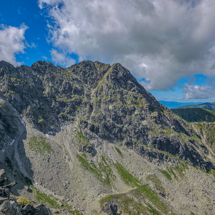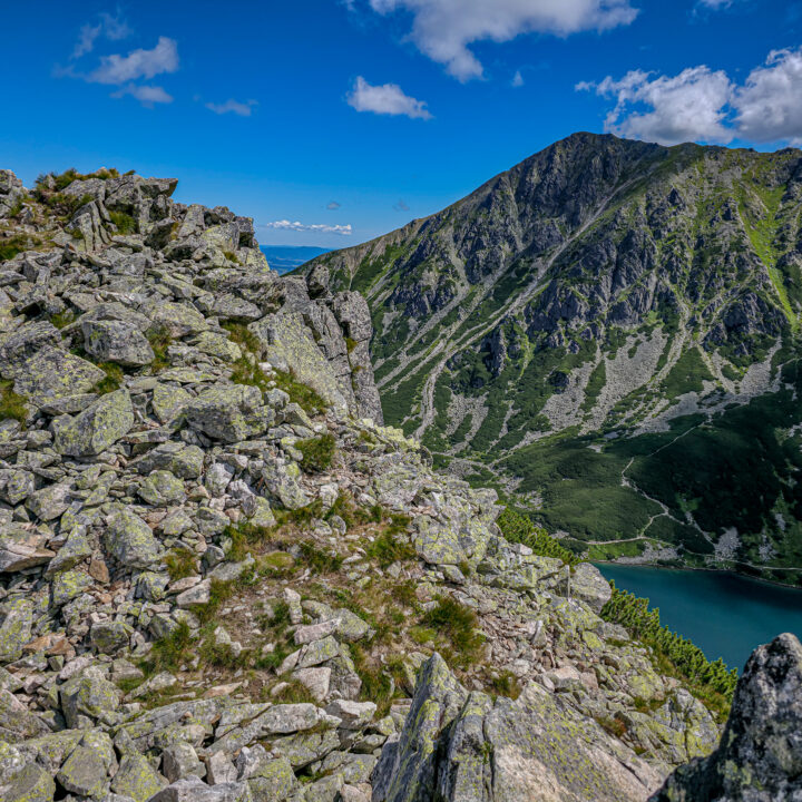 🔹 Ekspozycja: znaczna. Kluczowy odcinek z Przełęczy Karb na szczyt to strome, skalne zbocze bez sztucznych zabezpieczeń. Miejscami przestrzeń za plecami jest silnie odczuwalna – szczególnie na wąskich płytach i przy mijankach. Przy dobrej pogodzie ekspozycja jest do zniesienia, ale w warunkach silnego wiatru lub mgły poziom zagrożenia rośnie radykalnie.