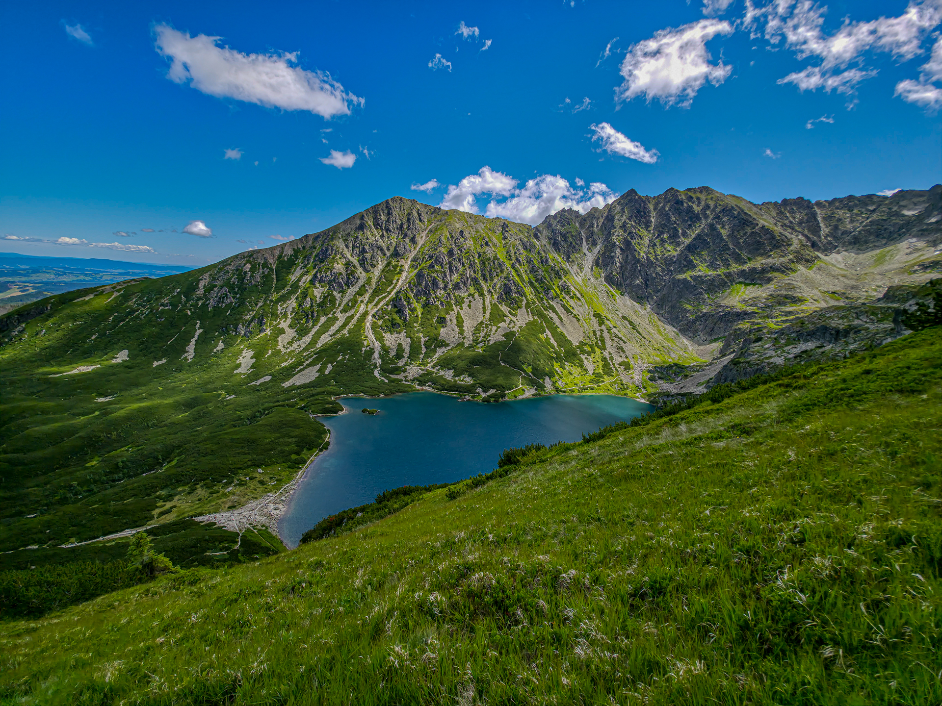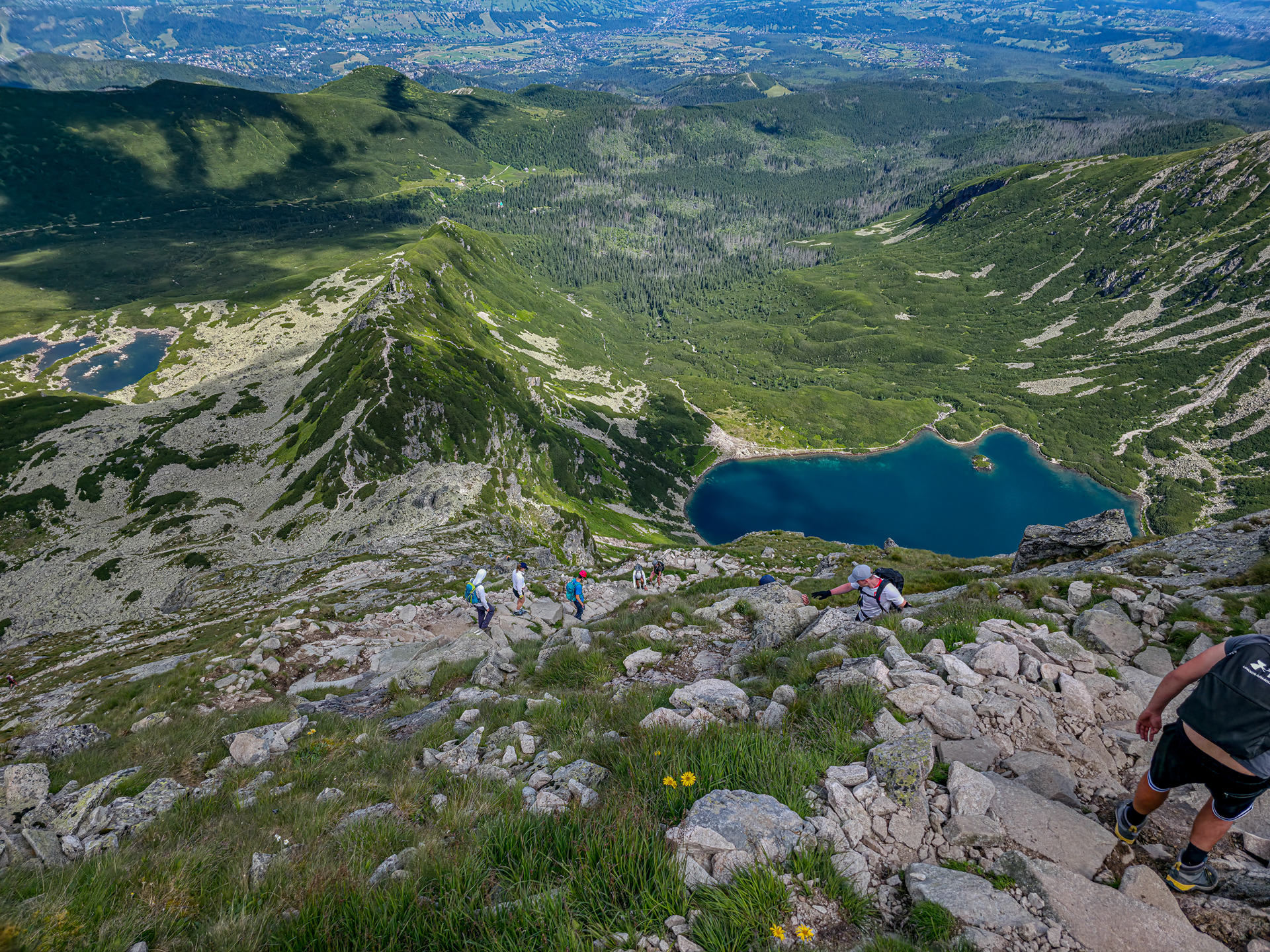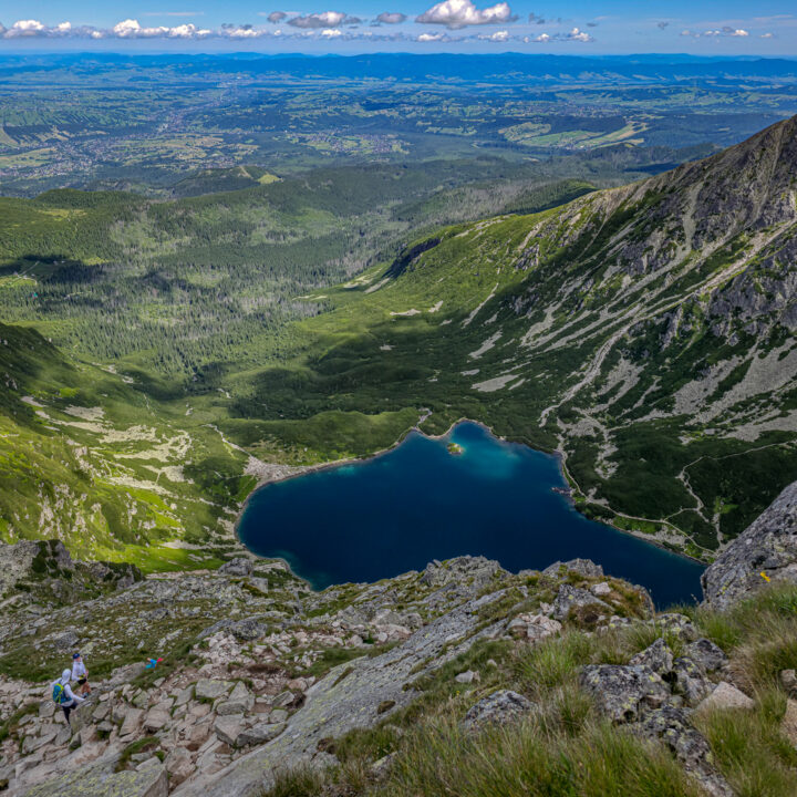 Dla urozmaicenia wybraliśmy zejście przez Czarny Staw Gąsienicowy. Staw mienił się kolorami od ciemnego błękitu po malediwski turkus, smagany lekkim wiatrem. Tym razem zejście czarnym szlakiem – który wcześniej był dla mnie koszmarem – było spokojne i relaksujące. Choć nachylenie miejscami sięgało 80%, lęk jakby wyparował. Nad stawem – tłumy. Plażowicze, turyści, piknikowicze. Zatrzymaliśmy się tylko na moment, by spojrzeć z drugiej strony na Kościelec. Duma mnie rozpierała, bo góra od tej strony wyglądała jeszcze bardziej imponująco.