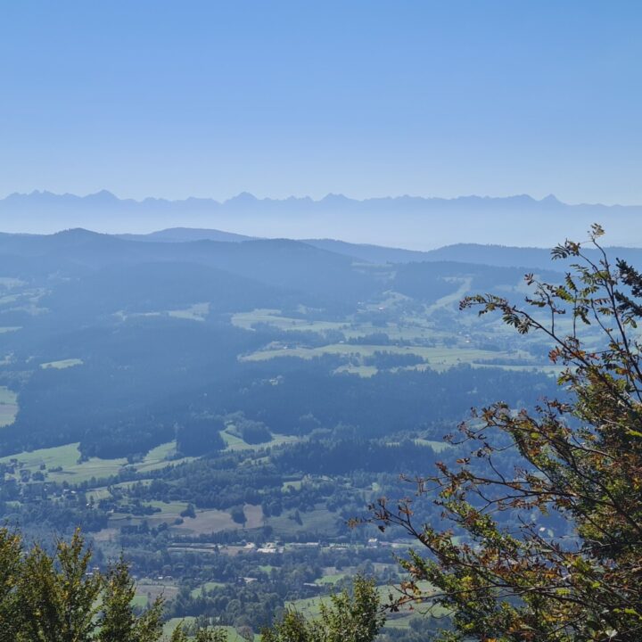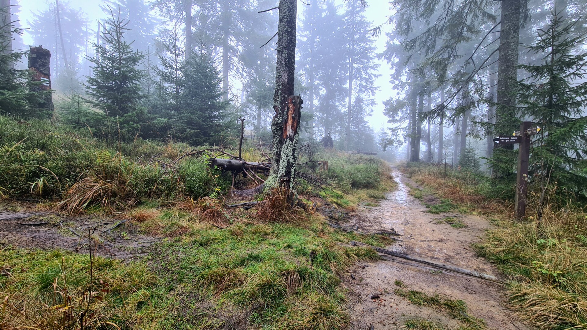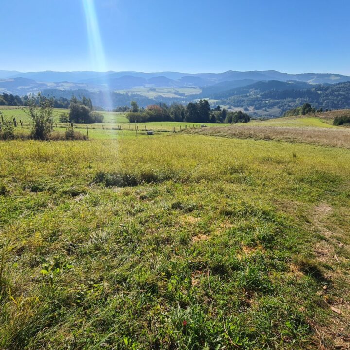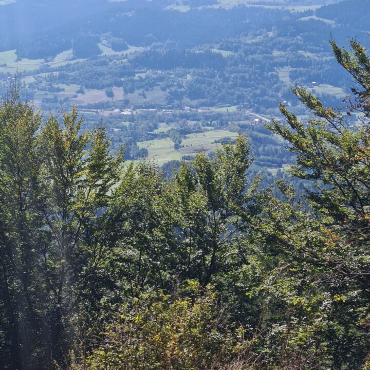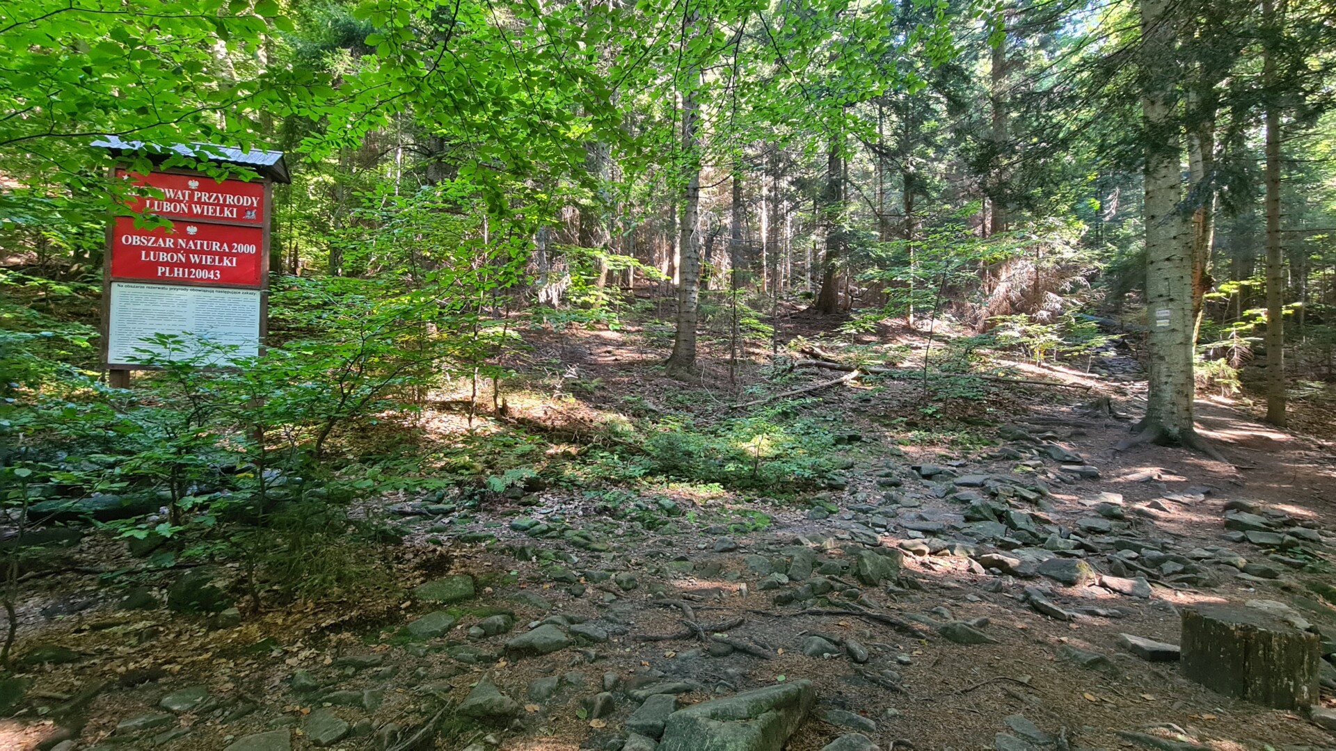 Po krótkim śniadaniu ruszamy z powrotem. Tym razem niebiesko-zielonym szlakiem, aby nie wracać po swoich śladach – choć perspektywa ponownego spotkania z Głoborzem w dniu z taką widocznością kusi. Nie pomylcie szlaków, bo niebiesko-zielony na południe prowadzi do Rabki Zaryte, ale sam niebieski na zachód przez Luboń Mały w kierunku Jordanowa! Szlak prowadzi cały czas przez las i na odcinku 2,9 km nachyla się średnio 18%, więc kolana i stopy będą pracować. Ostatnie 600m na parking przeprowadzi Was wzdłuż łąk, zabudowy i przez Drogę Krajową praktycznie tuż obok miejsca, w których wchodziliście na żółty szlak. Wejście na szczyt zajęło nam 2 godziny, zejście zdecydowanym tempem niecałą godzinę.