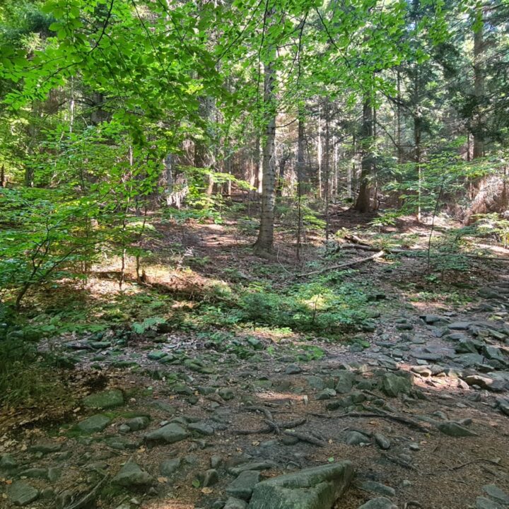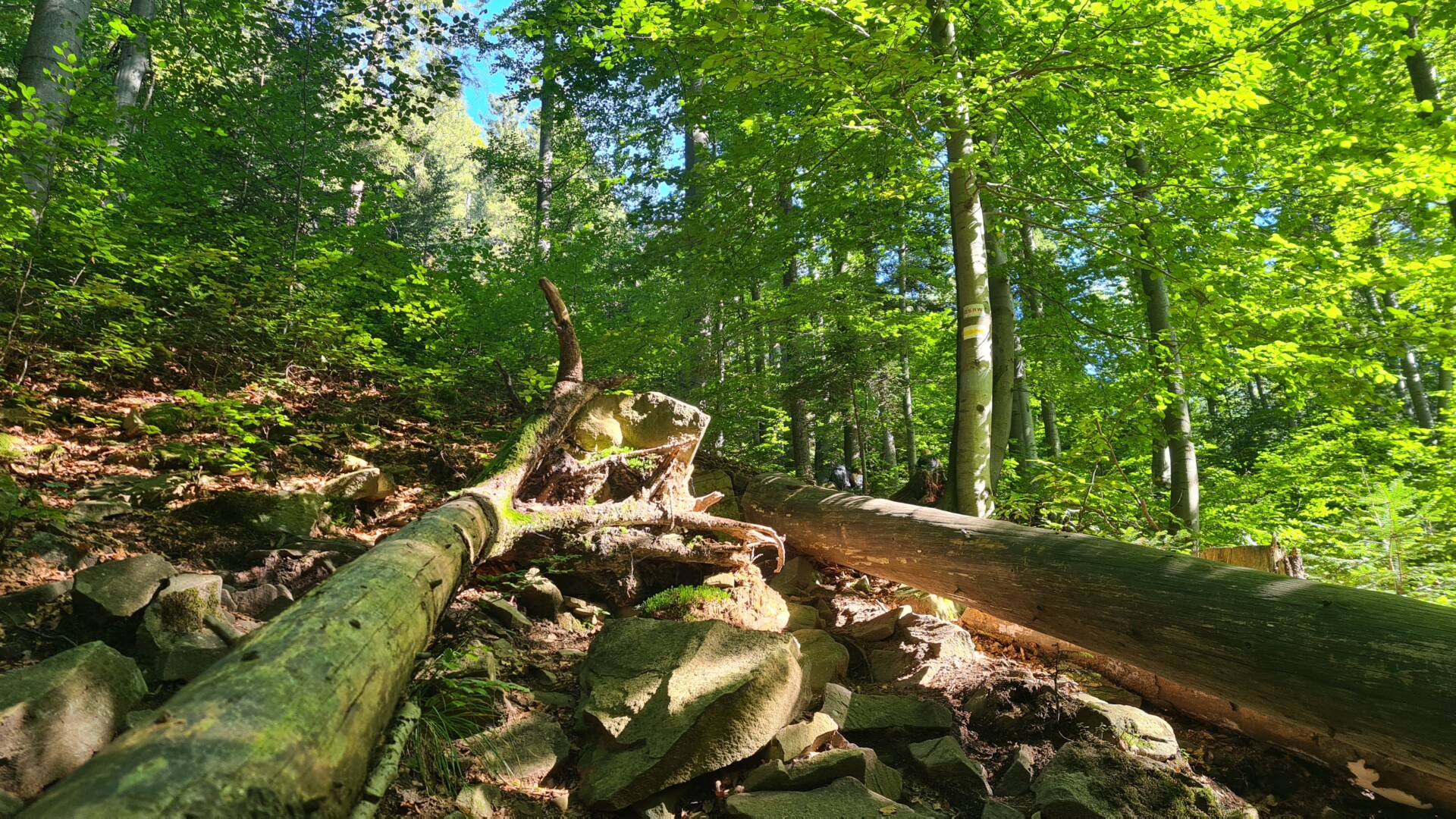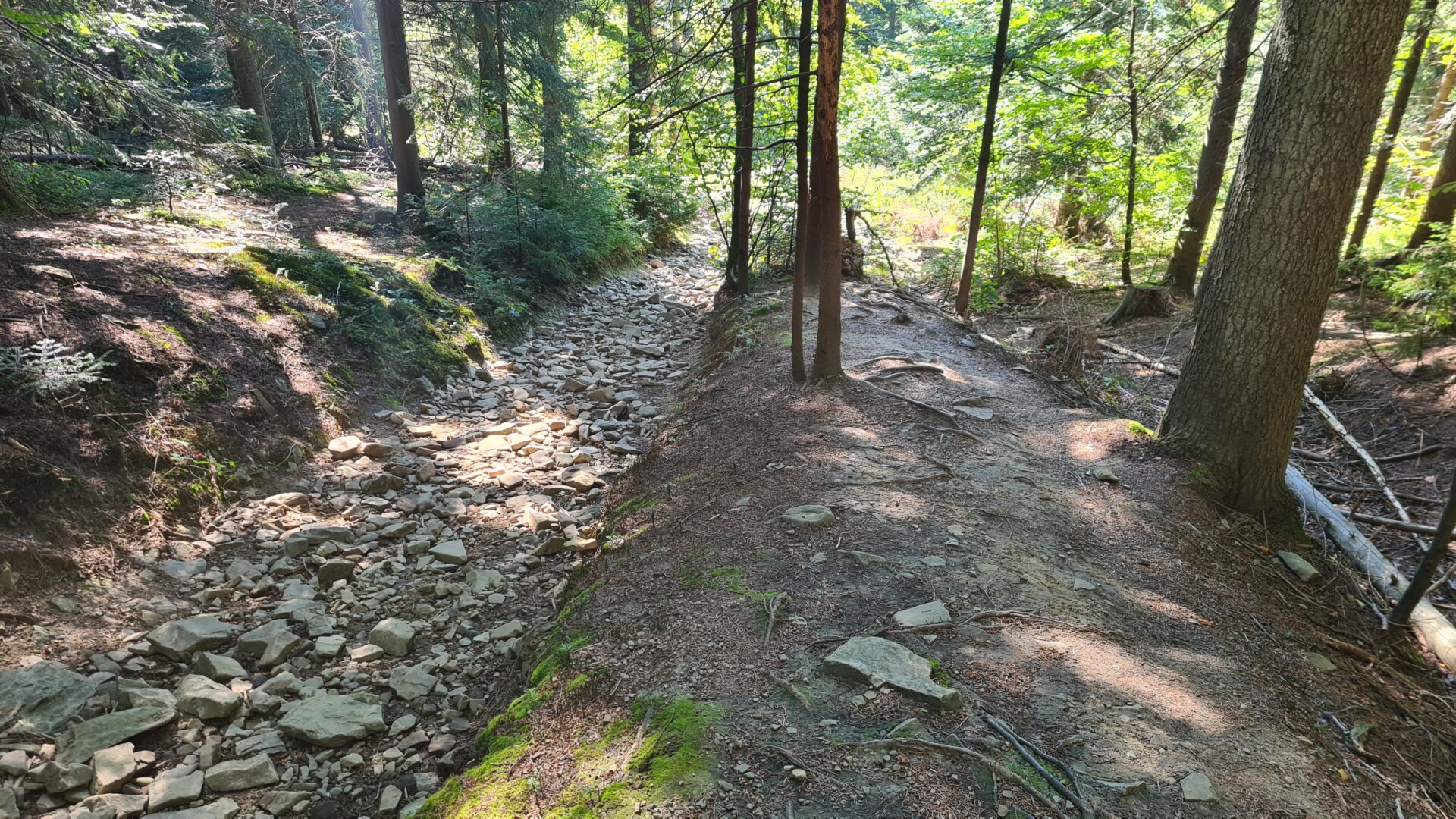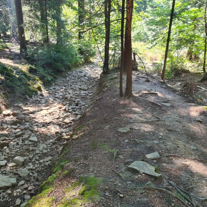🔹 Ekspozycja: niska. Perć Borkowskiego prowadzi tylko przez fragment przez bardziej stromy, kamienisty odcinek, ale brak przepaści czy wąskich grani. Szlak biegnie w lesie, co ogranicza poczucie otwarcia przestrzeni.