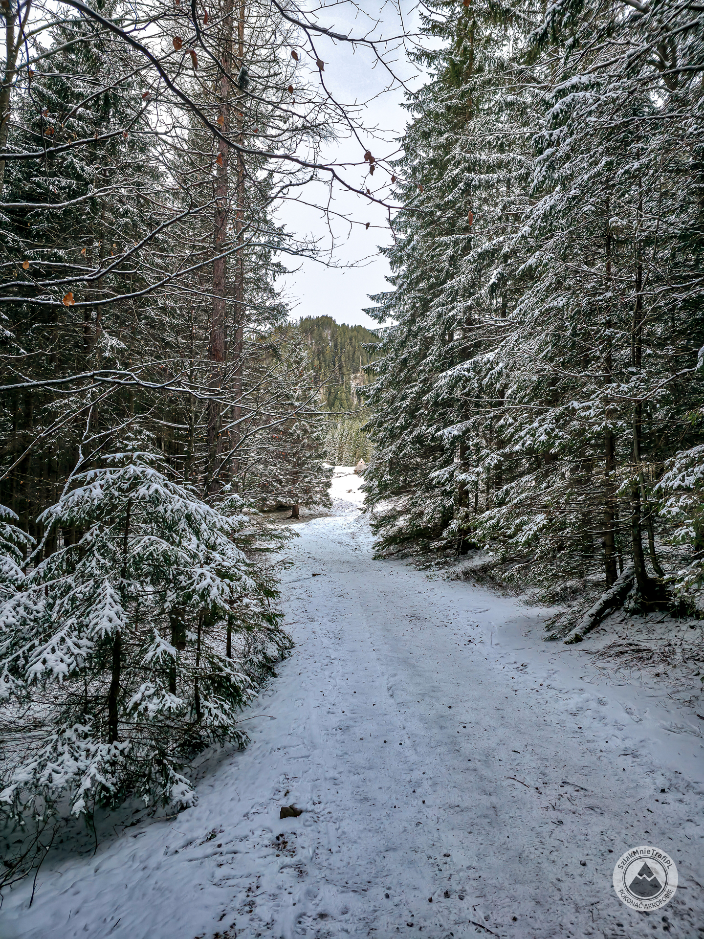 Ku mojej radości bardzo prosty i łagodny szlak na Kalatówki miał w pełni zimową oprawę, a budzące się niebo zaczynało czarować nieśmiałym błękitem. Zanim się obejrzałem, w ciągu dwudziestu minut dotarłem na skraj Polany Kalatówki, mijając po drodze Klasztor Albertynek oraz odbicie żółtym szlakiem do Klasztoru Albertynów na Śpiącej Górze.