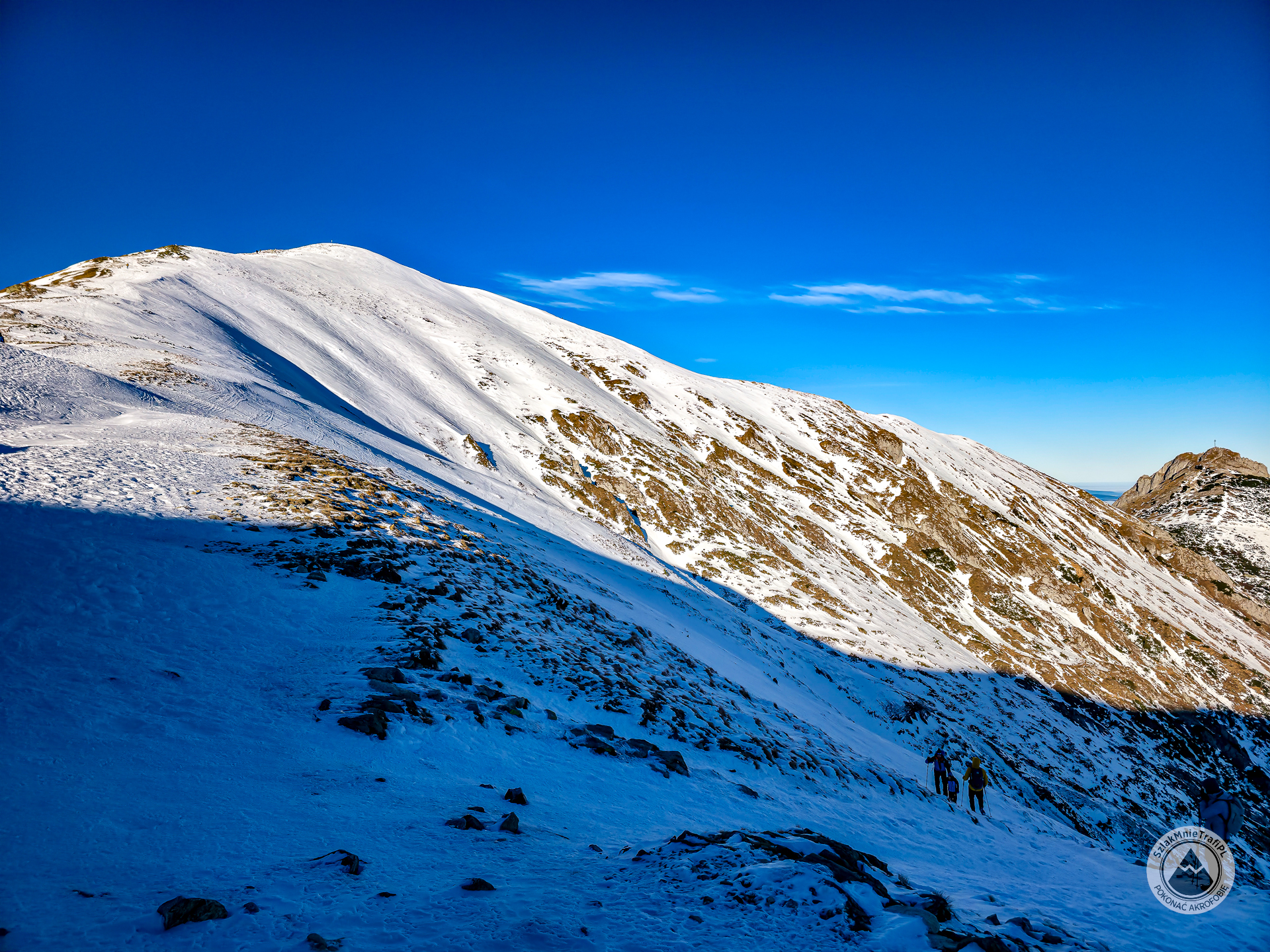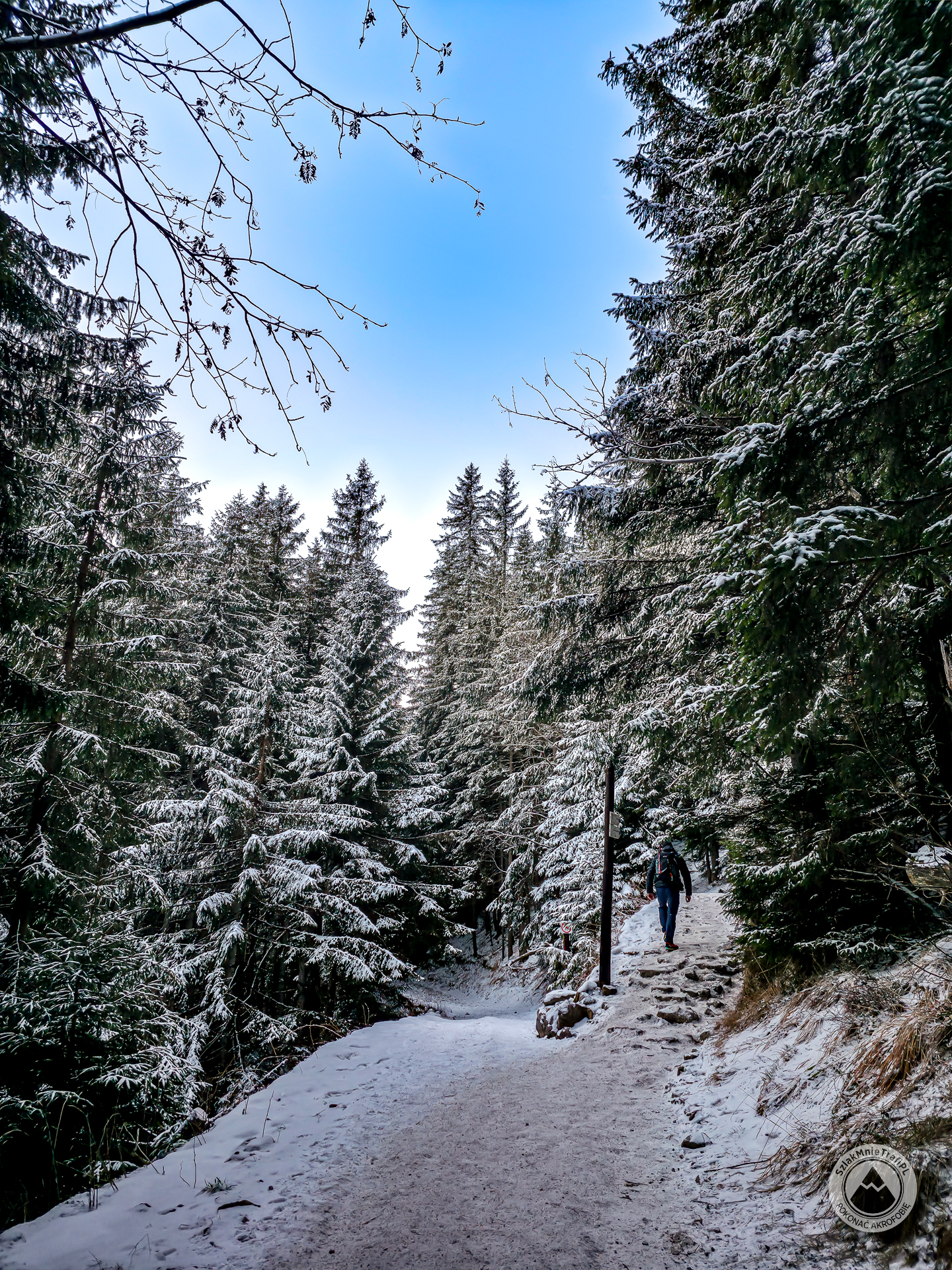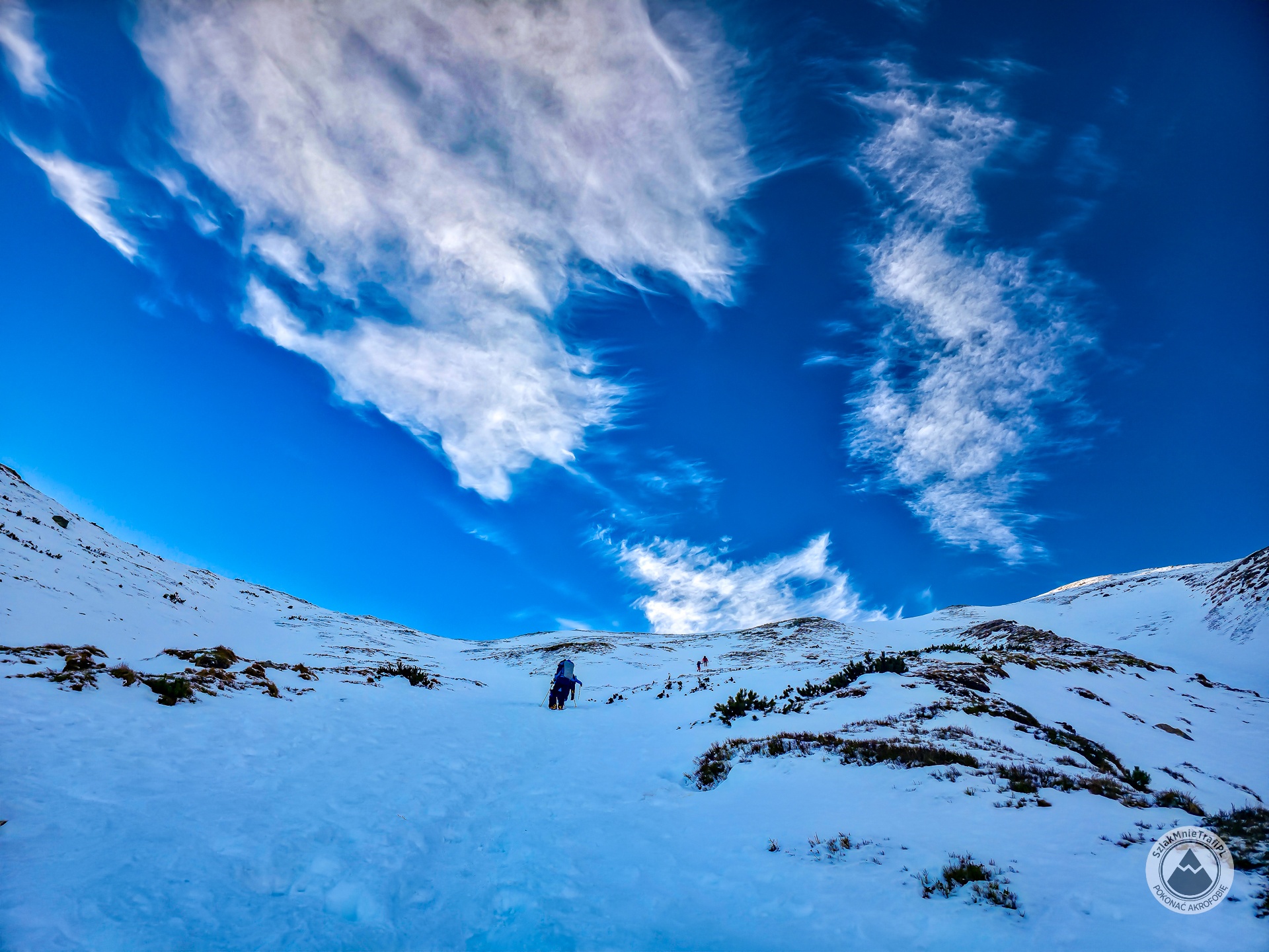 Przebieg szlaku był czytelny, śnieg ubity, twardy i zwarty, więc po założeniu raków pokonywanie kolejnych metrów nie sprawiało większych problemów technicznych. Nie zmienia to jednak faktu, że do przejścia pozostaje około 1200 metrów szlaku i ponad 350 metrów przewyższenia, co daje średnie nachylenie rzędu 30%. Miejscami nachylenie sięgało znacznie więcej, a czasu na spokojny oddech było niewiele.