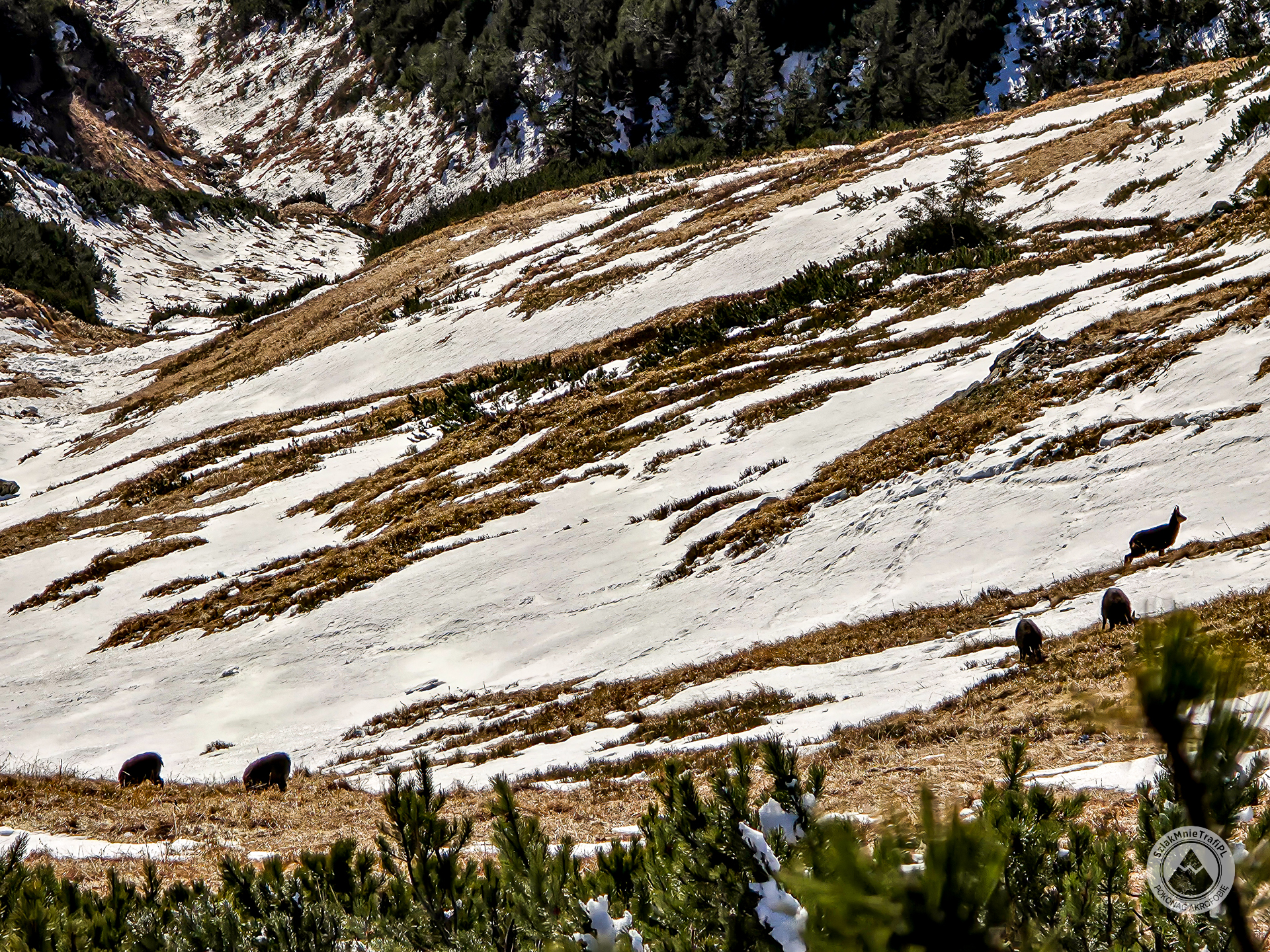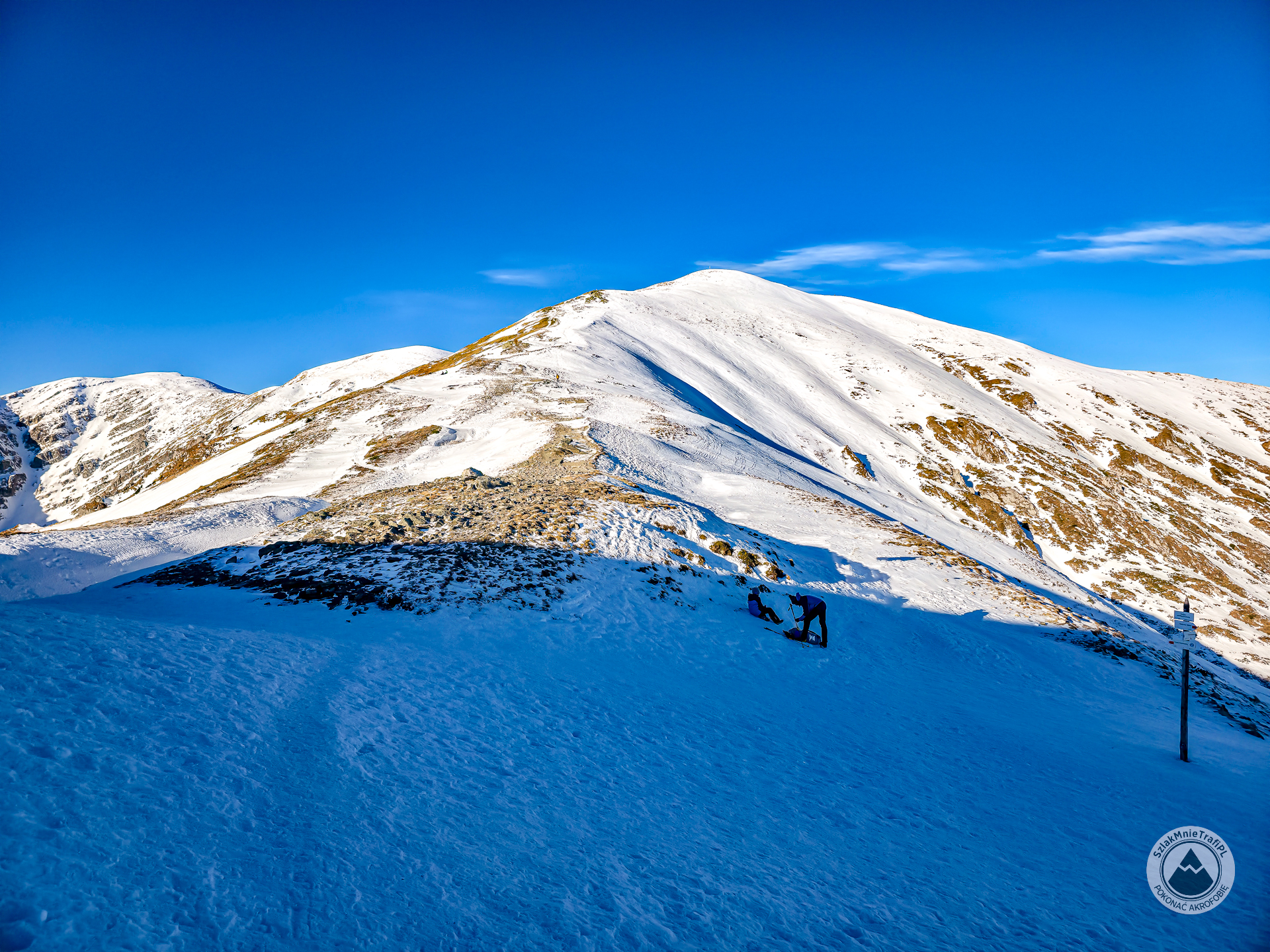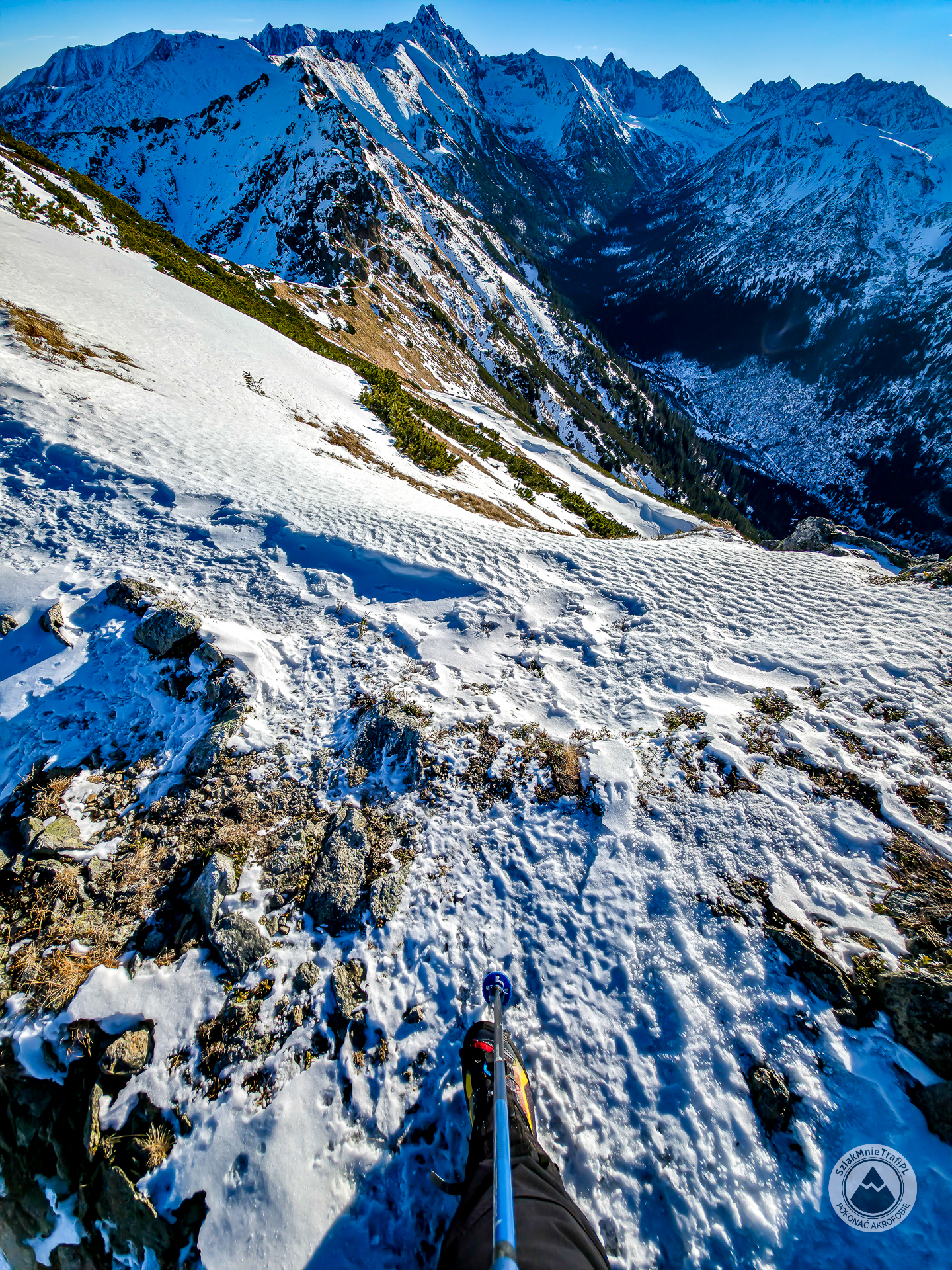 Przebieg szlaku był czytelny, śnieg ubity, twardy i zwarty, więc po założeniu raków pokonywanie kolejnych metrów nie sprawiało większych problemów technicznych. Nie zmienia to jednak faktu, że do przejścia pozostaje około 1200 metrów szlaku i ponad 350 metrów przewyższenia, co daje średnie nachylenie rzędu 30%. Miejscami nachylenie sięgało znacznie więcej, a czasu na spokojny oddech było niewiele.