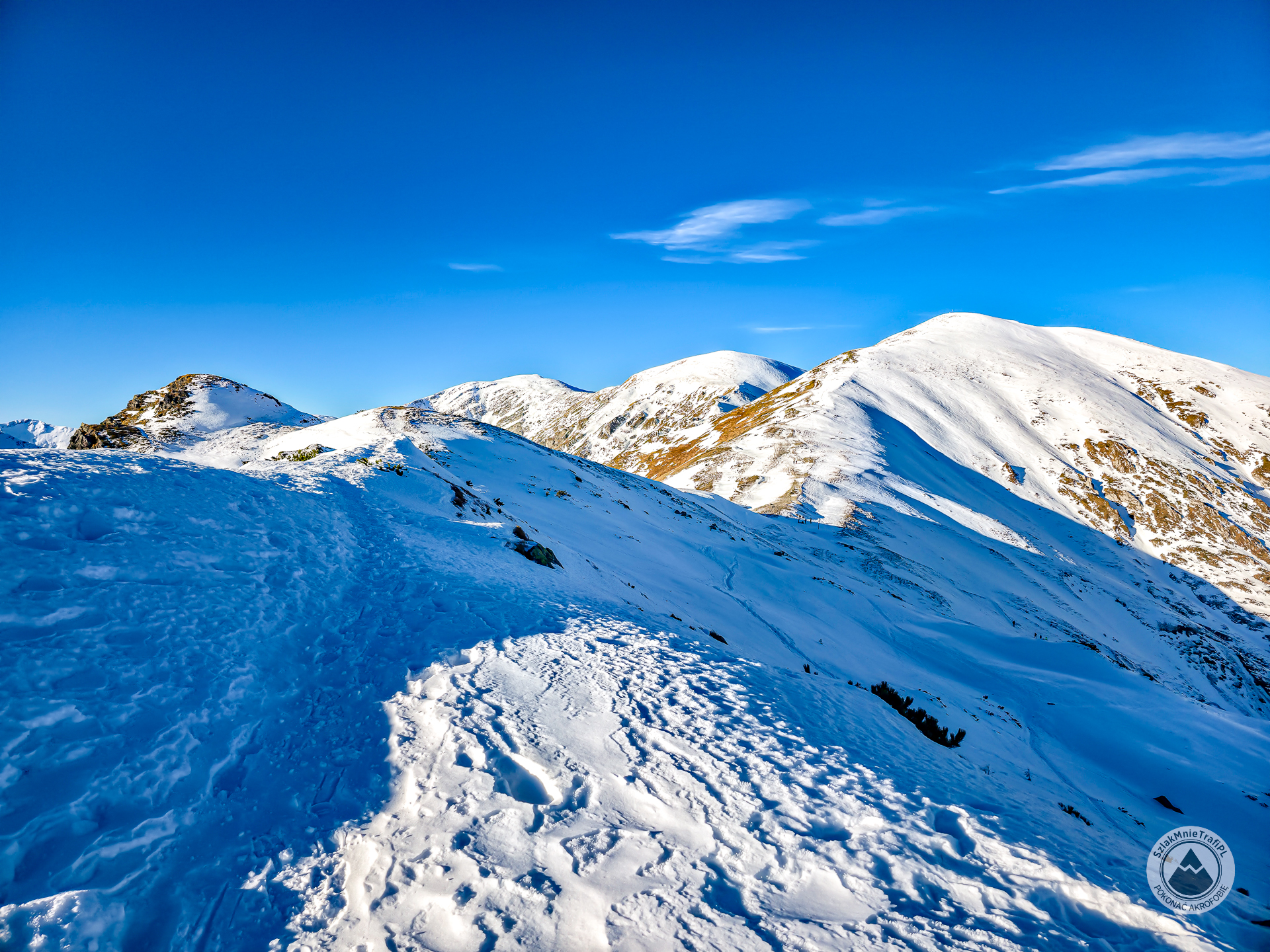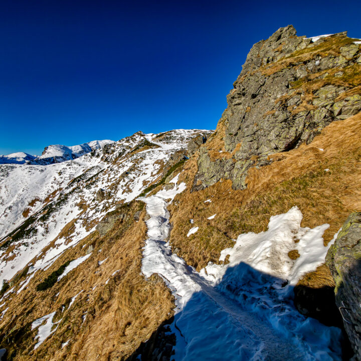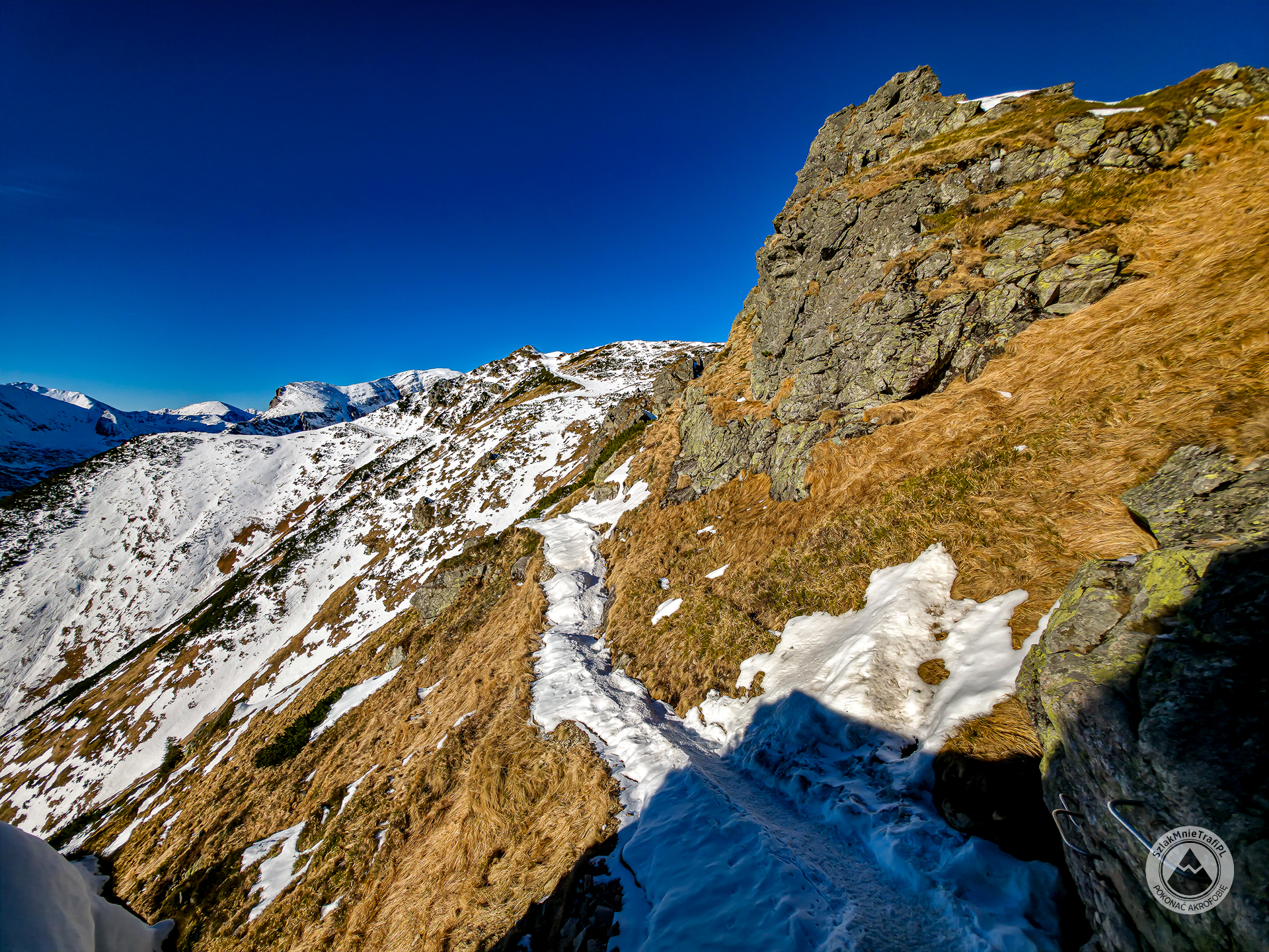 Zimowa odsłona tego odcinka, choć przebieg szlaku pozostaje ten sam co latem, jest zupełnie innym doświadczeniem. Biel śniegu pokrywająca zbocza dodaje surowości, a miejscami szlak, który w sezonie letnim nie stanowi żadnego problemu nawigacyjnego, staje się zagadką odkrywaną krok po kroku.