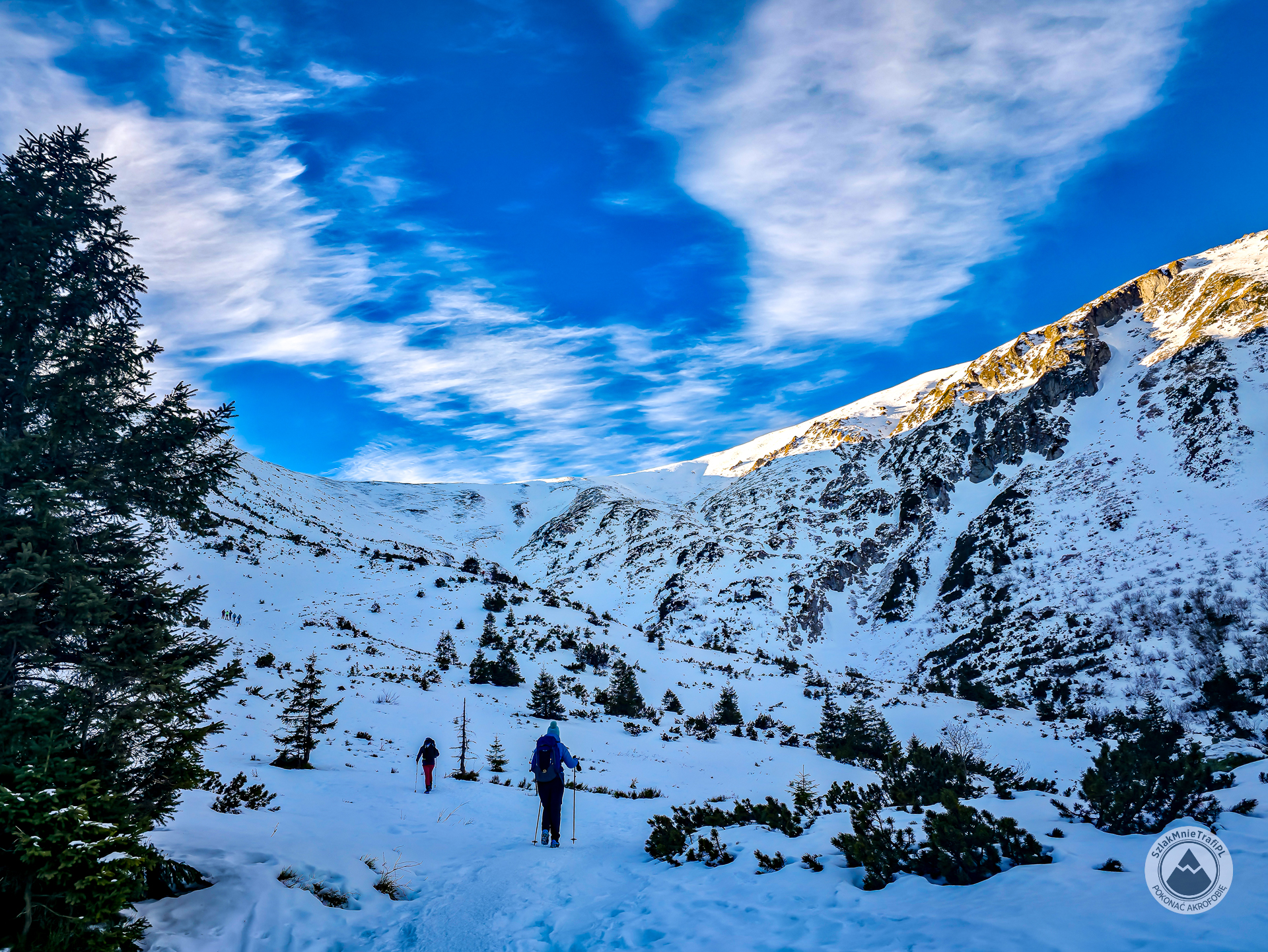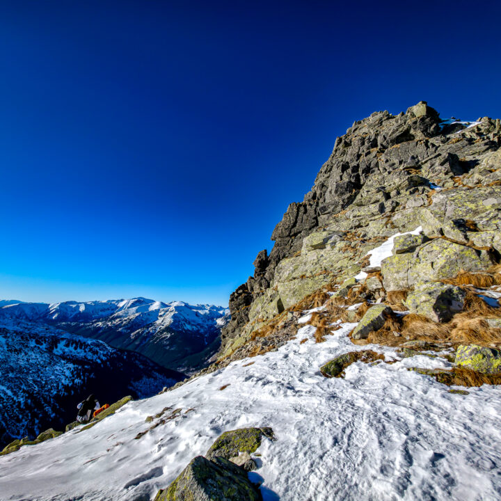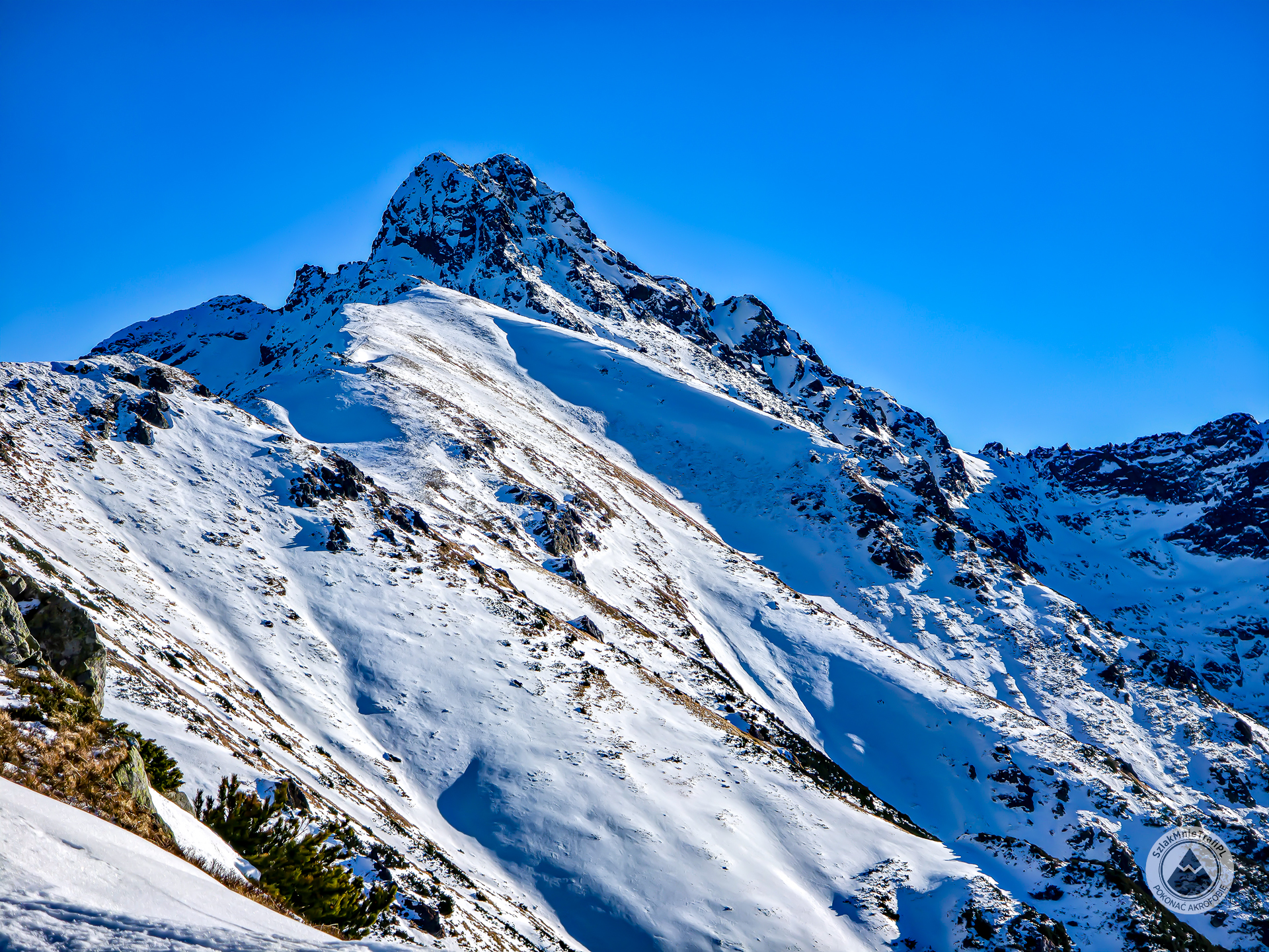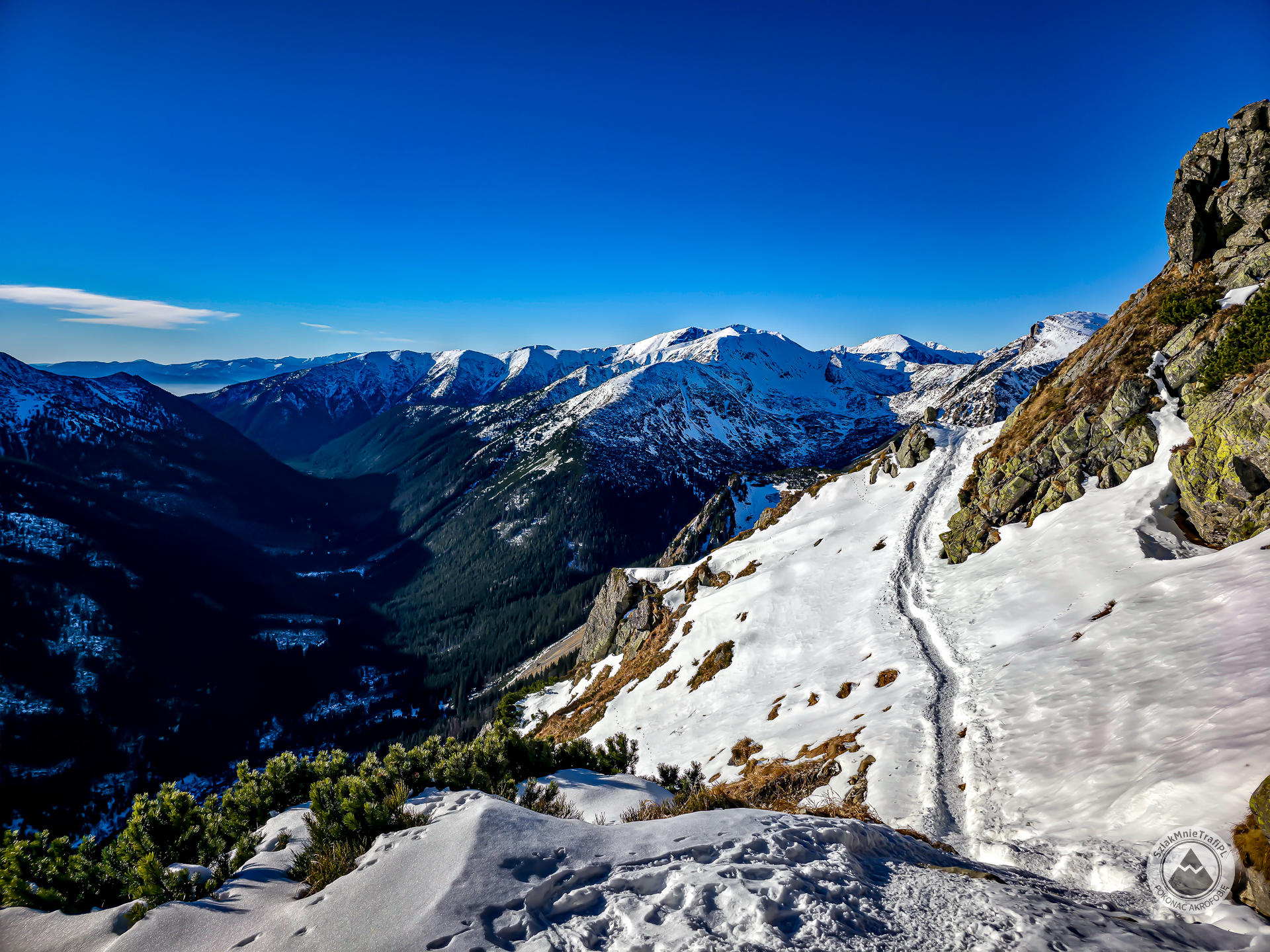 Zimowa odsłona tego odcinka, choć przebieg szlaku pozostaje ten sam co latem, jest zupełnie innym doświadczeniem. Biel śniegu pokrywająca zbocza dodaje surowości, a miejscami szlak, który w sezonie letnim nie stanowi żadnego problemu nawigacyjnego, staje się zagadką odkrywaną krok po kroku.