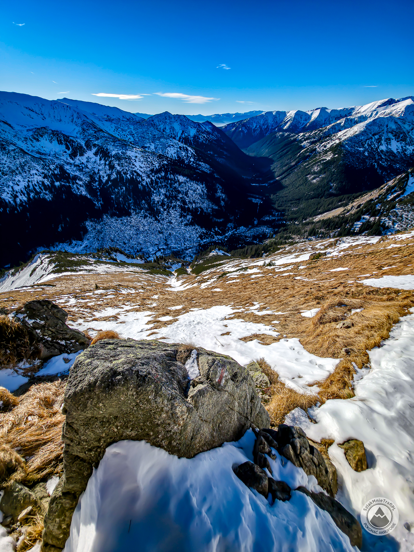 Czułem już także zmęczenie fizyczne. Choć licznik pokazywał raptem jedenaście kilometrów, zimowe warunki robią swoje — każdy kilometr w rakach męczy wyraźnie bardziej. Po dwudziestu pięciu minutach dotarłem na Przełęcz Liliowe, gdzie po raz ostatni mogłem spojrzeć w dół w kierunku Cichej Doliny Liptowskiej. W tym miejscu dolina rozdziela się na Dolinę Walentkową i Dolinę Wierchcichą, co zawsze robi na mnie duże wrażenie.