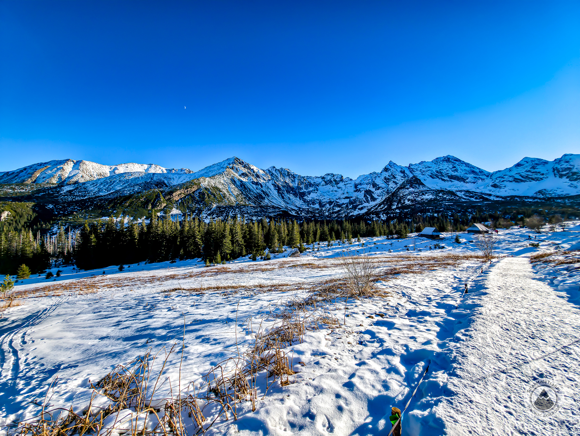 Pierwszy kilometr to w zasadzie płaski spacer przez Polanę i Dolinę Kondratową, cały czas z widokiem na cel. Dopiero w okolicach 1500 m n.p.m. szlak zaczyna nachylać się wyraźniej. W zimowych warunkach był to dla mnie ostatni sensowny moment na założenie raków, co też zrobiłem, choć większość mijanych turystów poruszała się wyłącznie w raczkach.