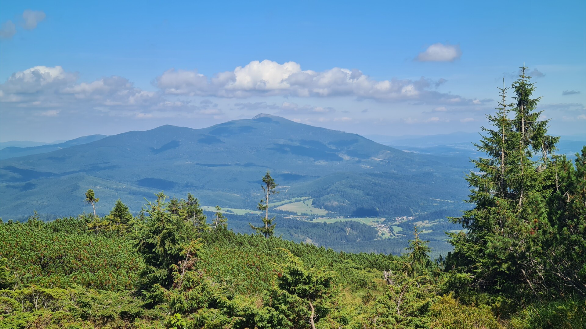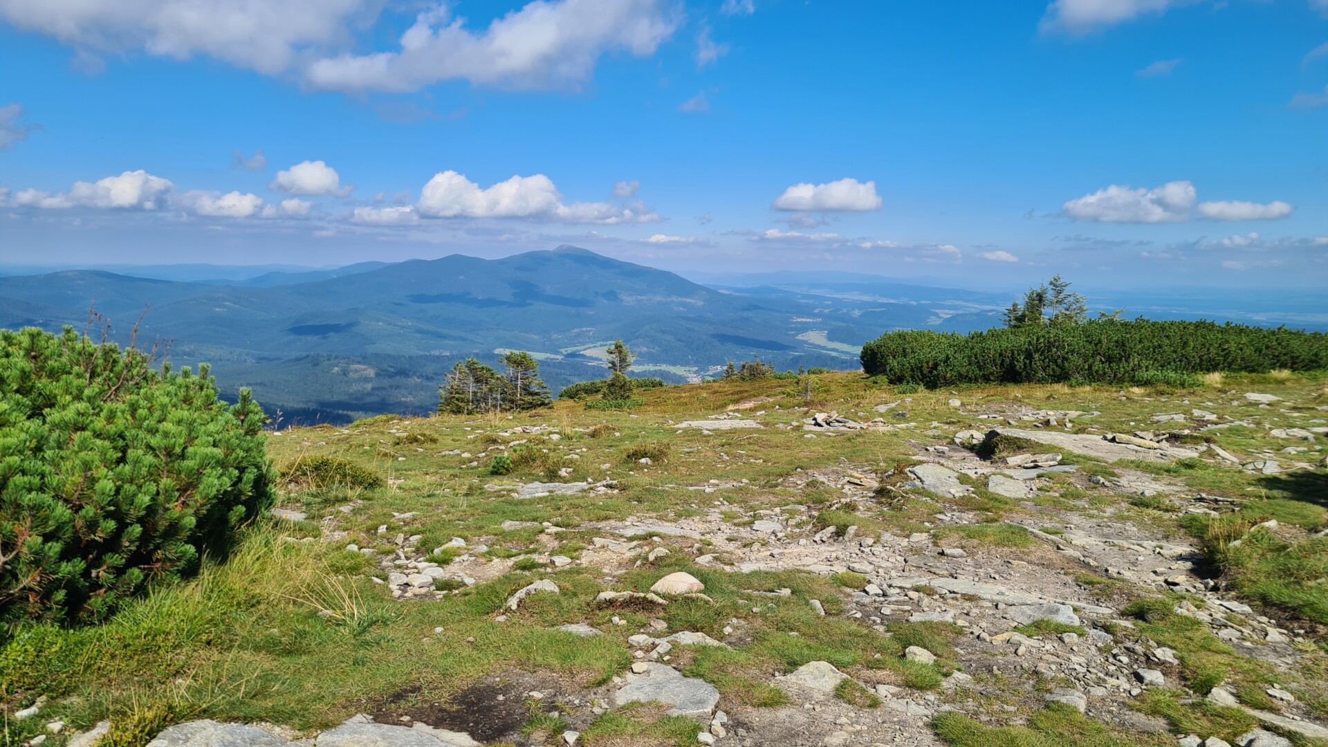 Po około 4,5 km i 1:15h zameldowałem się na Górze Pięciu Kopców (1535 m n.p.m.). Tabliczka z napisem „Pilsko Hranica” może wprowadzać w błąd, bo Pilsko znajduje się nieco dalej, na południe – zielonym szlakiem w stronę słowackiej strony, przez kosodrzewinę, jakieś 5 minut marszu.