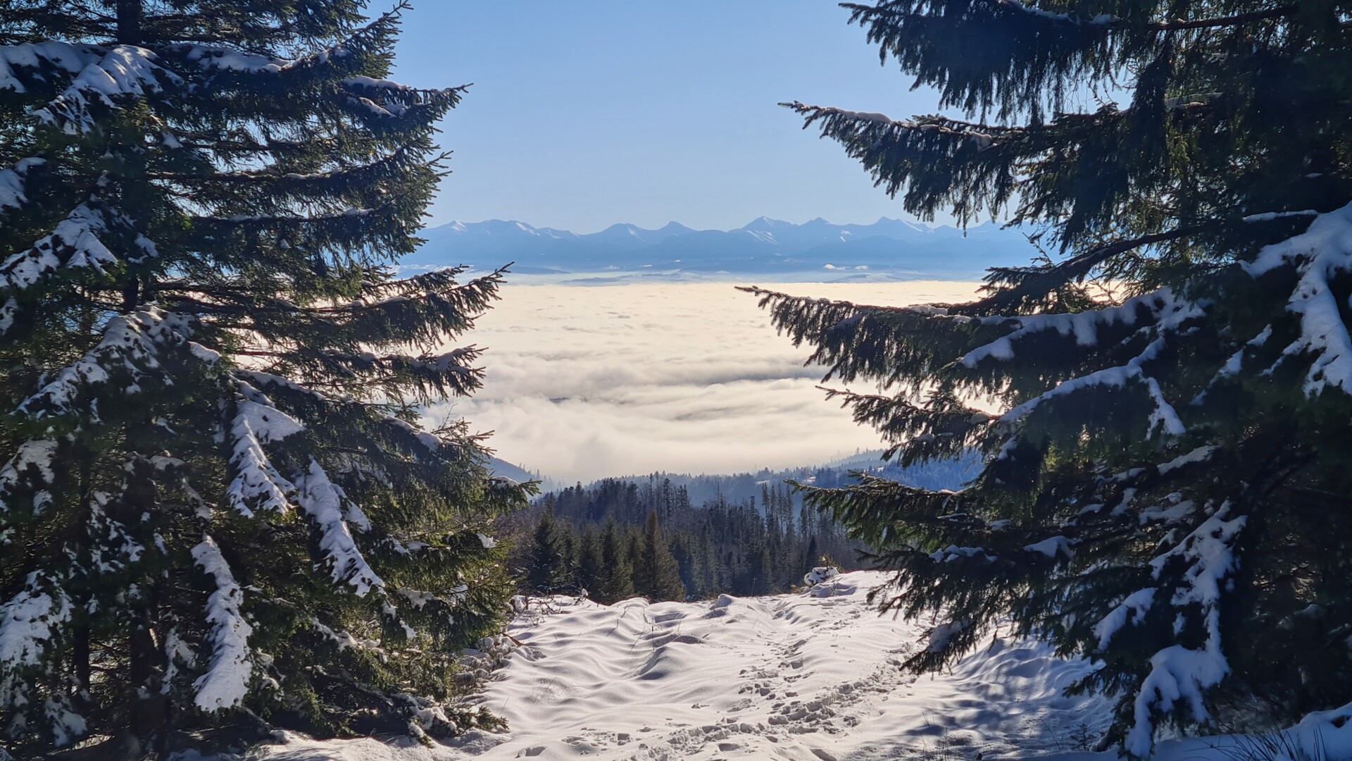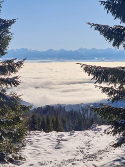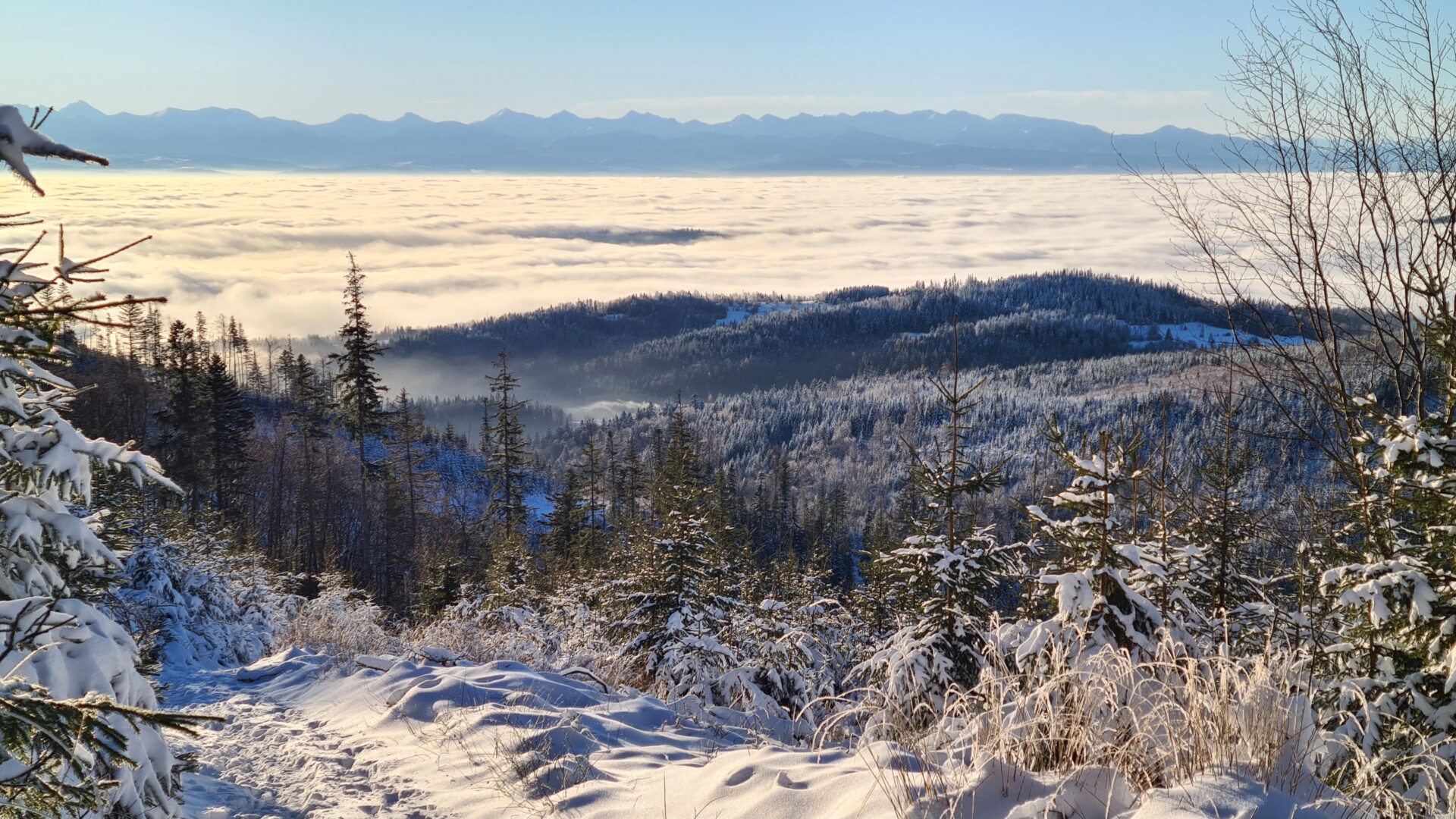 Wystartowałem z niewielkiego, darmowego parkingu przy Ciśniawce (Wielka Polana, Sidzina) tuż przed 8:00 rano. Miejsca było jeszcze sporo. Czarny szlak prowadzi przez większość trasy wąskimi leśnymi ścieżkami i miejscami szeroką drogą leśną, z której tego dnia można było dostrzec Tatry wynurzające się z morza mgieł. Szlak na odcinku do rozejścia pod Halą Krupową ma 2,5 km długości i średnie nachylenie 15%, nigdzie nieprzekraczające 30%. Dzięki temu podejście jest równe i łatwo złapać rytm marszu.