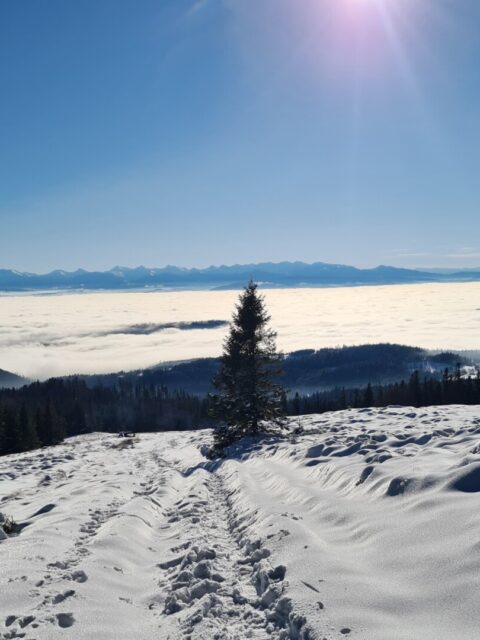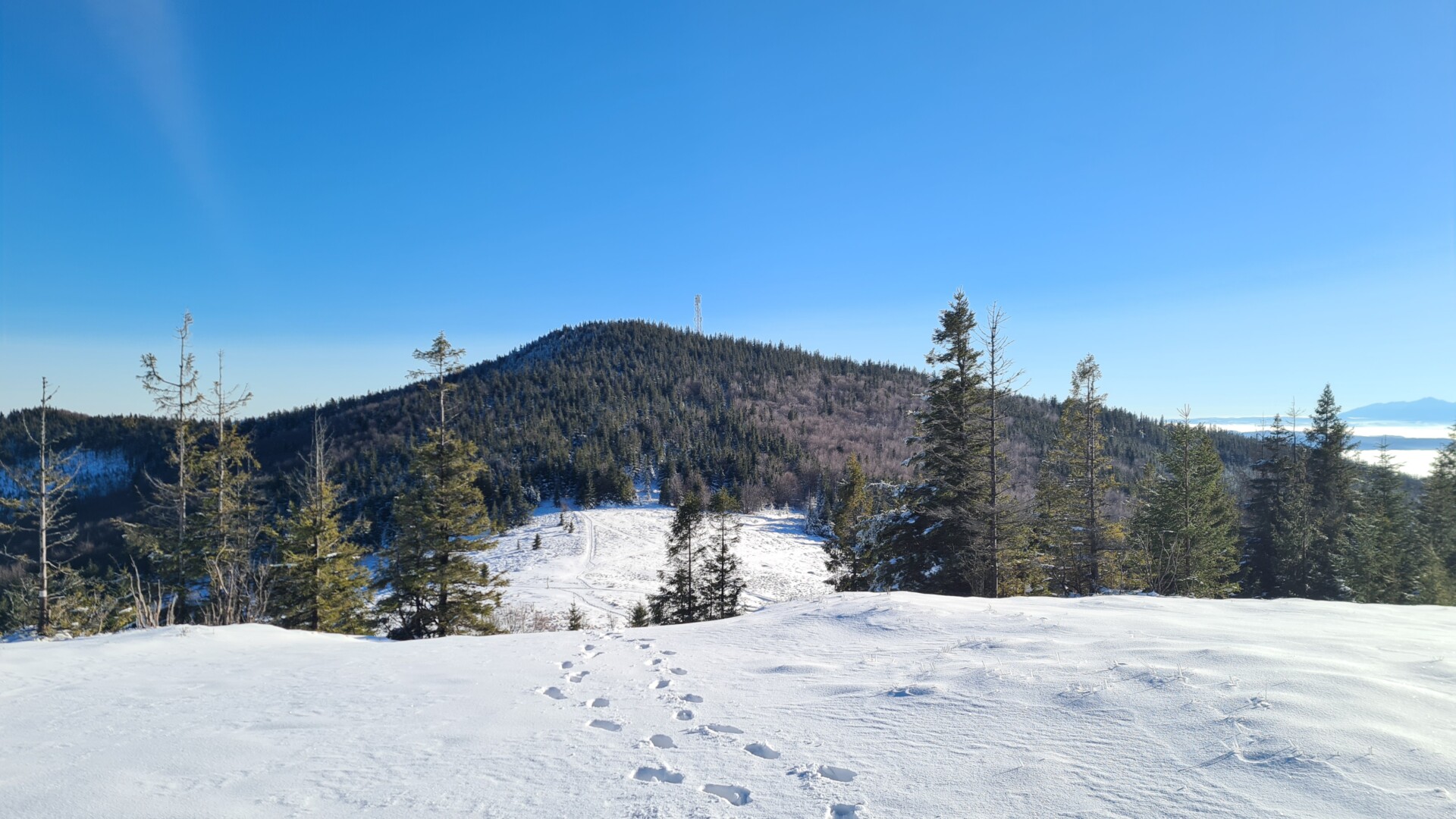 Kolejnym celem była Okrąglica (1239 m n.p.m.), na którą łatwo dostać się z czerwonego szlaku. Przedtem jednak odbiłem w bok i przebrnąłem przez śnieg po kolana, by wejść na Kocią Łapę (1182 m n.p.m.) — szczyt górujący nad Przełęczą Kucałowską.