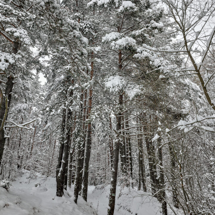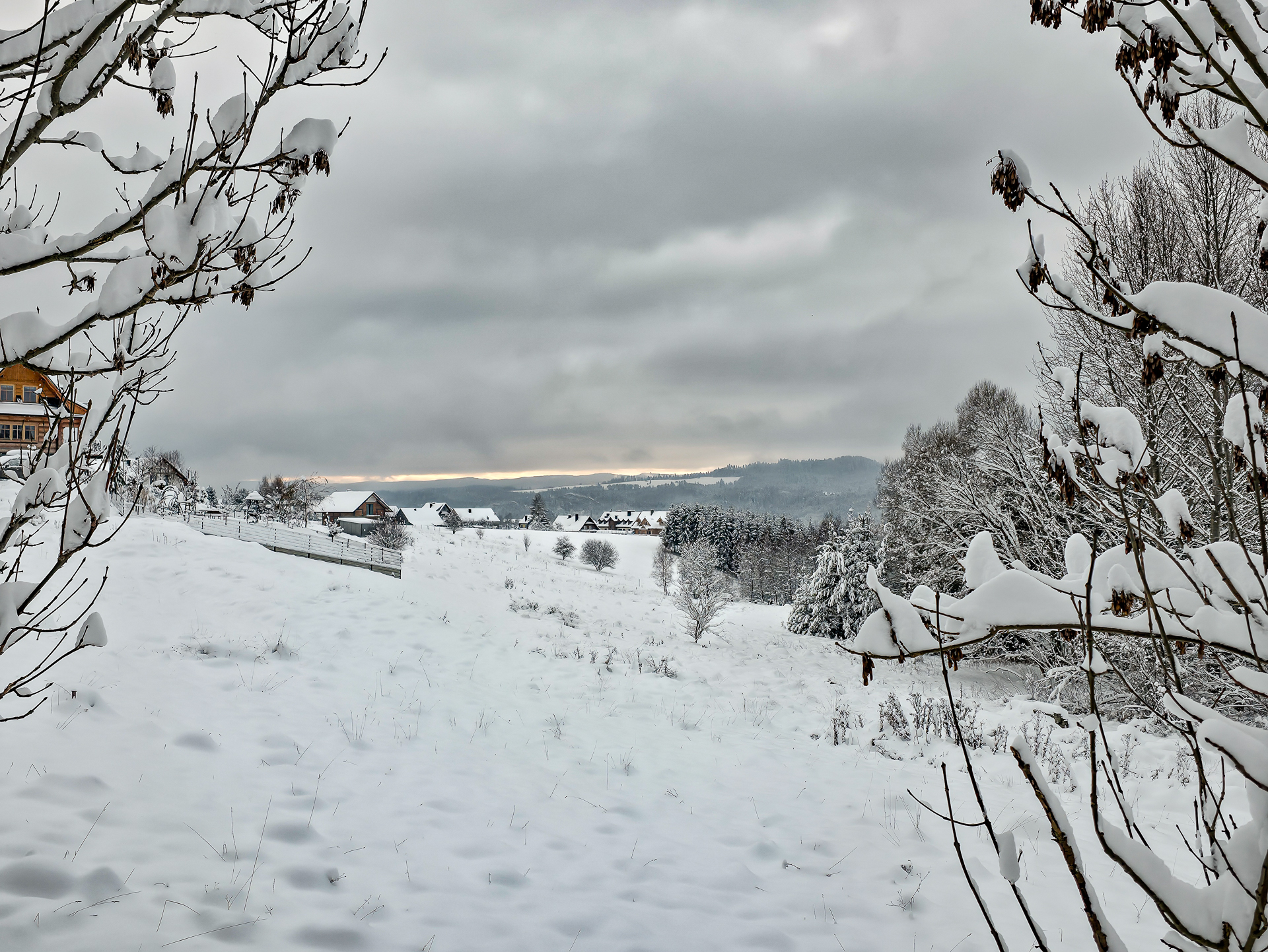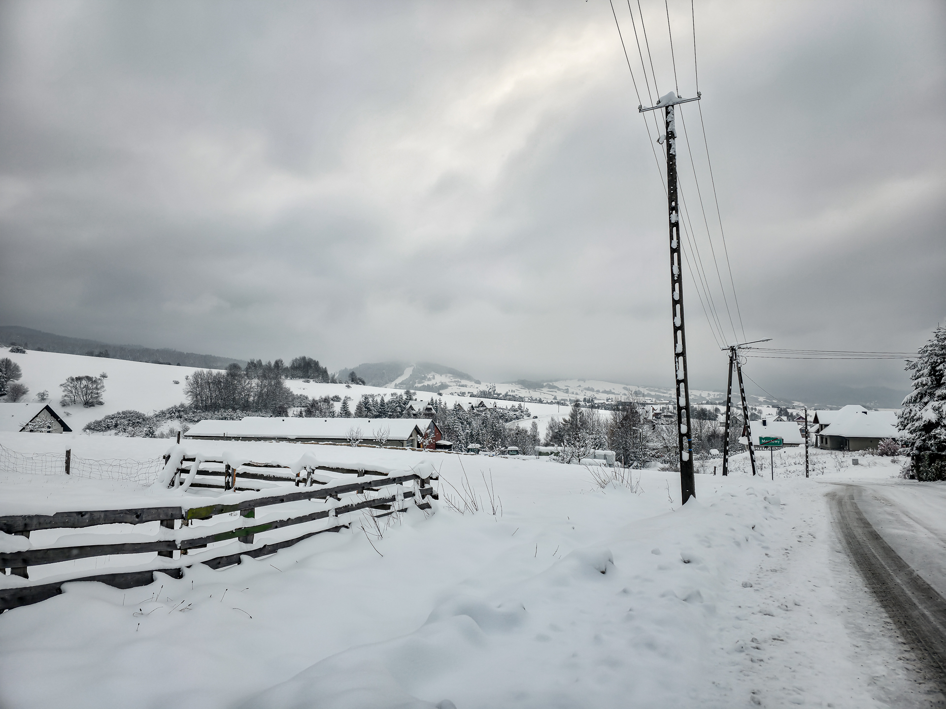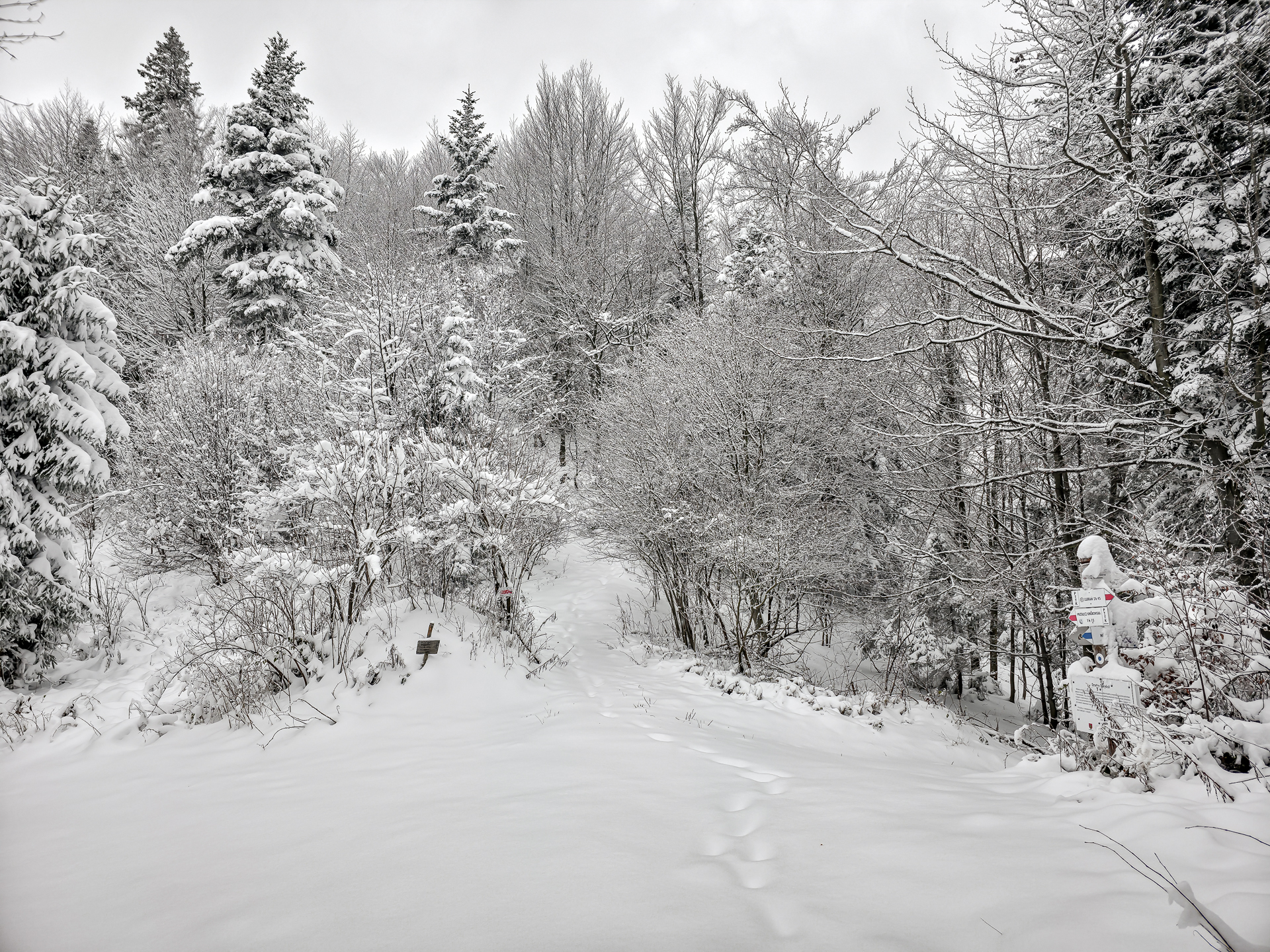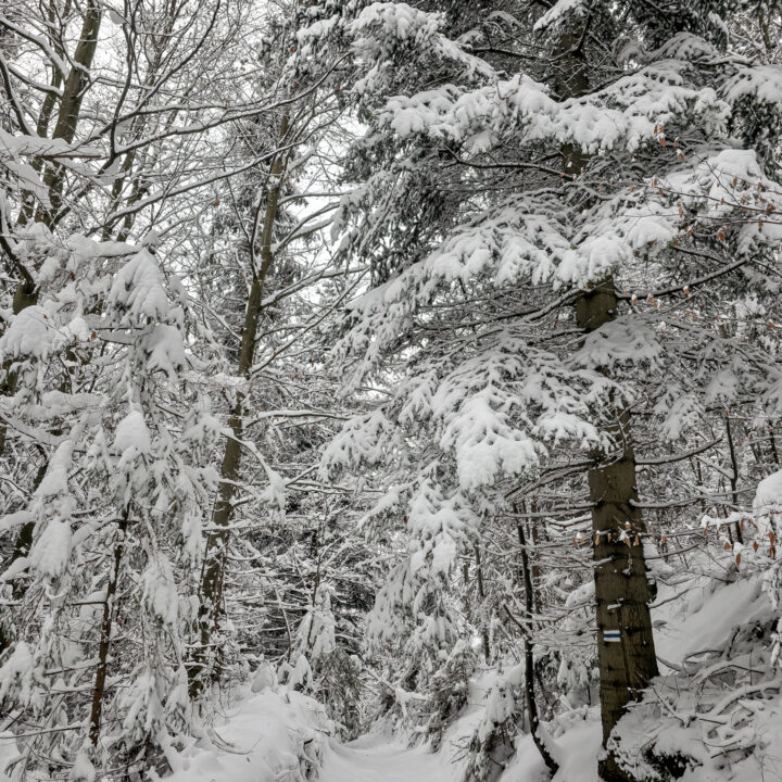 Zielony szlak prowadzi przez Maniowy: ulicami Ks. A. Siudy, Gorczańską i Pienińską. Od parkingu przy Biedronce do mostu na granicy Maniowy–Mizerna jest około 2 km. Tuż za mostem szlak odbija z głównej drogi mocnym skosem na północ, obok zabudowań — i naprawdę łatwo to miejsce przeoczyć. Od tego momentu wkroczyłem na całkowicie nieprzetarty teren, brnąc w śniegu do łydek, a miejscami nawet do kolan. Oczywiście byłem zachwycony — śnieg był wszędzie, drzewa uginały się pod jego ciężarem, a choć niebo było pochmurne, panowała jasna, zimowa, nostalgiczna atmosfera.