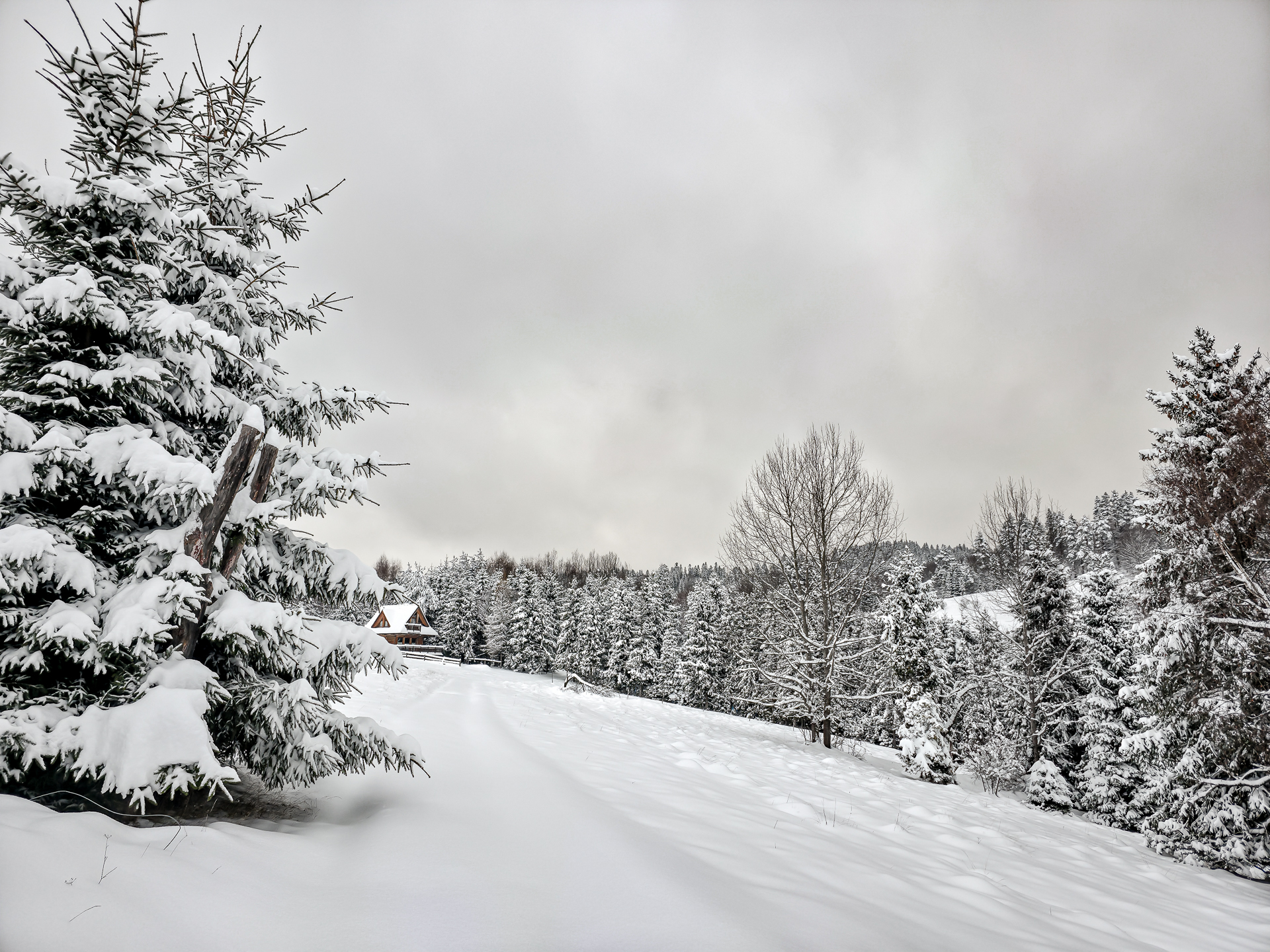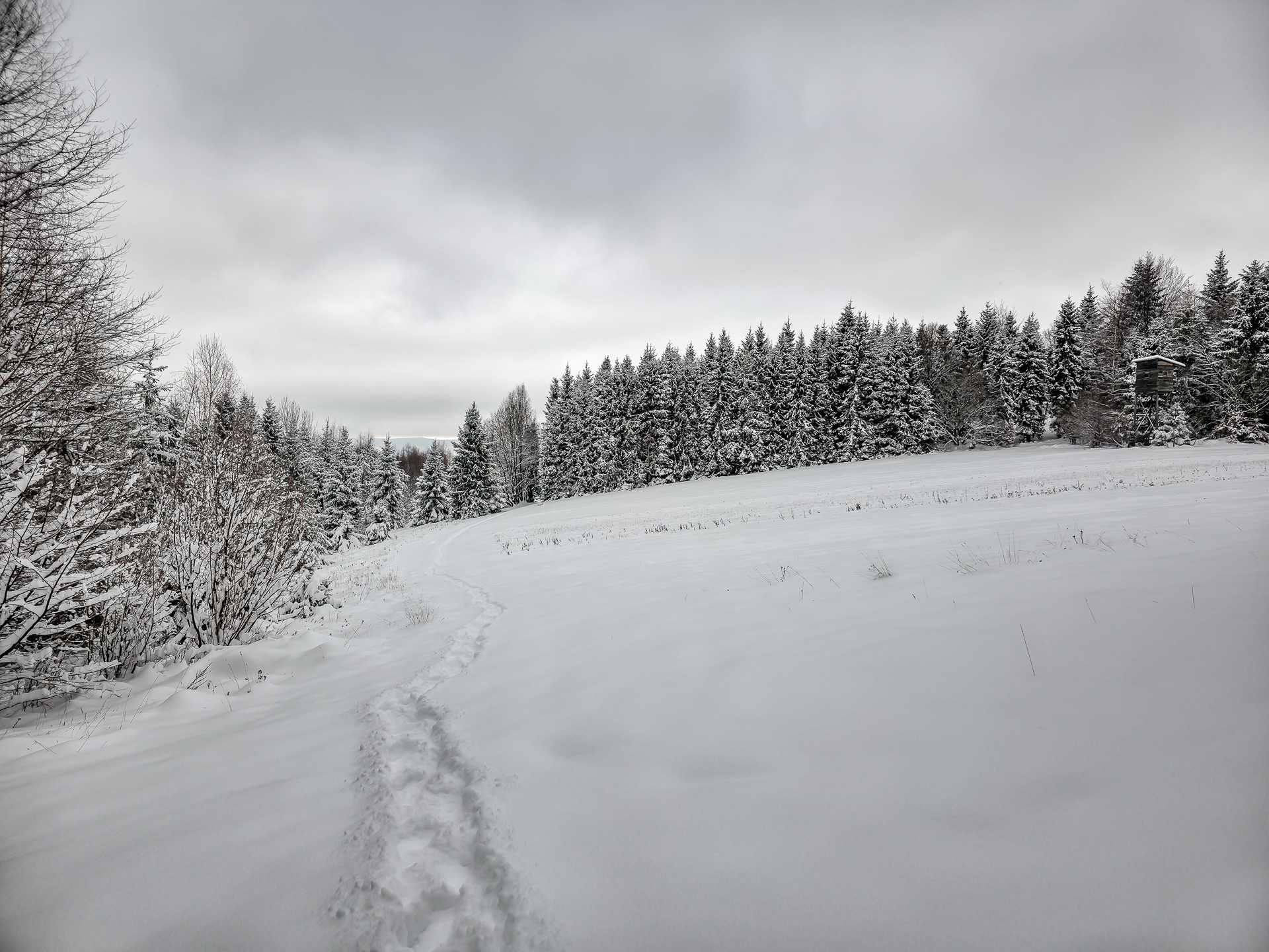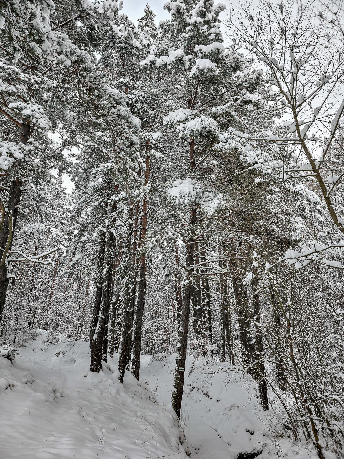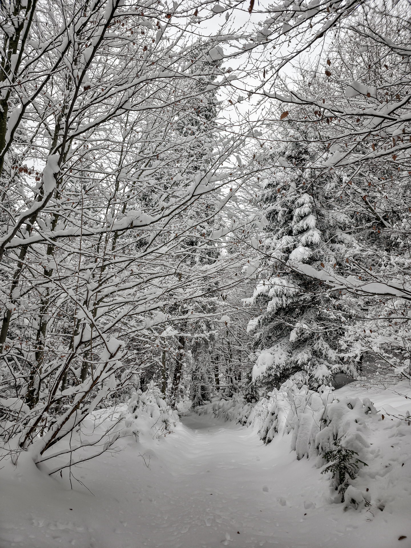 Zielony szlak prowadzi przez Maniowy: ulicami Ks. A. Siudy, Gorczańską i Pienińską. Od parkingu przy Biedronce do mostu na granicy Maniowy–Mizerna jest około 2 km. Tuż za mostem szlak odbija z głównej drogi mocnym skosem na północ, obok zabudowań — i naprawdę łatwo to miejsce przeoczyć. Od tego momentu wkroczyłem na całkowicie nieprzetarty teren, brnąc w śniegu do łydek, a miejscami nawet do kolan. Oczywiście byłem zachwycony — śnieg był wszędzie, drzewa uginały się pod jego ciężarem, a choć niebo było pochmurne, panowała jasna, zimowa, nostalgiczna atmosfera.