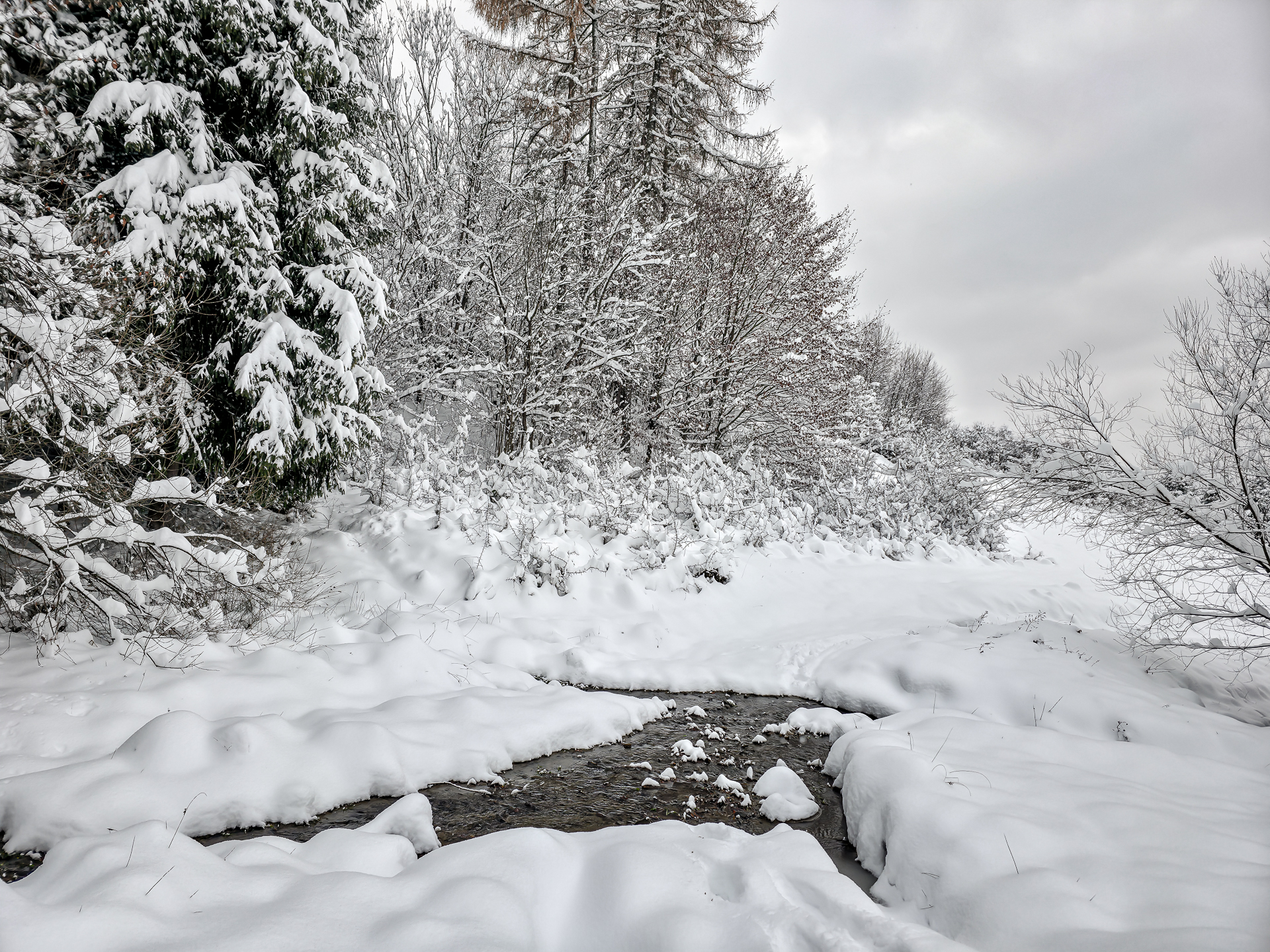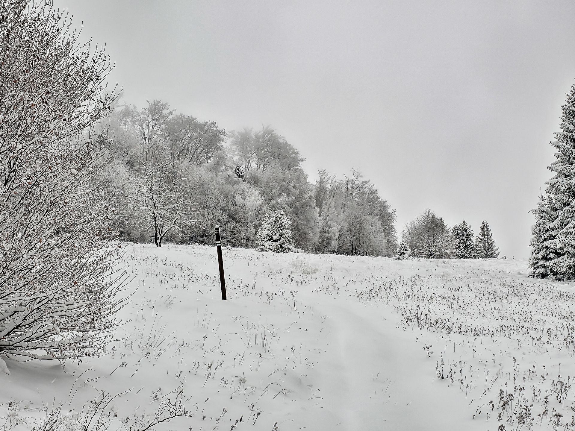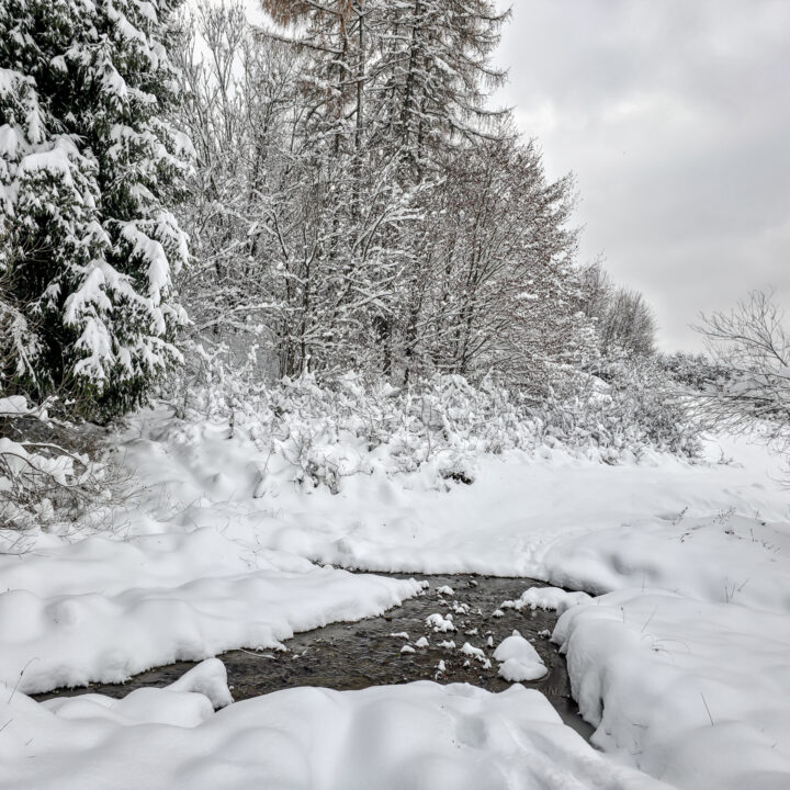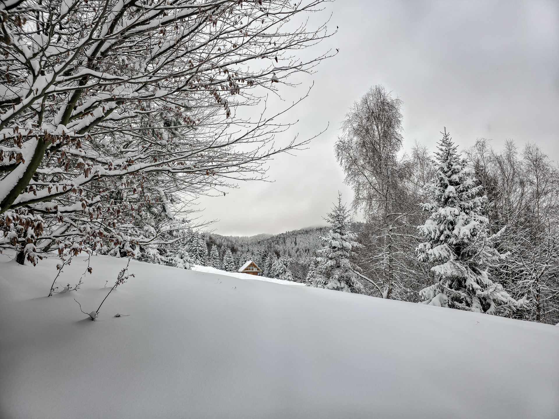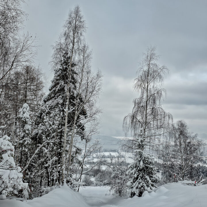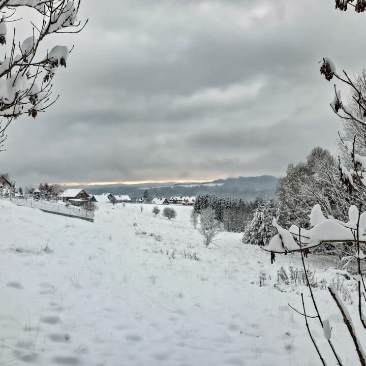 Zielony szlak prowadzi przez Maniowy: ulicami Ks. A. Siudy, Gorczańską i Pienińską. Od parkingu przy Biedronce do mostu na granicy Maniowy–Mizerna jest około 2 km. Tuż za mostem szlak odbija z głównej drogi mocnym skosem na północ, obok zabudowań — i naprawdę łatwo to miejsce przeoczyć. Od tego momentu wkroczyłem na całkowicie nieprzetarty teren, brnąc w śniegu do łydek, a miejscami nawet do kolan. Oczywiście byłem zachwycony — śnieg był wszędzie, drzewa uginały się pod jego ciężarem, a choć niebo było pochmurne, panowała jasna, zimowa, nostalgiczna atmosfera.
