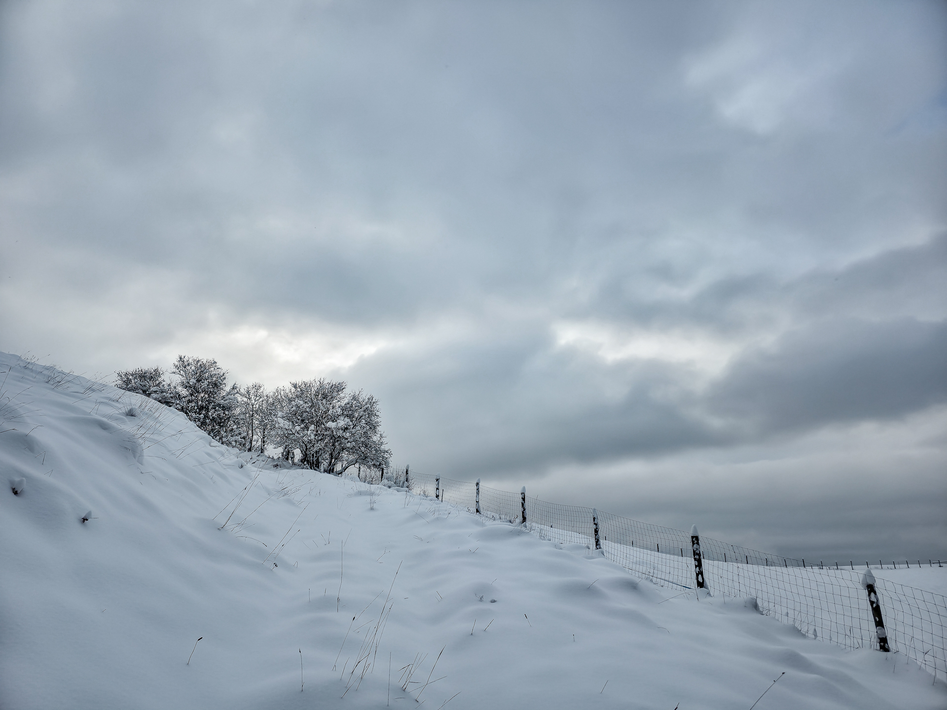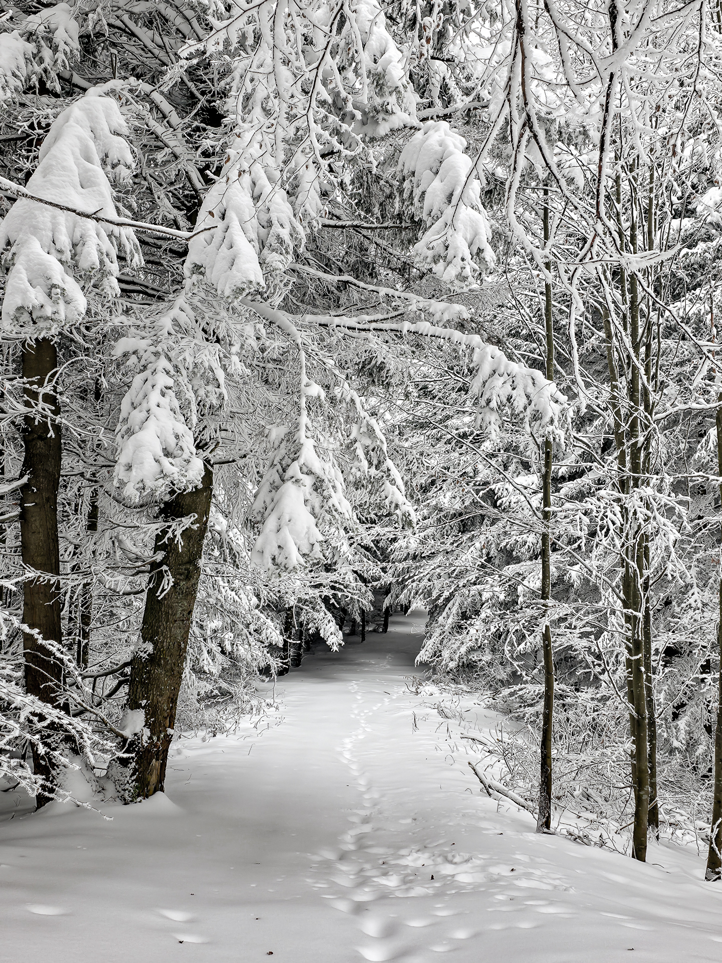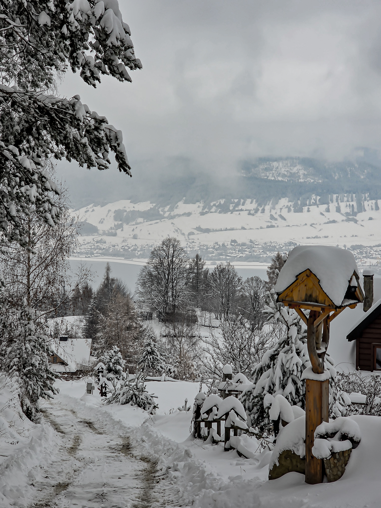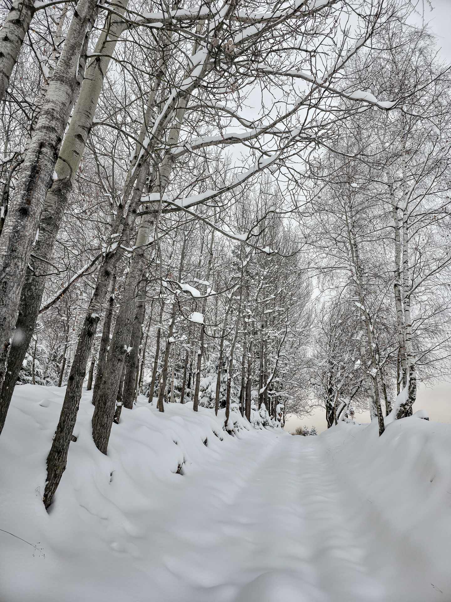 Zielony szlak prowadzi przez Maniowy: ulicami Ks. A. Siudy, Gorczańską i Pienińską. Od parkingu przy Biedronce do mostu na granicy Maniowy–Mizerna jest około 2 km. Tuż za mostem szlak odbija z głównej drogi mocnym skosem na północ, obok zabudowań — i naprawdę łatwo to miejsce przeoczyć. Od tego momentu wkroczyłem na całkowicie nieprzetarty teren, brnąc w śniegu do łydek, a miejscami nawet do kolan. Oczywiście byłem zachwycony — śnieg był wszędzie, drzewa uginały się pod jego ciężarem, a choć niebo było pochmurne, panowała jasna, zimowa, nostalgiczna atmosfera.