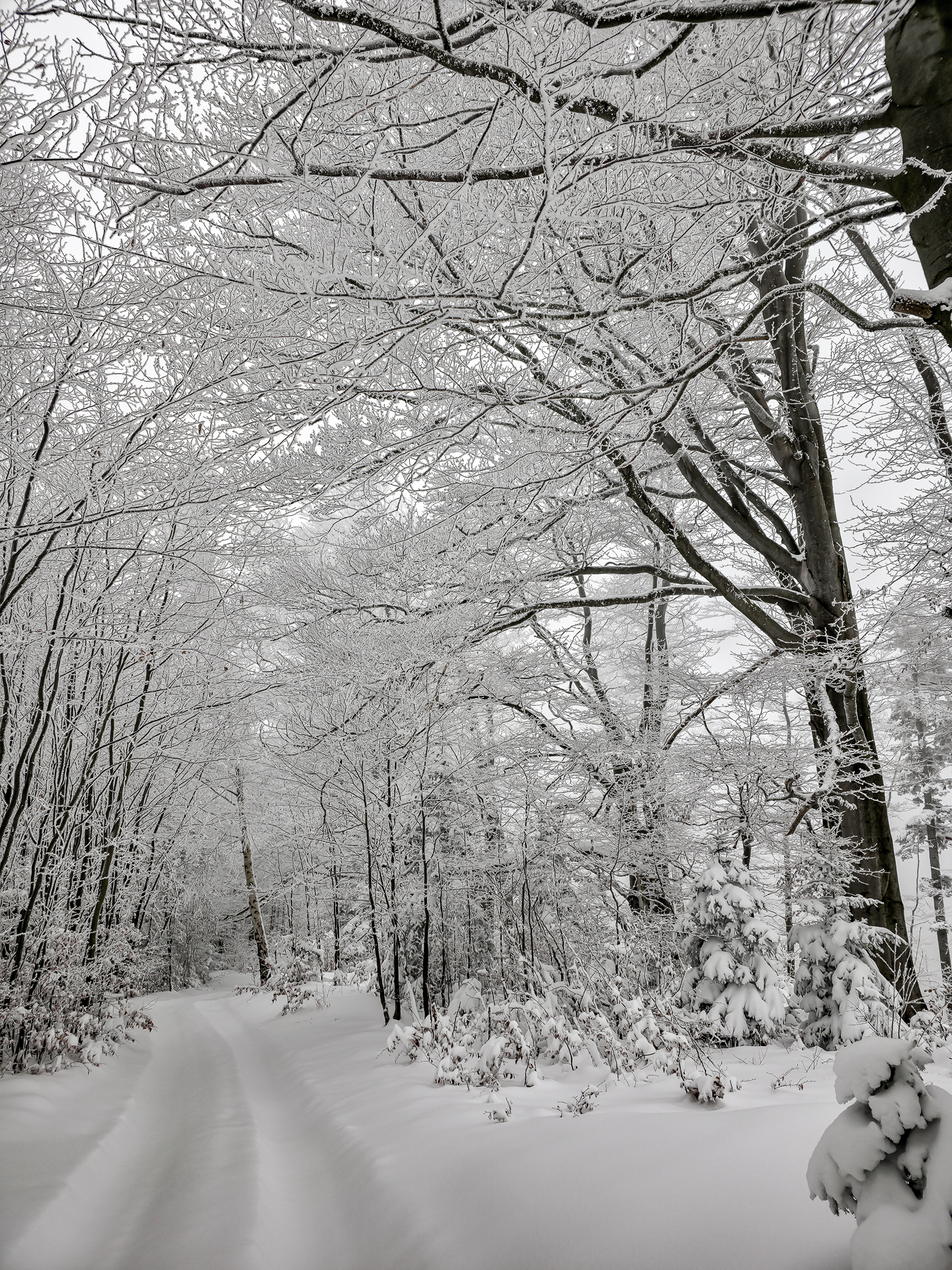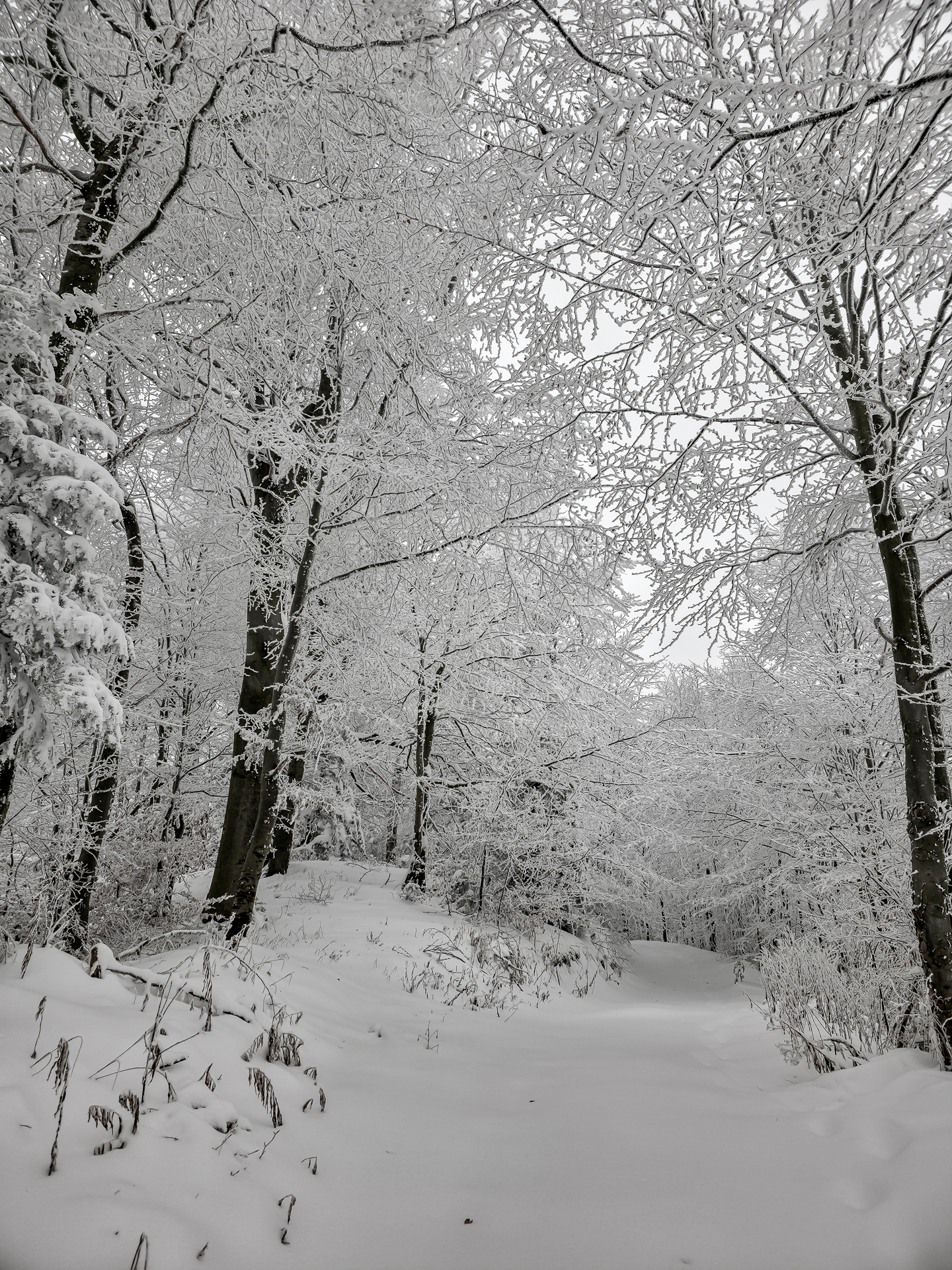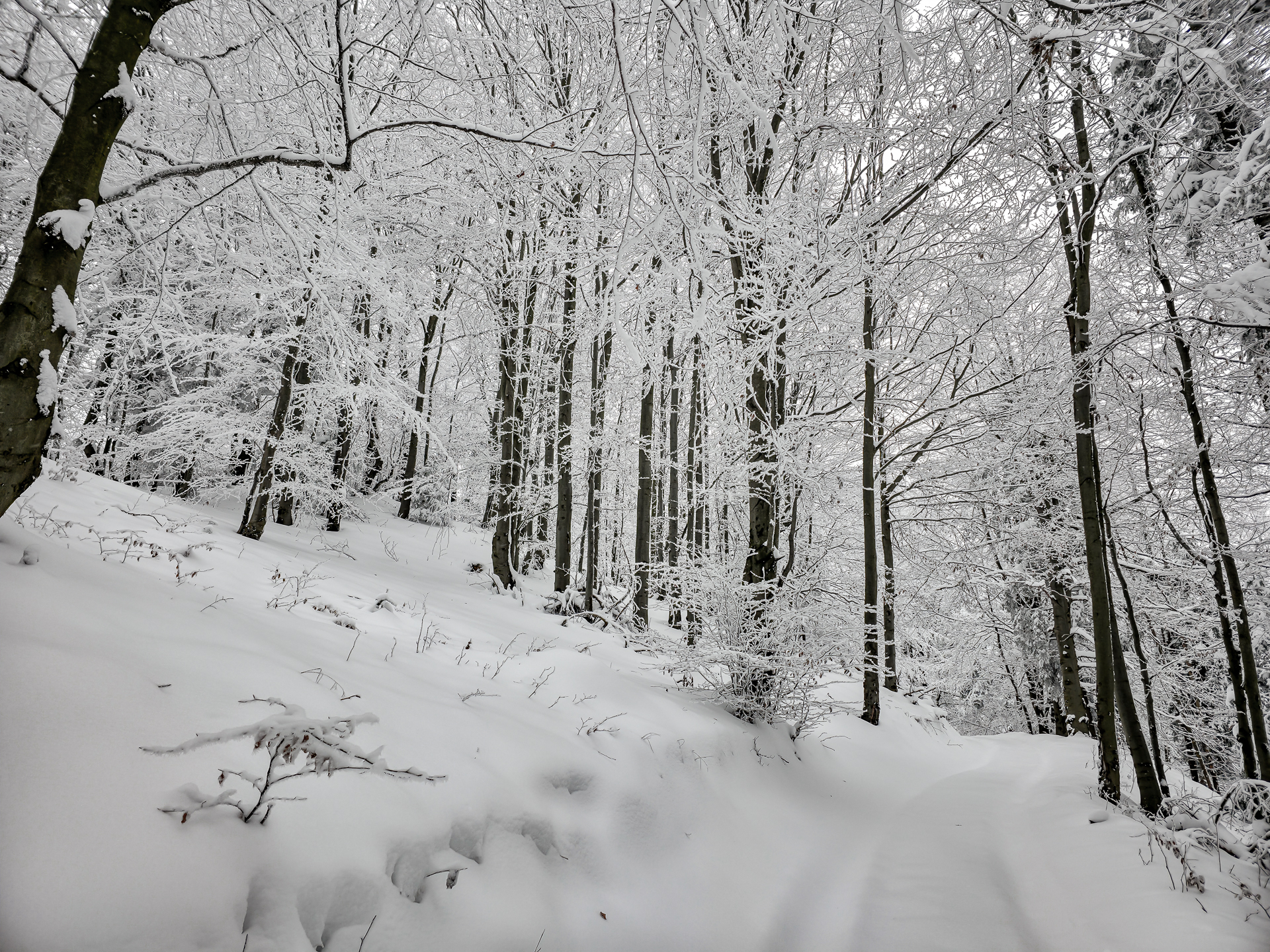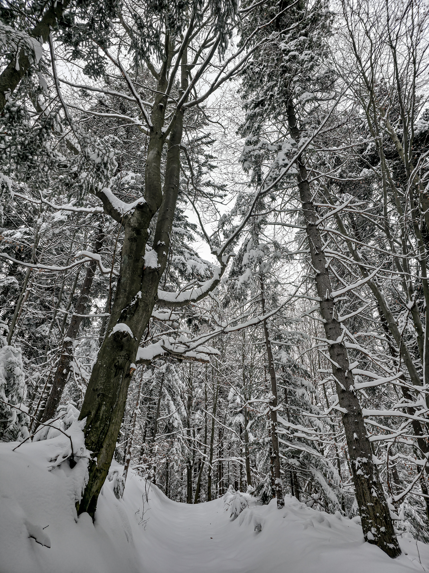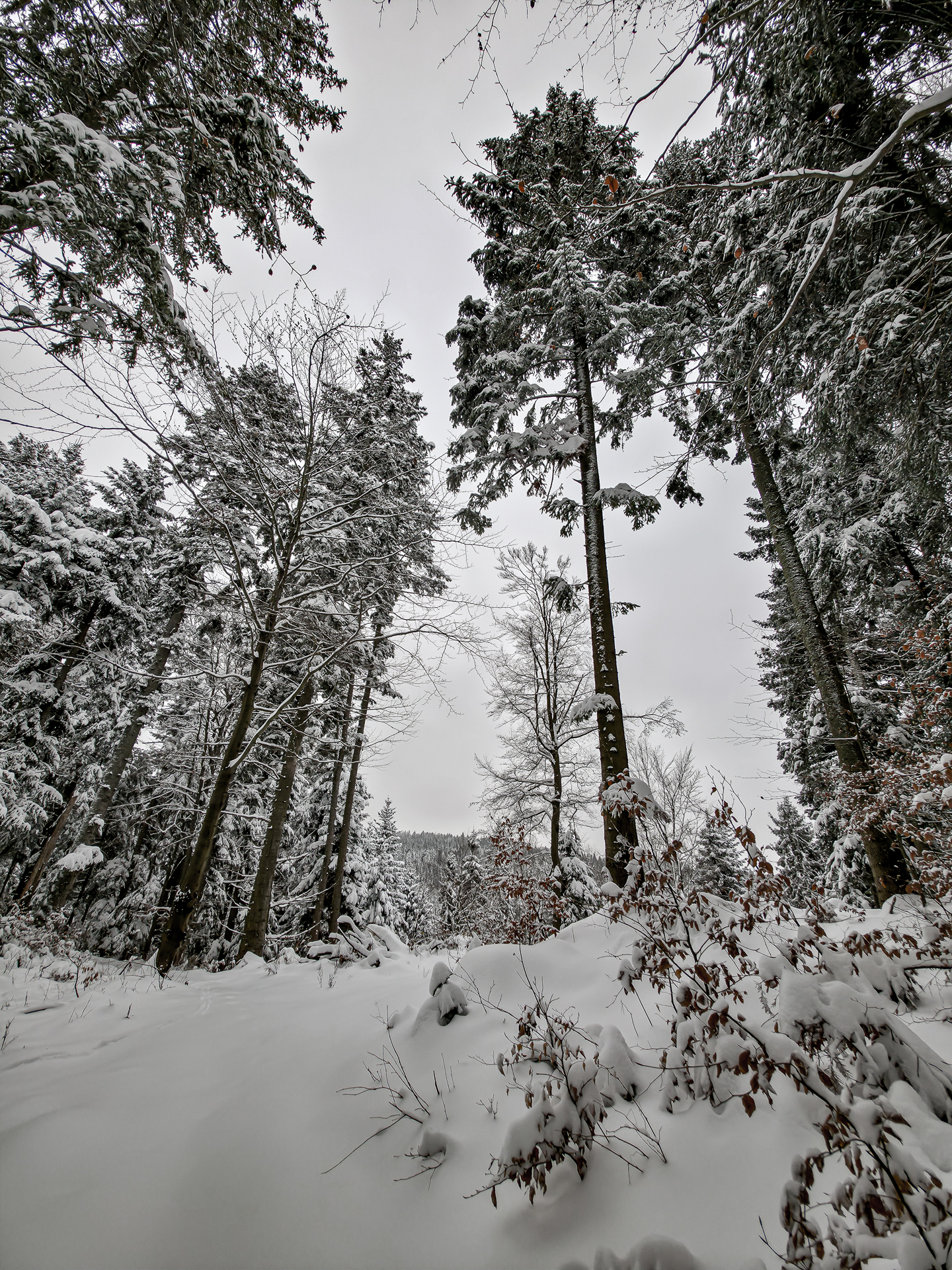 Najbardziej wyczerpujący i podnoszący ciśnienie fragment zaczyna się za przełęczą, tam gdzie zielony szlak przecina szeroką leśną drogę. Od tego miejsca czeka około 300 metrów naprawdę ostrej wspinaczki. Średnie nachylenie osiąga tu 30%, a miejscami podchodzi do 40%, więc nawet latem potrafi zmęczyć. W zimie to była już zupełnie inna liga: kamienie ukryte pod śniegiem ustępowały pod stopą, śnieg osypywał się przy każdym kroku, a każdy metr trzeba było dosłownie wypracować, mocno wbijając przednią część buta w zbocze pod odpowiednim kątem. Powoli, krok po kroku, kontrolując stabilność — bez miejsca na pośpiech i kontrolą pracy serca, żeby się nie przepompować. Te 300 metrów zajęło mi około 20 minut. Po dojściu do górnej części zbocza pozostało jeszcze około 600 metrów do skrzyżowania szlaków Kudów 1000 m n.p.m., ale i tu Polana Kudów nie odpuszczała: nachylenie szlaku na polanie wynosi około 30%.