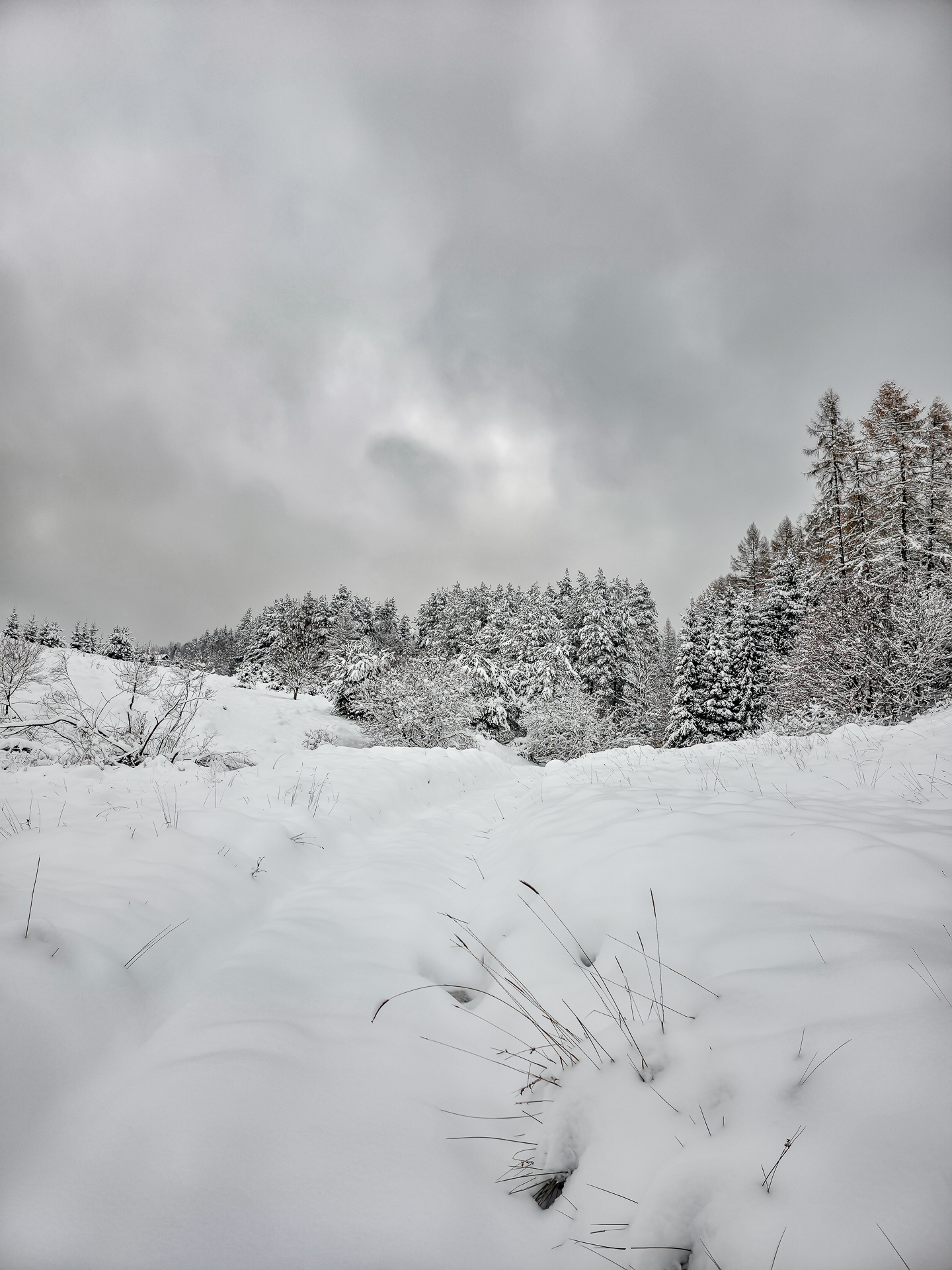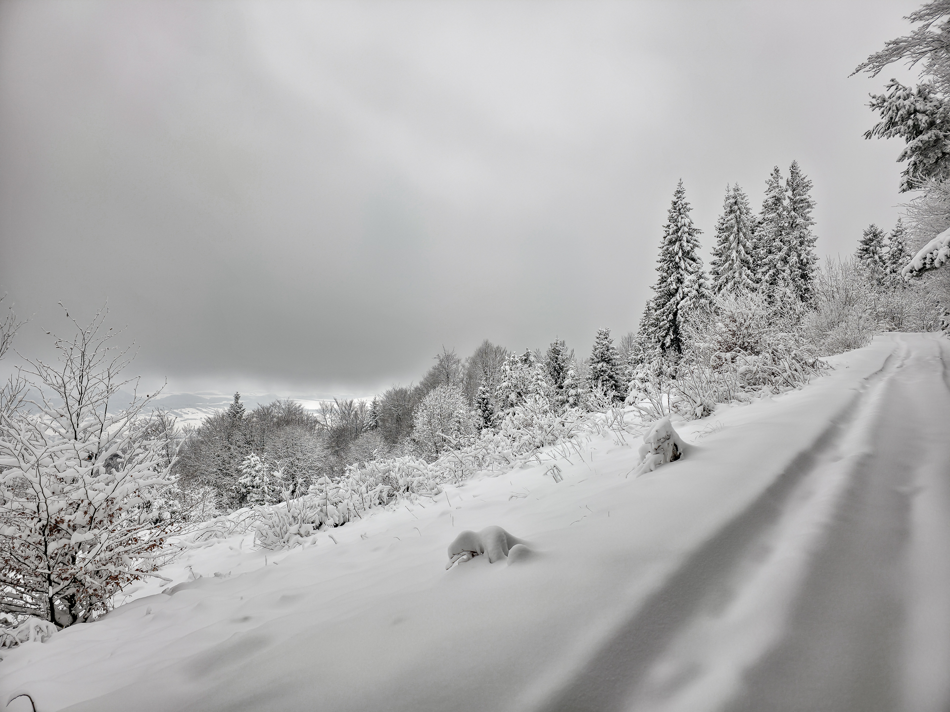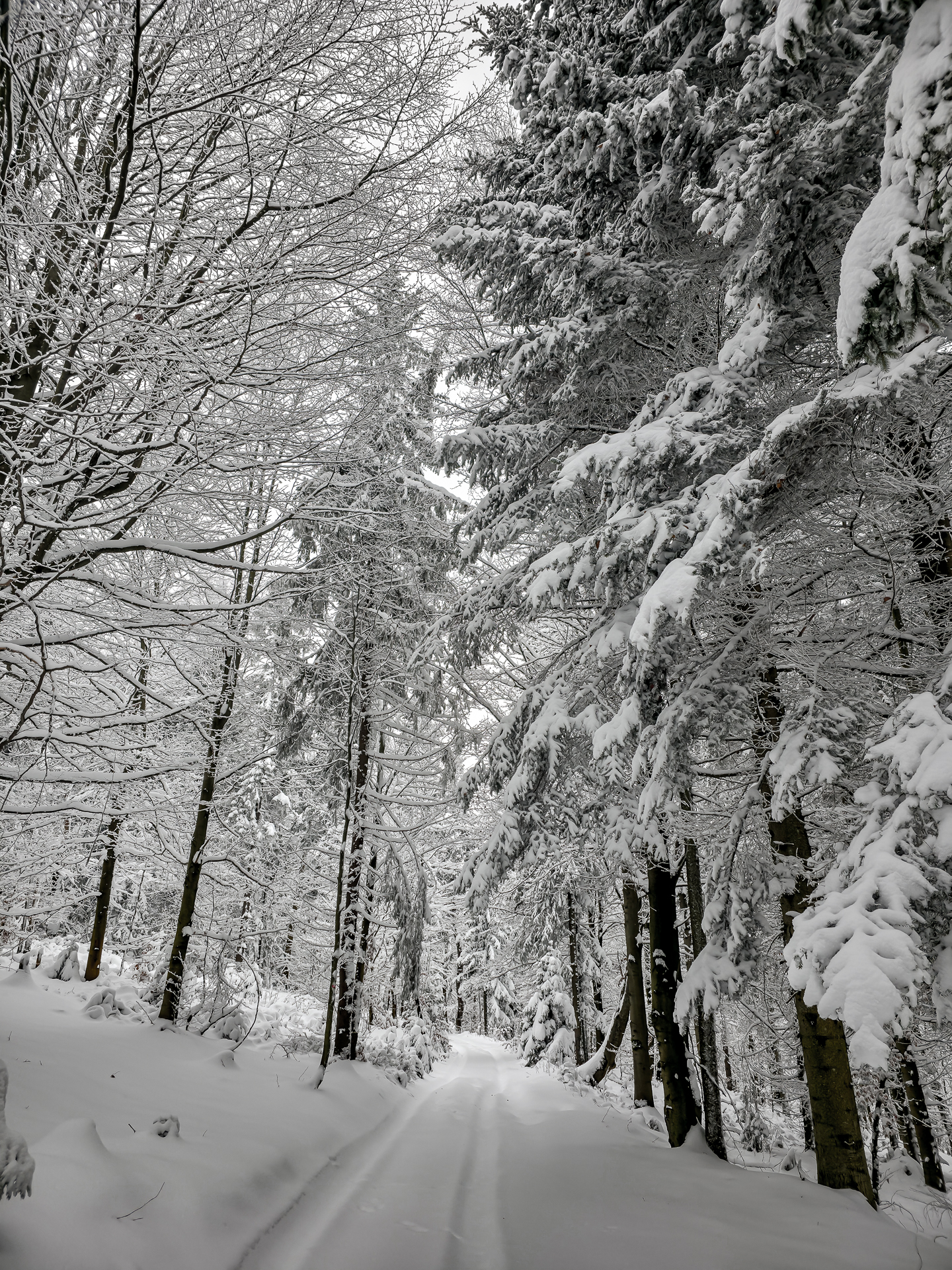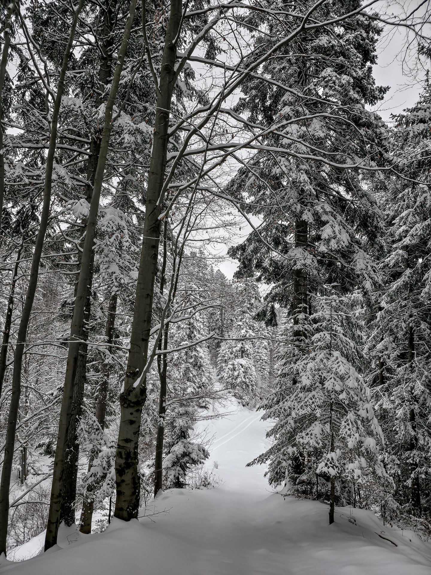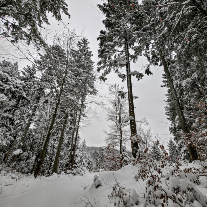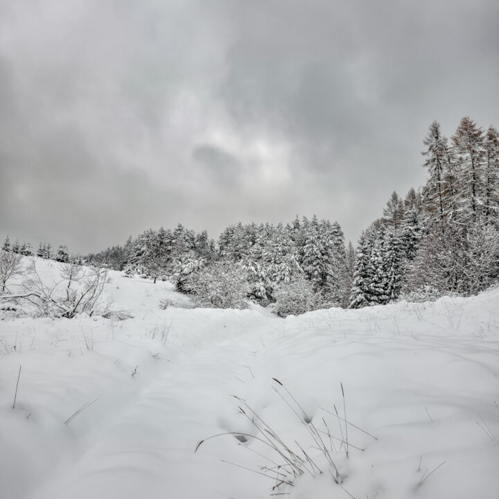 Najbardziej wyczerpujący i podnoszący ciśnienie fragment zaczyna się za przełęczą, tam gdzie zielony szlak przecina szeroką leśną drogę. Od tego miejsca czeka około 300 metrów naprawdę ostrej wspinaczki. Średnie nachylenie osiąga tu 30%, a miejscami podchodzi do 40%, więc nawet latem potrafi zmęczyć. W zimie to była już zupełnie inna liga: kamienie ukryte pod śniegiem ustępowały pod stopą, śnieg osypywał się przy każdym kroku, a każdy metr trzeba było dosłownie wypracować, mocno wbijając przednią część buta w zbocze pod odpowiednim kątem. Powoli, krok po kroku, kontrolując stabilność — bez miejsca na pośpiech i kontrolą pracy serca, żeby się nie przepompować. Te 300 metrów zajęło mi około 20 minut. Po dojściu do górnej części zbocza pozostało jeszcze około 600 metrów do skrzyżowania szlaków Kudów 1000 m n.p.m., ale i tu Polana Kudów nie odpuszczała: nachylenie szlaku na polanie wynosi około 30%.