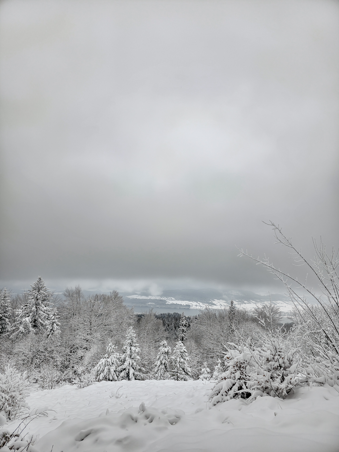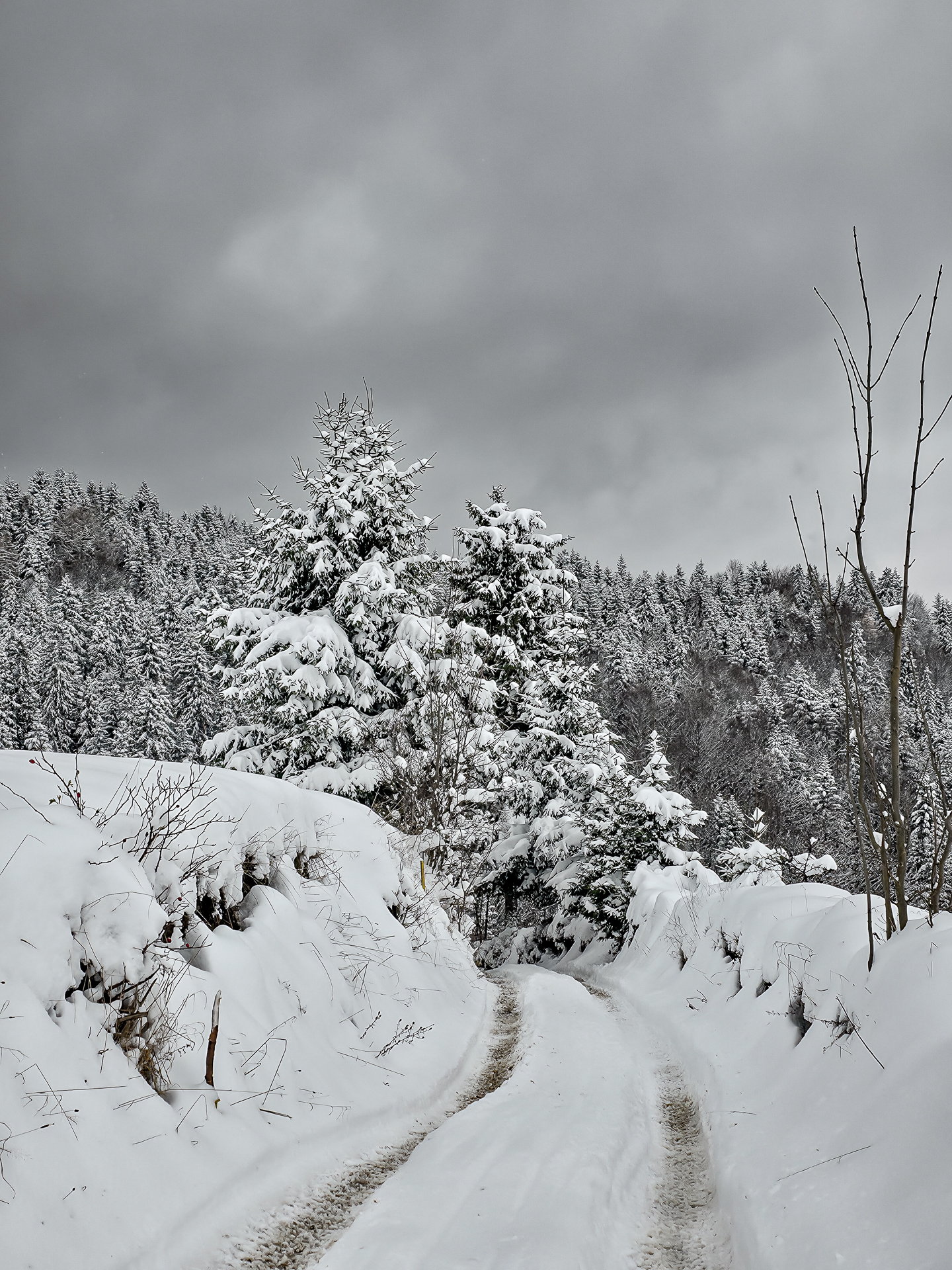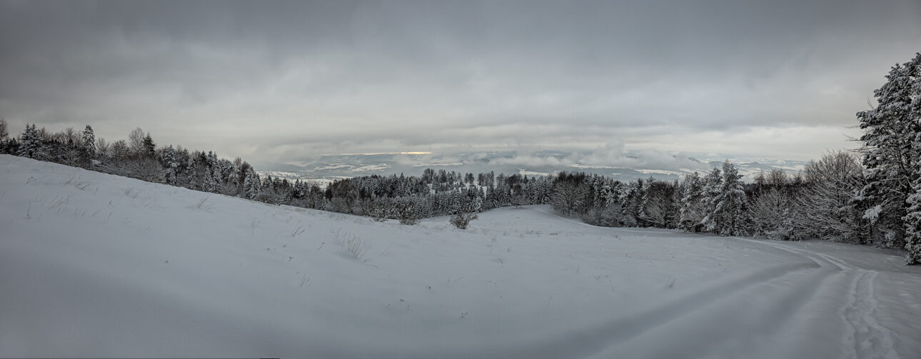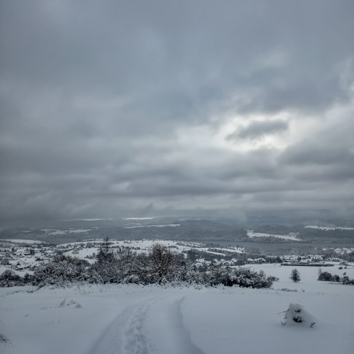 Po dotarciu do linii lasu i wejściu na ostatnią polanę z widokiem na Jezioro Czorsztyńskie, kolejne 1,5 km to dwa bardziej strome podejścia i jedno zejście. W warunkach letnich nie wyróżniałyby się niczym szczególnym — typowe gorczańskie przewyższenia. Jednak przy mocno zasypanym szlaku każdy krok był spowalniany przez śnieg sięgający do łydek, a miejscami wyżej, co potrafiło solidnie wycisnąć pot.