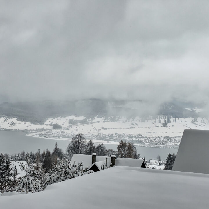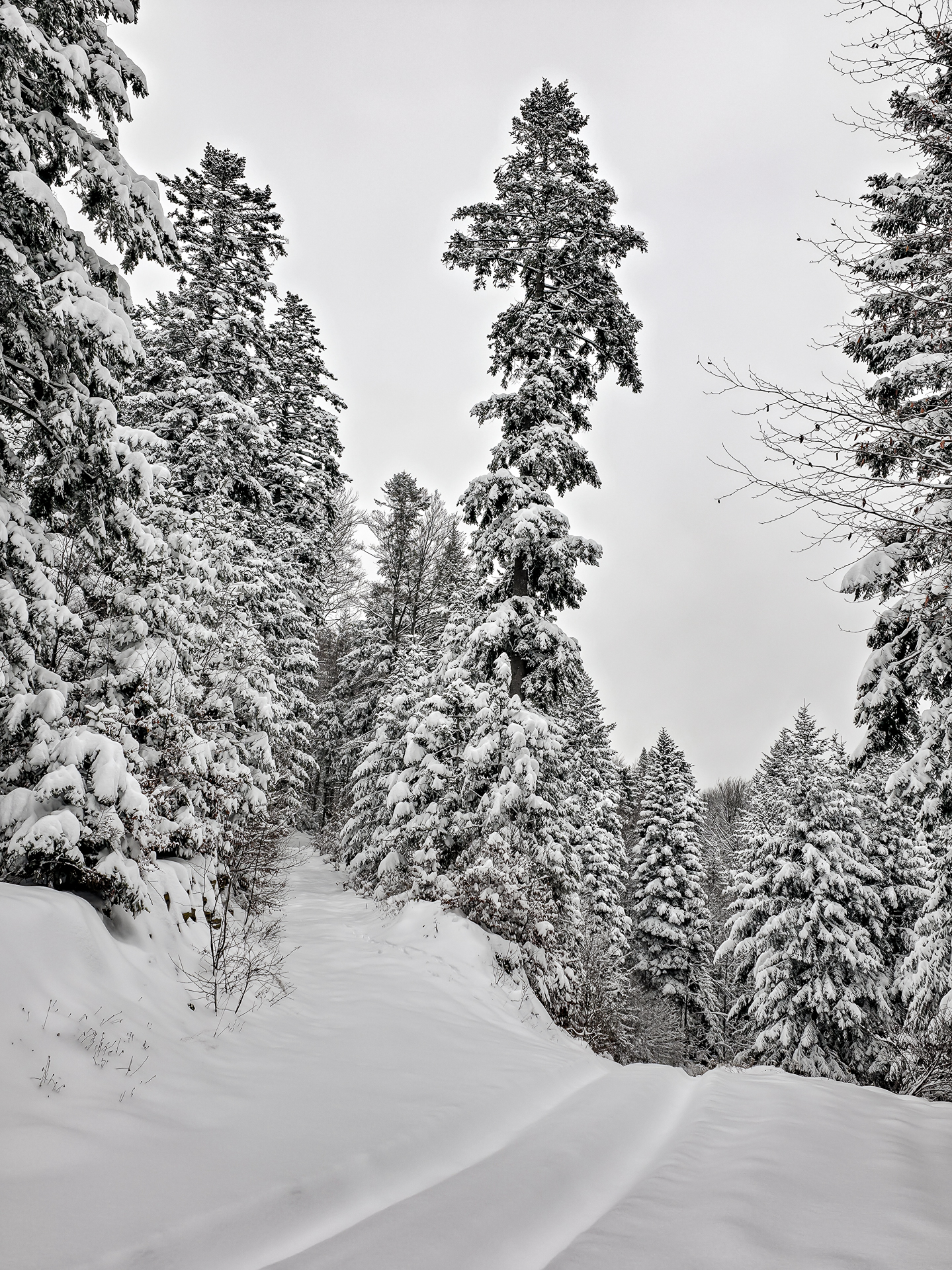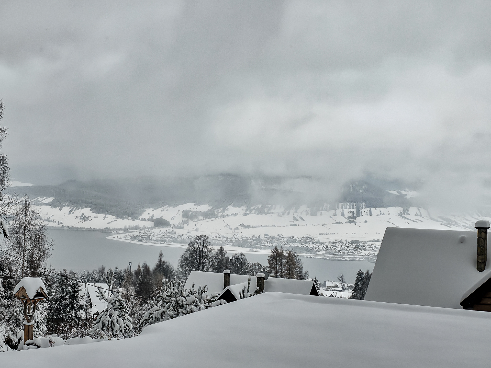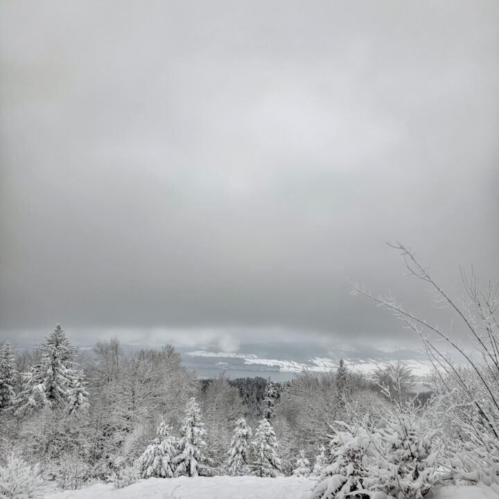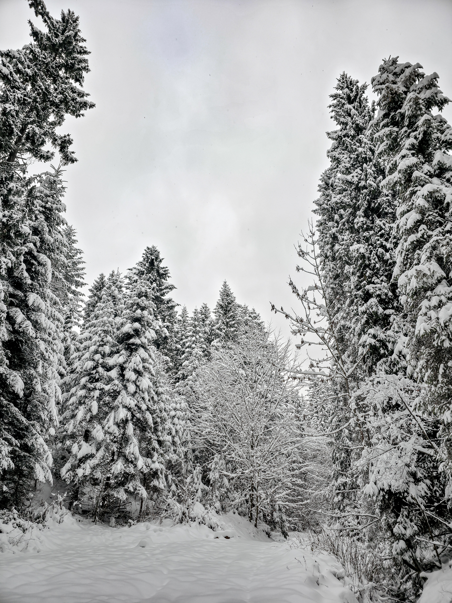 Po dotarciu do linii lasu i wejściu na ostatnią polanę z widokiem na Jezioro Czorsztyńskie, kolejne 1,5 km to dwa bardziej strome podejścia i jedno zejście. W warunkach letnich nie wyróżniałyby się niczym szczególnym — typowe gorczańskie przewyższenia. Jednak przy mocno zasypanym szlaku każdy krok był spowalniany przez śnieg sięgający do łydek, a miejscami wyżej, co potrafiło solidnie wycisnąć pot.