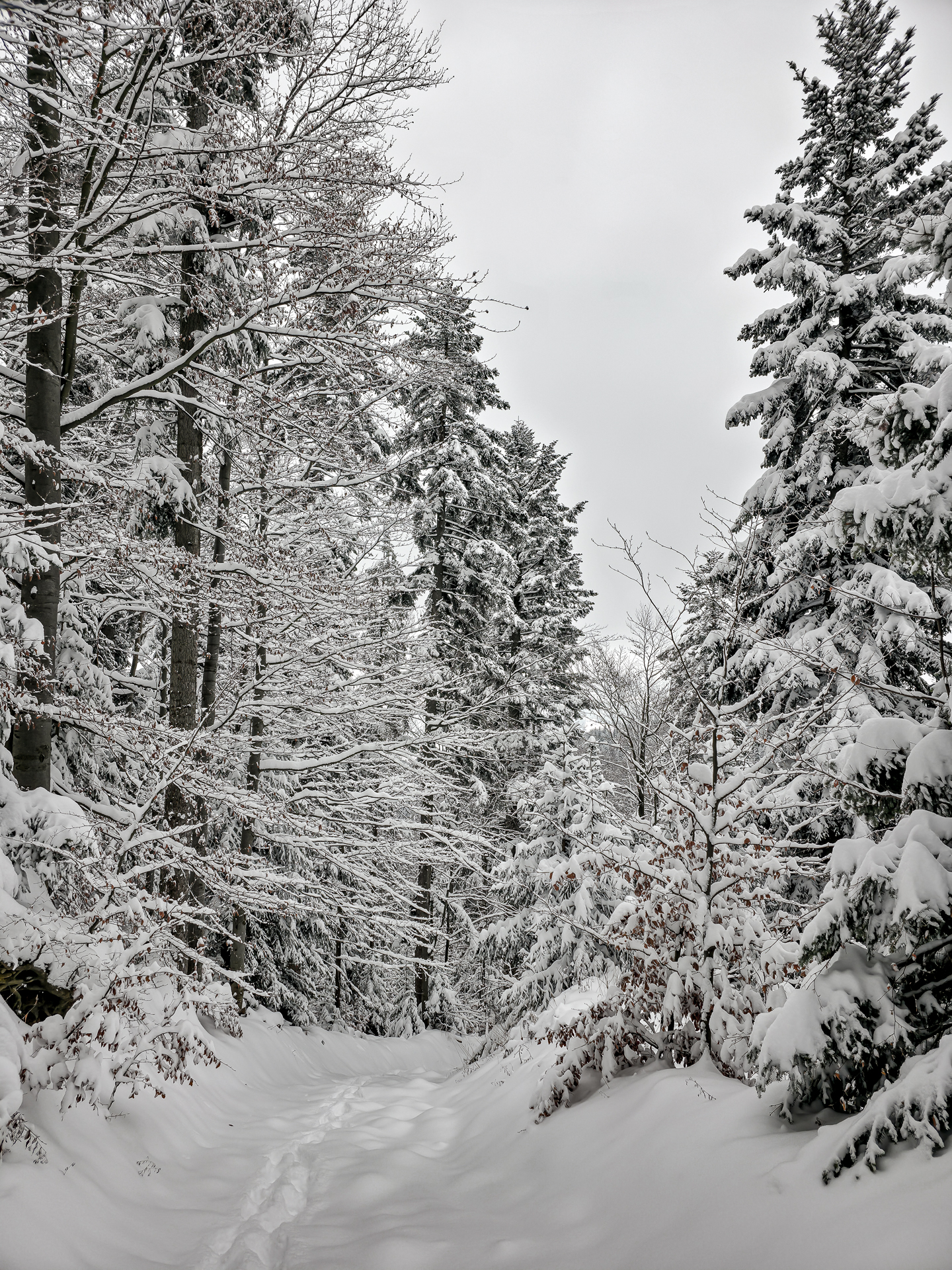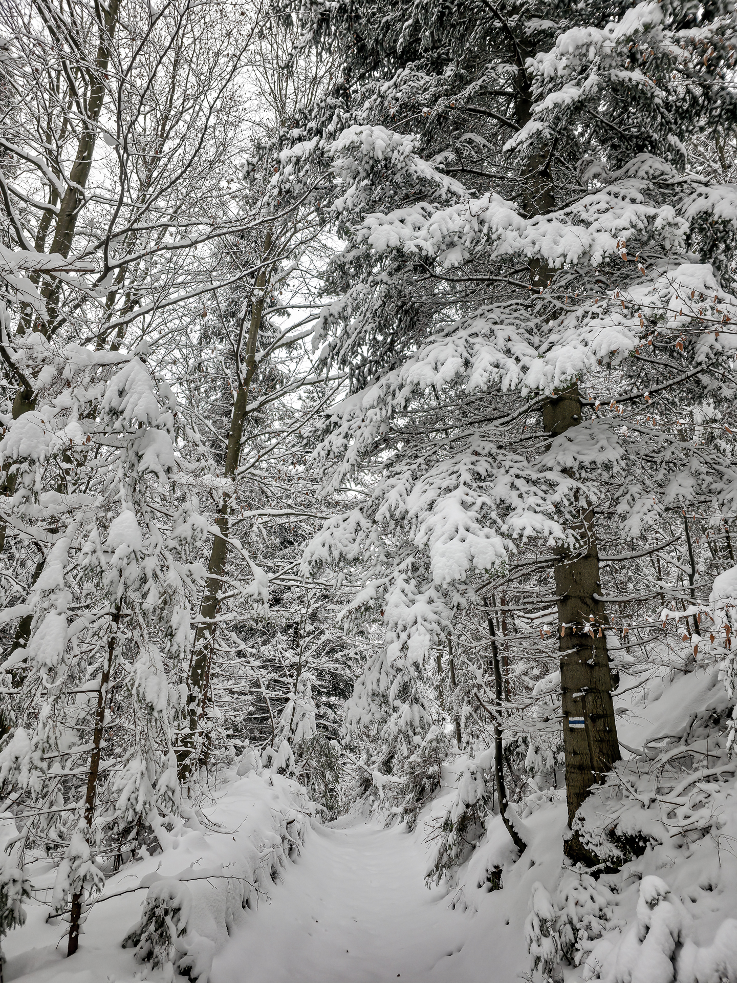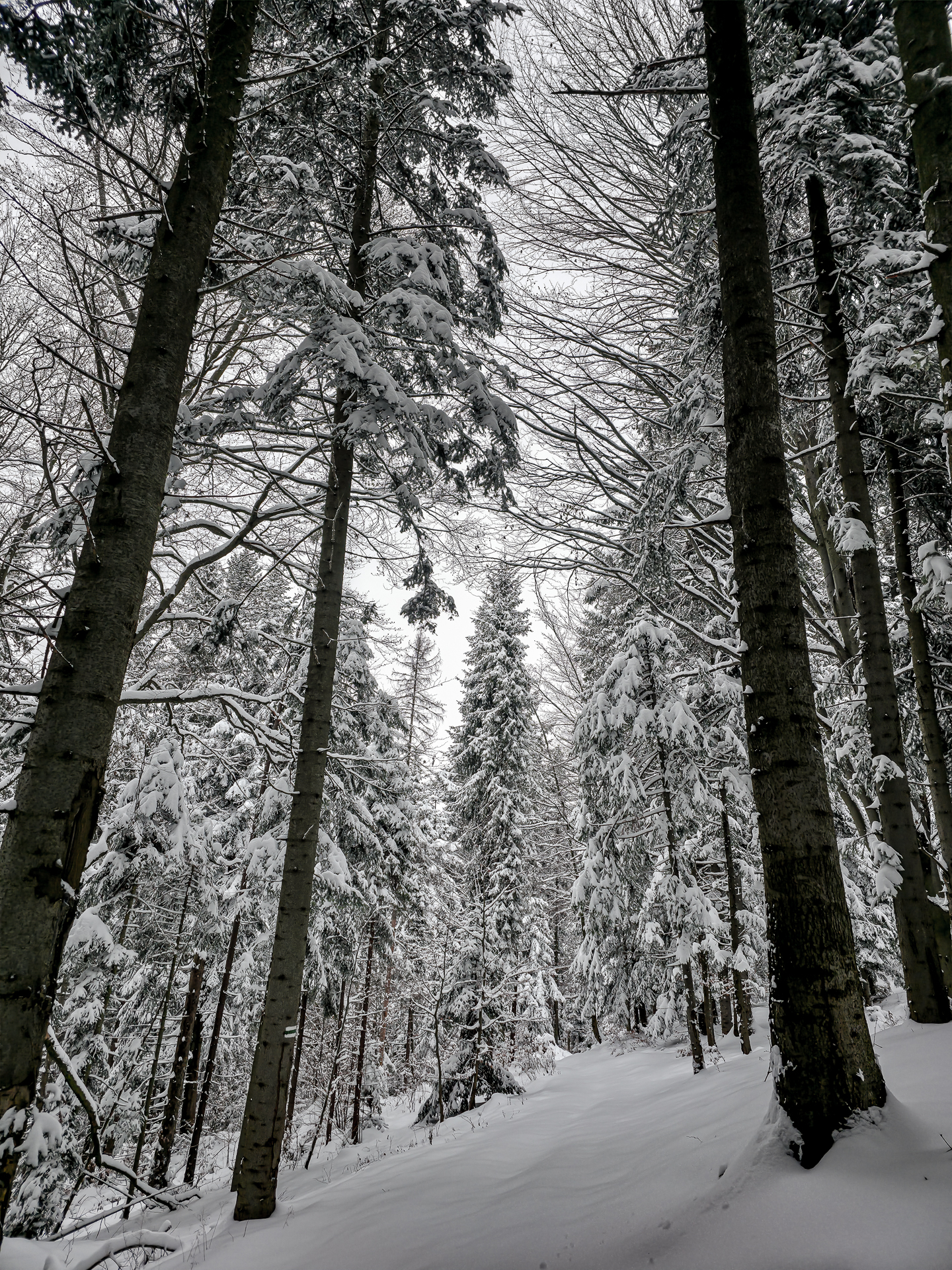 Bardzo liczyłem, że czerwony szlak biegnący grzbietem Pasma Lubania będzie przetarty. Po pięciu kilometrach brnięcia w śniegu miałem nadzieję, że na grzbiecie wreszcie będzie lżej — ale nic z tego. Co chwilę trafiałem na ukryte pod śniegiem, lekko zamarznięte kałuże, więc cały czas trzeba było uważać na mokrą niespodziankę pod stopą. Dopiero gdy teren przestał się stromo wznosić, szlak zaczął delikatnie falować i marsz stał się odrobinę przyjemniejszy.