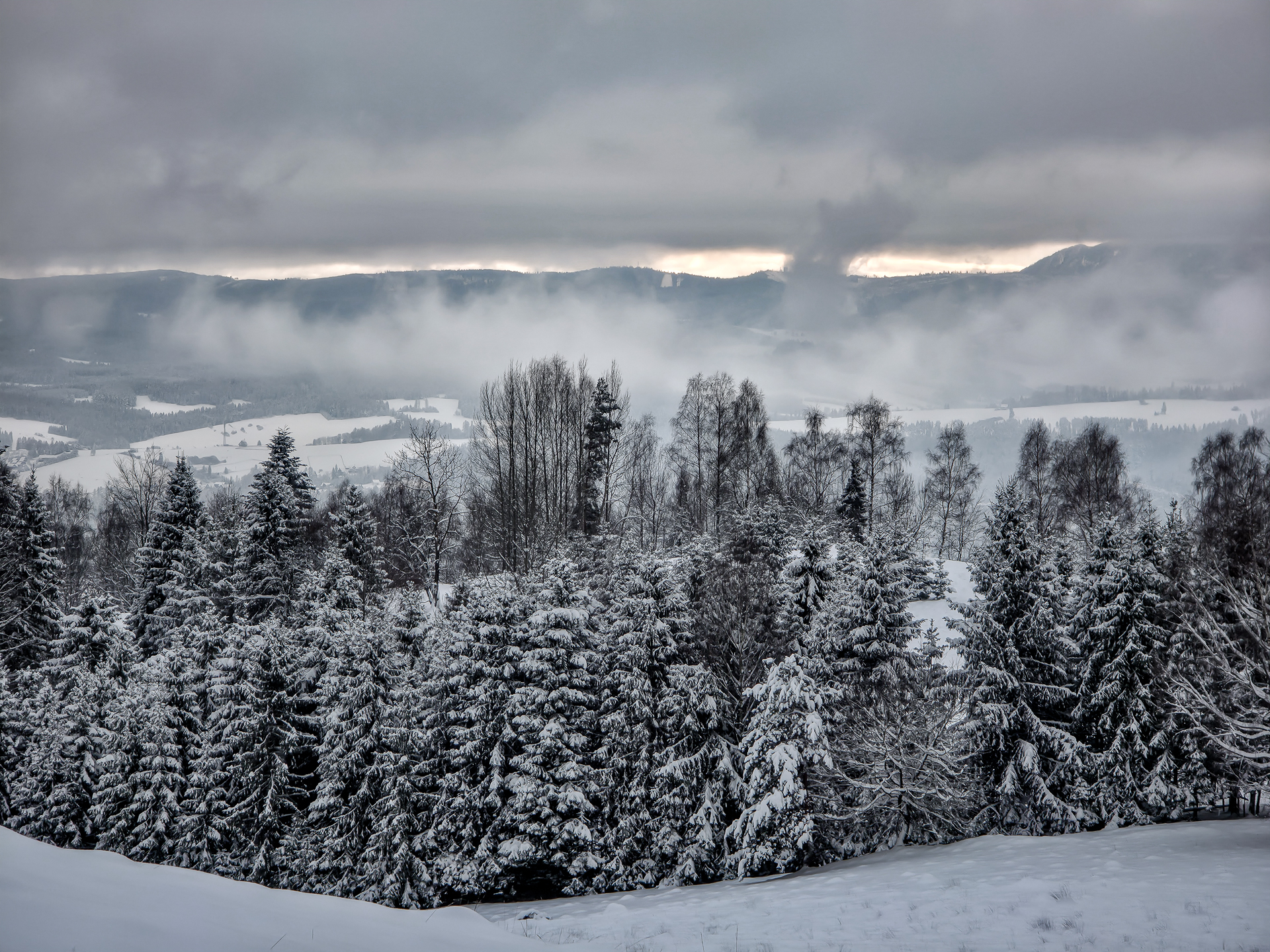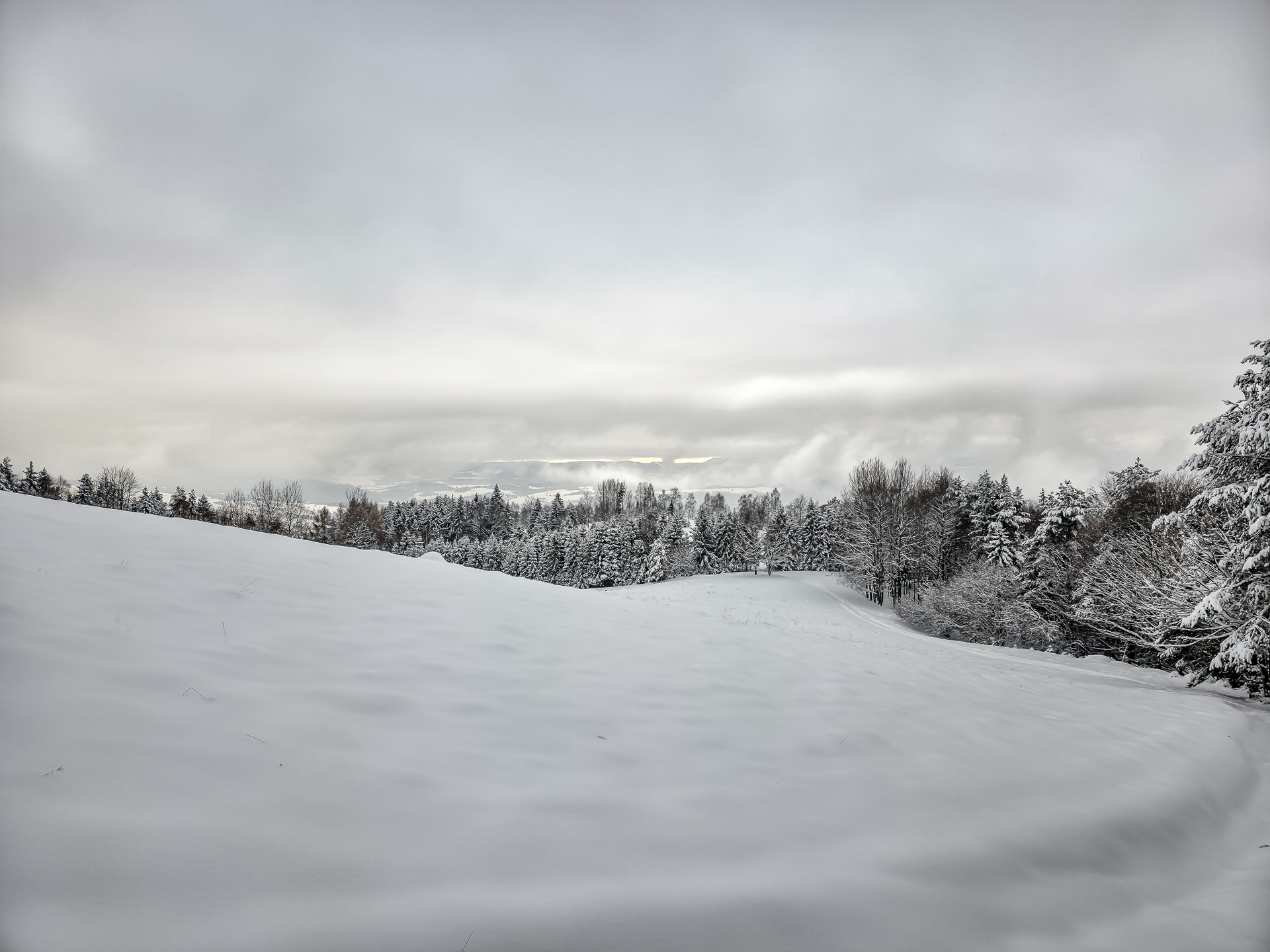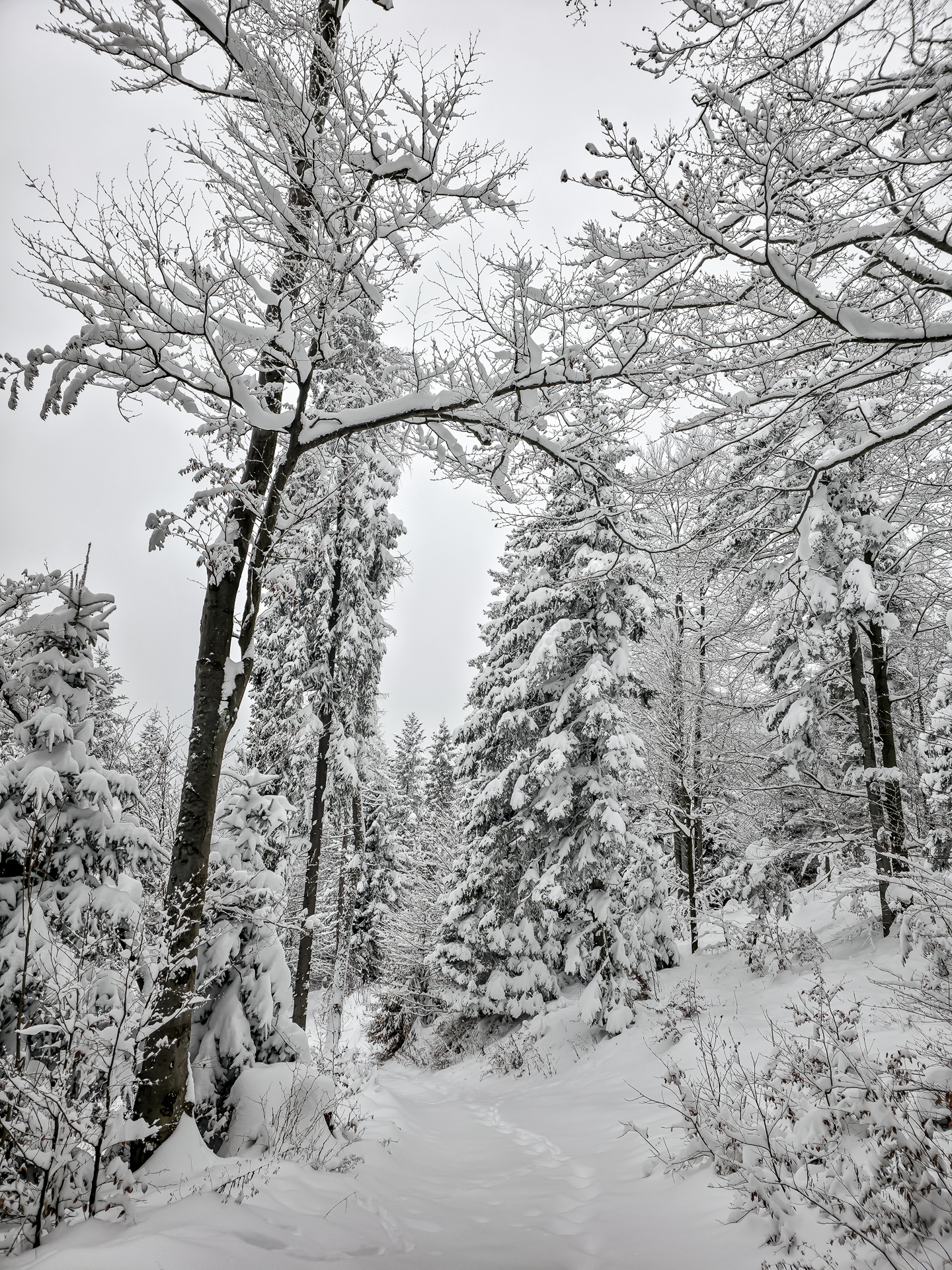 Bardzo liczyłem, że czerwony szlak biegnący grzbietem Pasma Lubania będzie przetarty. Po pięciu kilometrach brnięcia w śniegu miałem nadzieję, że na grzbiecie wreszcie będzie lżej — ale nic z tego. Co chwilę trafiałem na ukryte pod śniegiem, lekko zamarznięte kałuże, więc cały czas trzeba było uważać na mokrą niespodziankę pod stopą. Dopiero gdy teren przestał się stromo wznosić, szlak zaczął delikatnie falować i marsz stał się odrobinę przyjemniejszy.