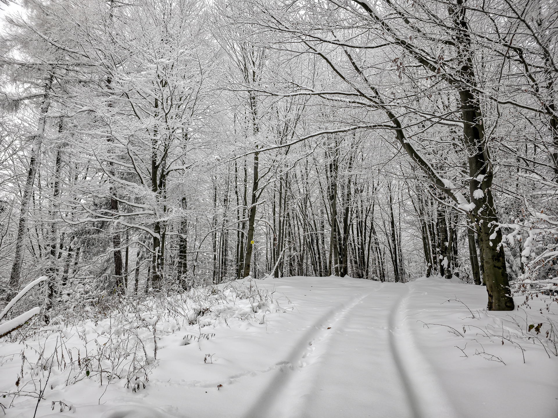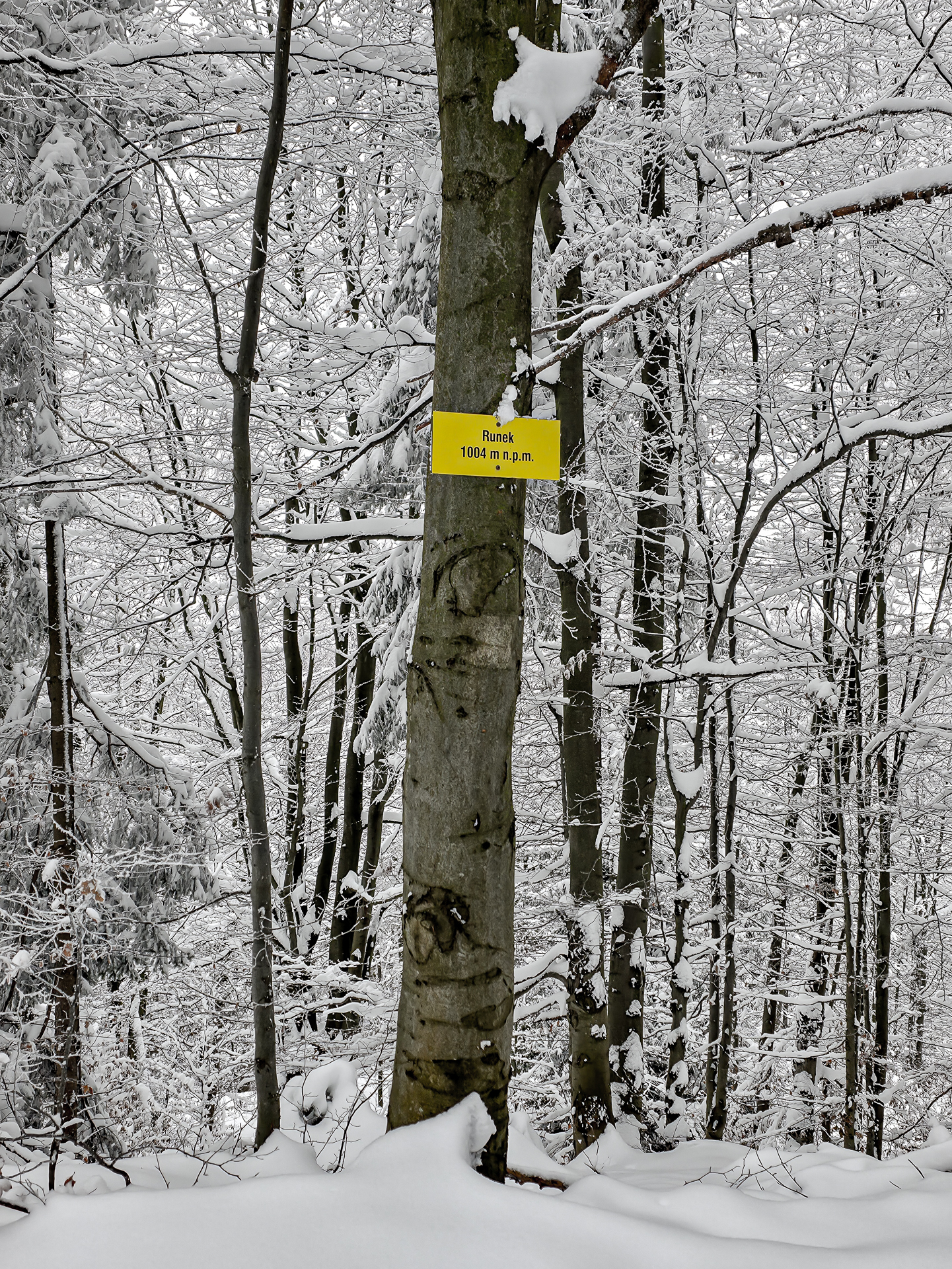 Zrobiłem krótką przerwę: przycupnąłem na chwilę, bo w okolicy nie ma żadnego miejsca, żeby wygodnie usiąść — ani ławki, ani pieńka, ani odsłoniętego kamienia. Napiłem się gorącej herbaty, zjadłem drugie śniadanie, ale po kilku minutach i tak zaczynałem się wyraźnie wychładzać pomimo założonej wcześniej lekkiej puchówki postojowej. W środku lasu panowała wilgotna, gęsta zimowa aura, a temperaturę odczuwało się zupełnie inaczej niż w dolinie, więc postój nie mógł trwać długo. Runek to szczyt „bez szczytowania”, więc szybko ruszyłem dalej.