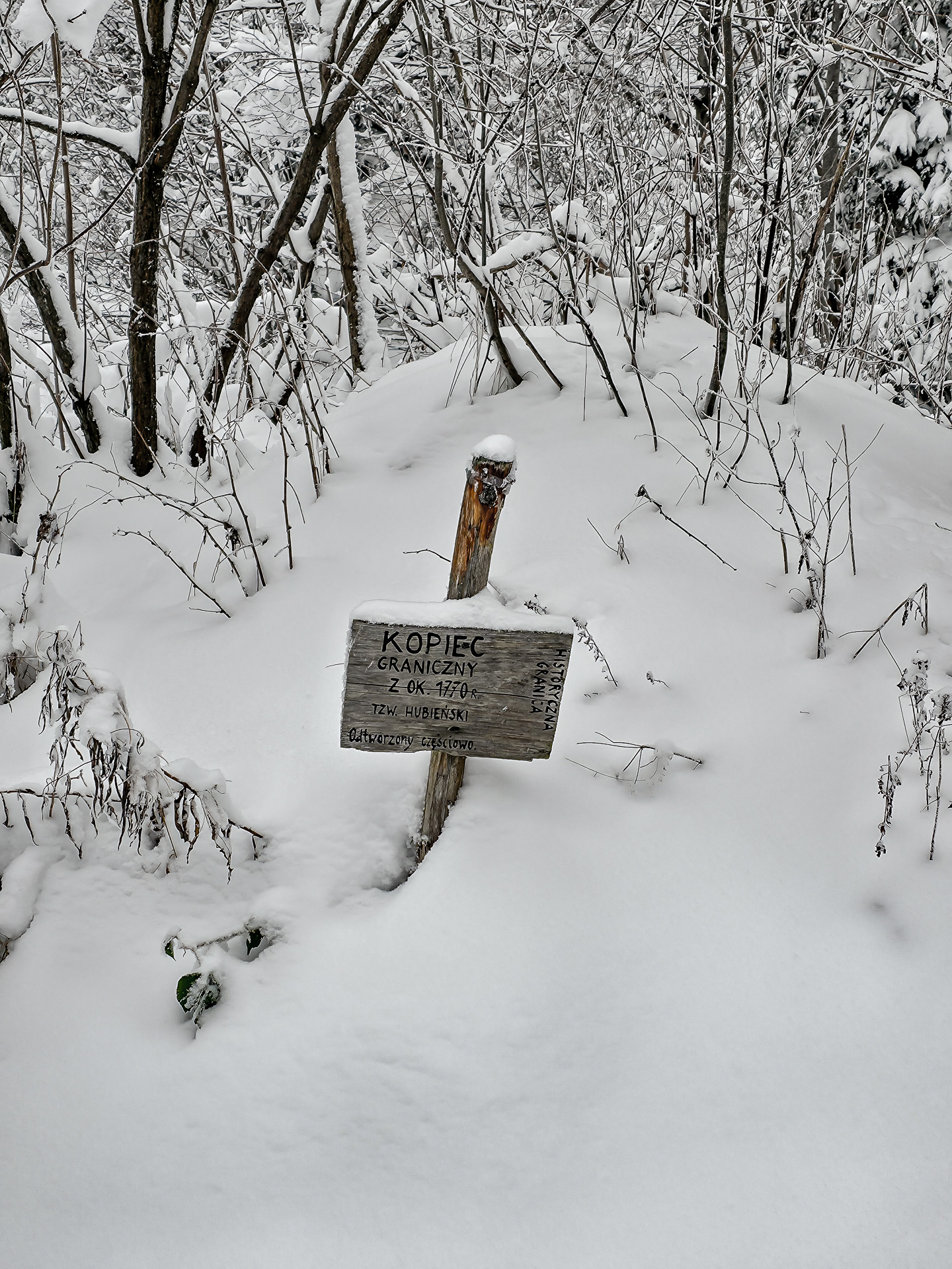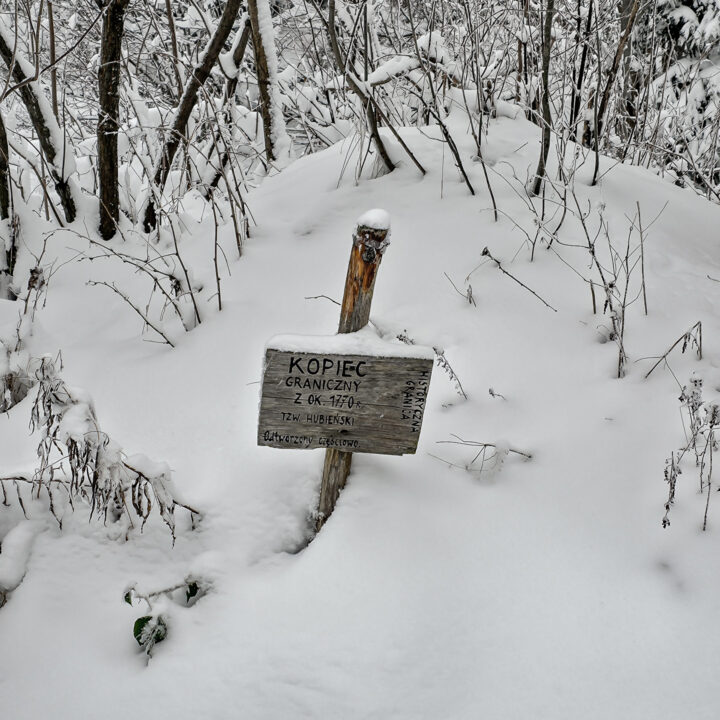 Kolejne 2,6 kilometra prowadziły cały czas przez las, a szlak nadal delikatnie falował góra–dół, coraz częściej z tendencją „w dół”. To był prosty, ale mało atrakcyjny odcinek — bez widoków i bez szczytów po drodze. Dopiero na niewielkiej przełęczy Pod Kotelnicą można zobaczyć częściowo odtworzony kopiec graniczny. To tzw. Hubieński Kopiec, który wyznaczał fragment dawnej granicy polsko-węgierskiej (później polsko-austriackiej) sprzed I rozbioru, poprowadzonej w latach 1769–1770 grzbietem Gorców po zajęciu przez Austrię południowych terenów starostw czorsztyńskiego i nowotarskiego.