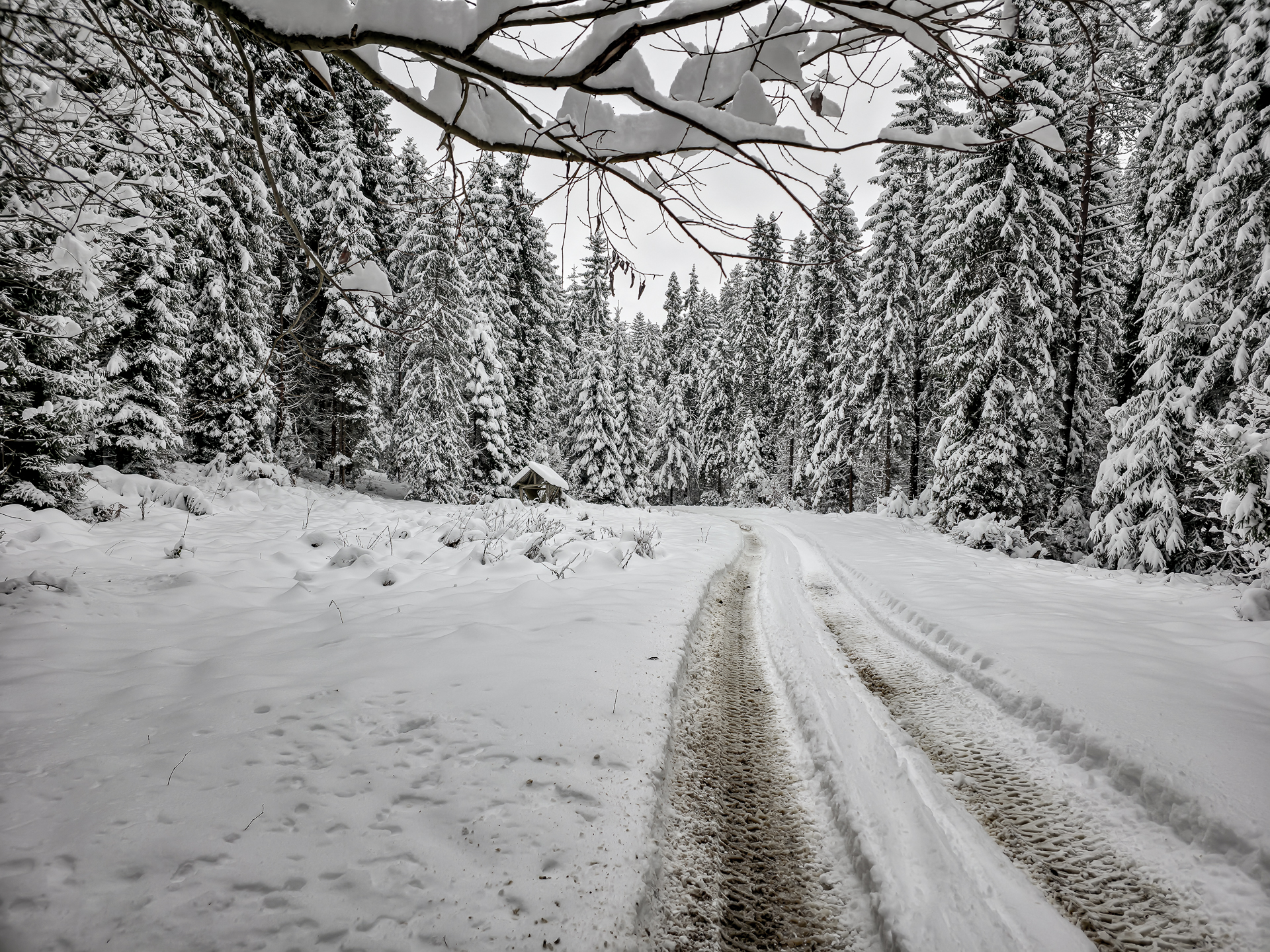 Za ostatnimi domami panorama na Jezioro Czorsztyńskie pojawiła się jeszcze na krótką chwilę, po czym szlak ponownie wszedł w las — i praktycznie aż do Maniów już z niego nie wyszedł. To około pięciokilometrowy, mozolny odcinek powrotny: najpierw lekko w górę, potem w dół szerokim, rozjeżdżonym przez jeepy i quady duktem. Tego dnia był on mieszanką wszystkiego, co najgorsze: głębokie bruzdy, śnieg, lód, błoto i woda.