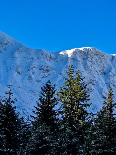 Widoki znad Stawu Smreczyńskiego nie są szerokie ani panoramiczne w klasycznym tatrzańskim sensie. To miejsce działa inaczej. Staw jest otoczony lasem, więc krajobraz nie otwiera się tu we wszystkich kierunkach, ale właśnie to nadaje mu charakter. Nad taflą wody wyrasta przede wszystkim masyw Bystrej — najwyższego szczytu Tatr Zachodnich — a w tle dobrze widać też surowsze otoczenie górne części doliny — grań Ornaków.