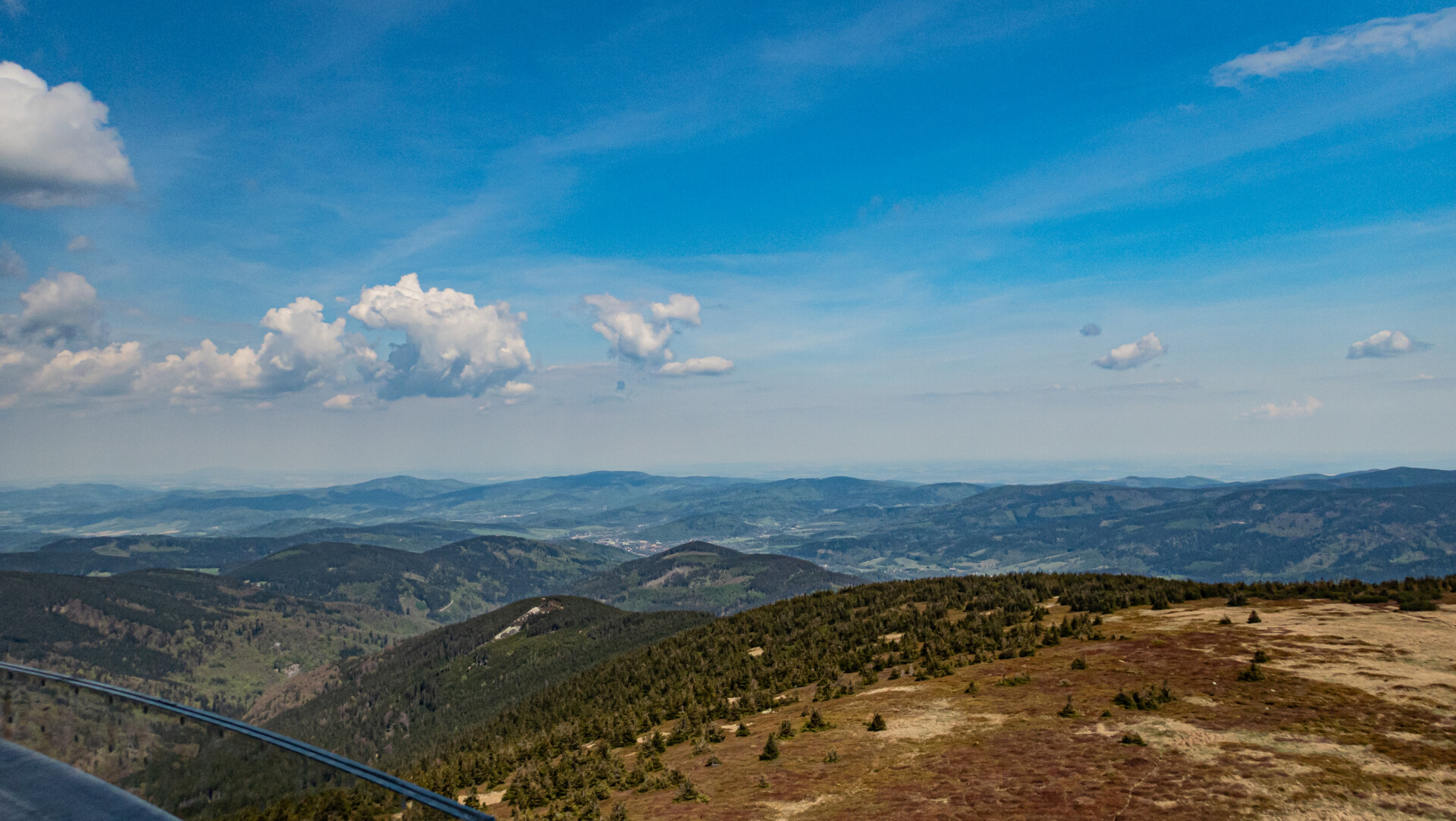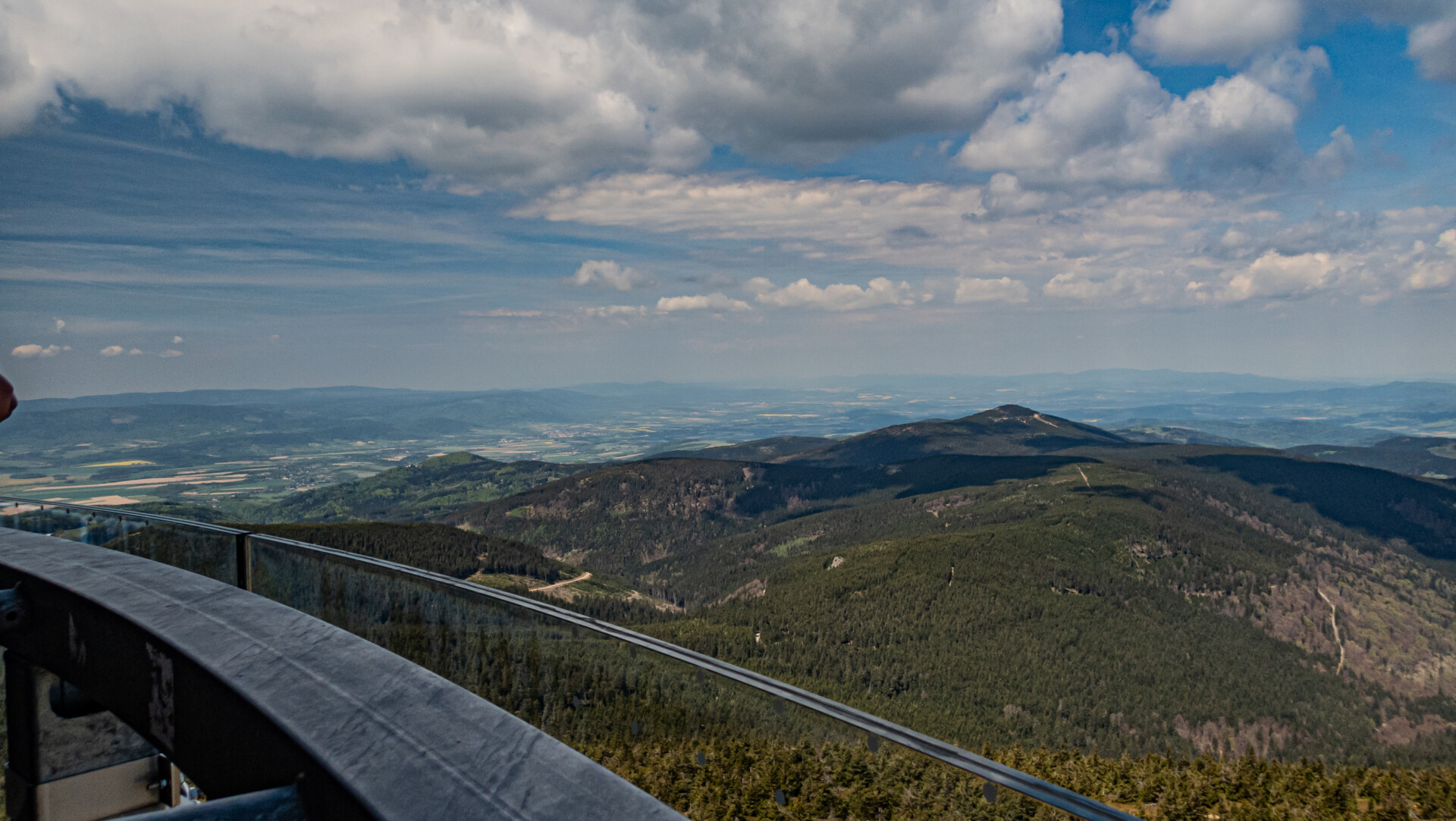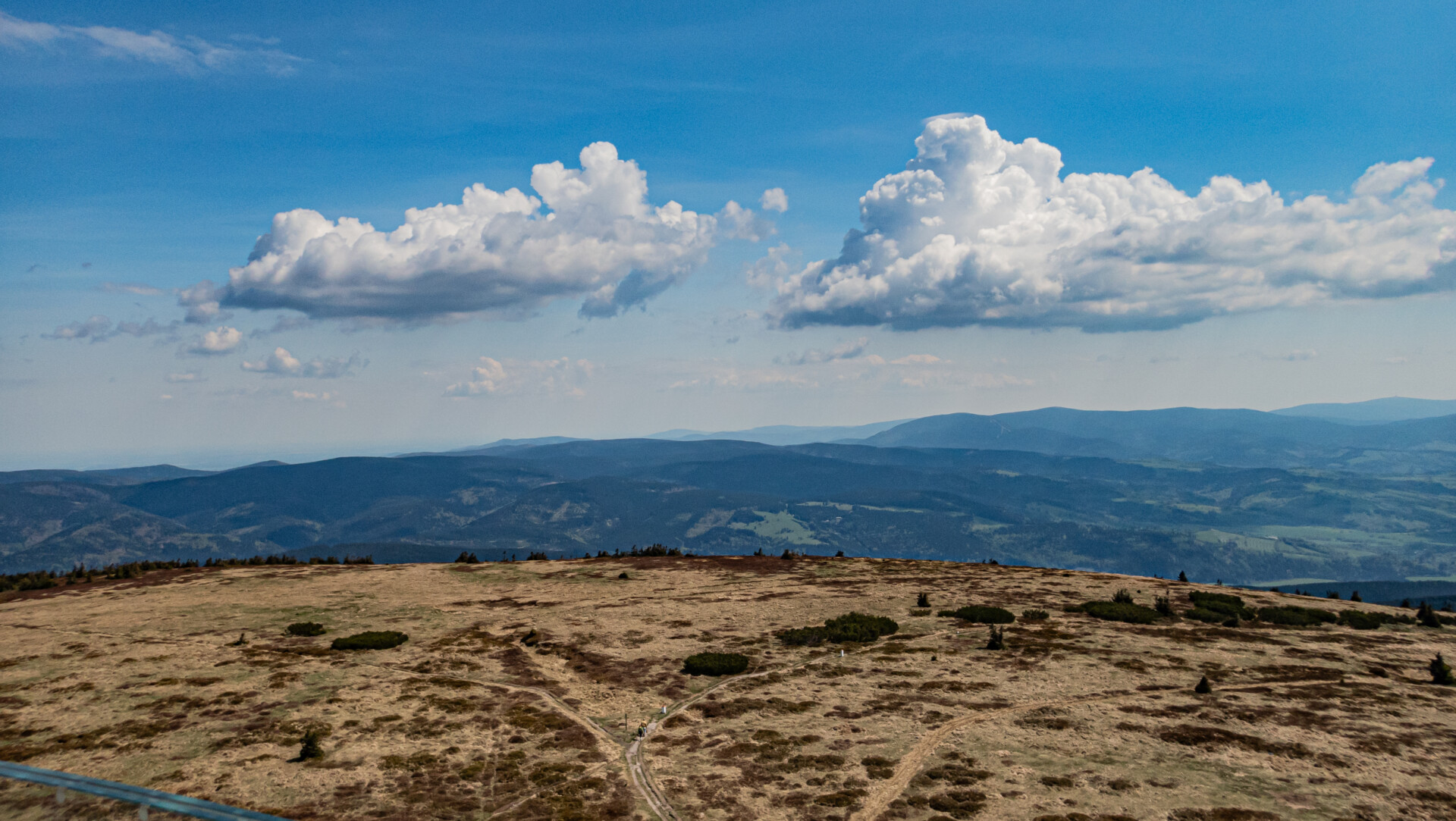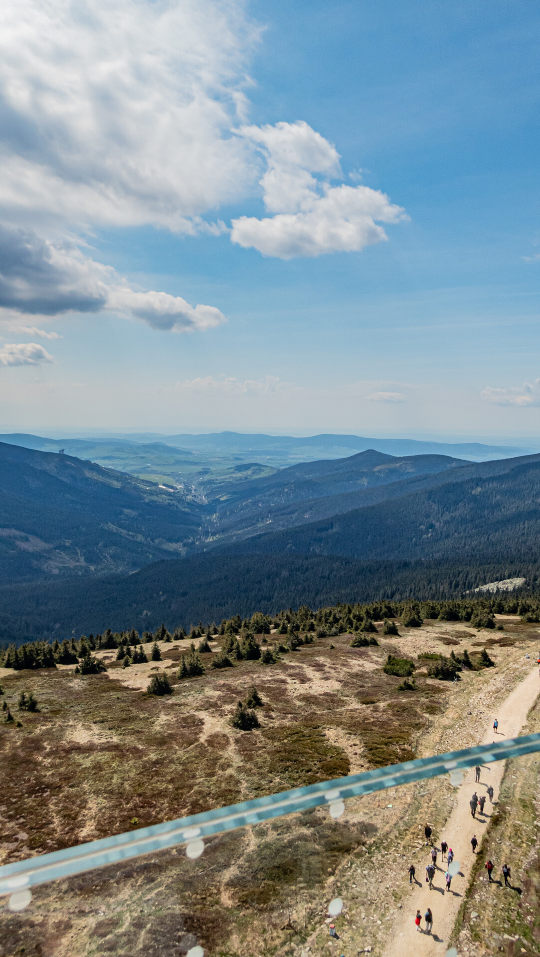 Na Śnieżnik warto wejść przede wszystkim dla finału, który naprawdę robi wrażenie. To nie jest szczyt z przypadkowym „oknem widokowym” między drzewami, tylko ogromna, otwarta kopuła, z której panorama dosłownie rozlewa się na wszystkie strony. Już samo wyjście z lasu w tę szeroką, odsłoniętą przestrzeń daje poczucie, że wchodzi się na górę dużego formatu, a stojąca na wierzchołku wieża widokowa tylko ten efekt wzmacnia. To właśnie tutaj widok staje się nagrodą samą w sobie — szeroką, daleką i naprawdę zapamiętywalną.