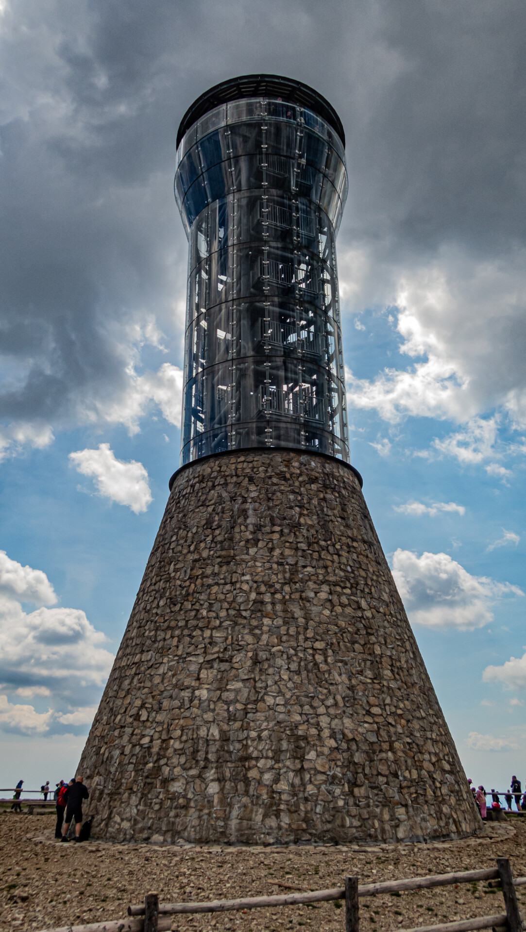 Dzisiejsza wieża stoi dokładnie tam, gdzie kiedyś wznosiła się Kaiser-Wilhelm-Turm — niemiecka, neogotycka dominanta z końca XIX wieku, zbudowana jeszcze w czasach, gdy Śnieżnik nie był polskim szczytem. Współczesny obiekt jest jej całkowitym przeciwieństwem: stalowy, nowoczesny, surowy w formie, wysoki na 34,16 m, z platformą widokową niemal 30 metrów nad ziemią. Na górę prowadzi blisko 200 stopni, a sama konstrukcja wygląda tak nietypowo, że od początku jednych zachwyca, a innych prowokuje do porównań z gigantycznym blenderem. Trudno jednak odmówić jej jednego: na tle polskich gór to konstrukcja absolutnie nie do pomylenia z żadną inną.